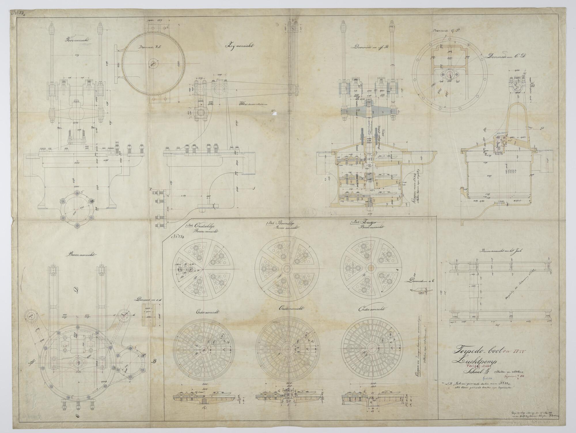 Tekening van een luchtpomp voor aan boord van spartorpedoboot Zr.Ms. II en V (schaal 1:4).