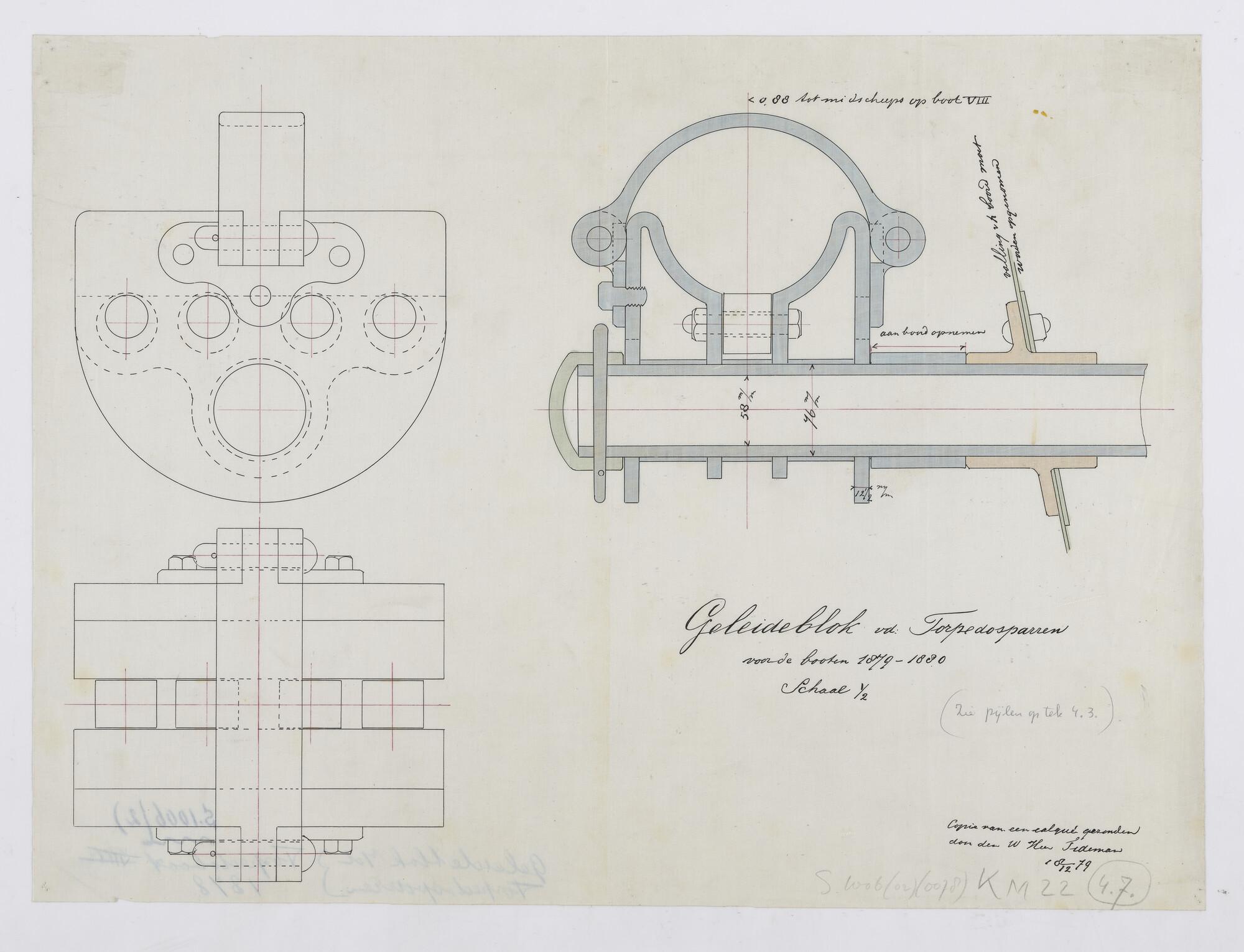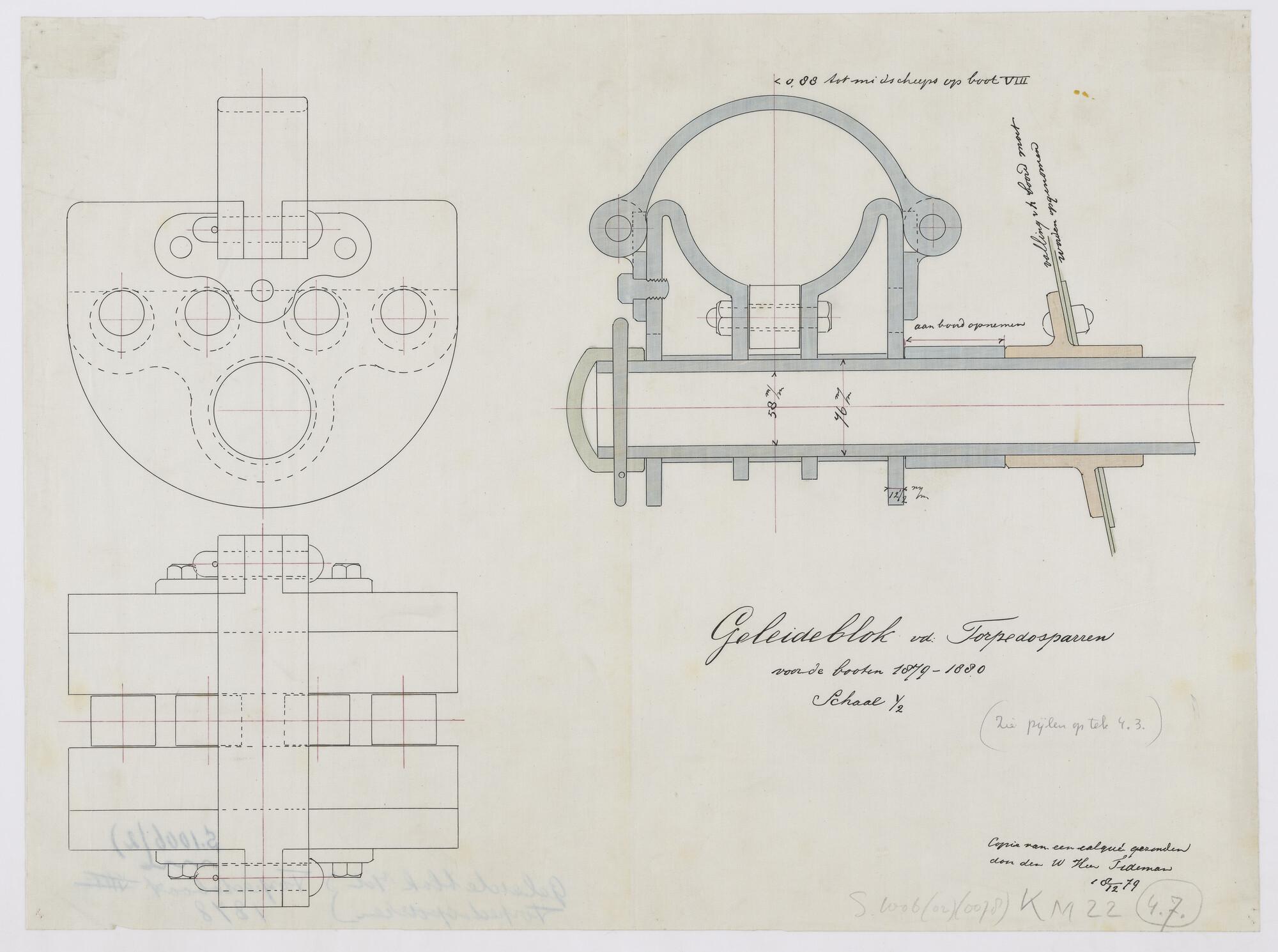 Tekening van een geleideblok voor aan boord van spartorpedoboot Zr.Ms. VIII (schaal 1:2).