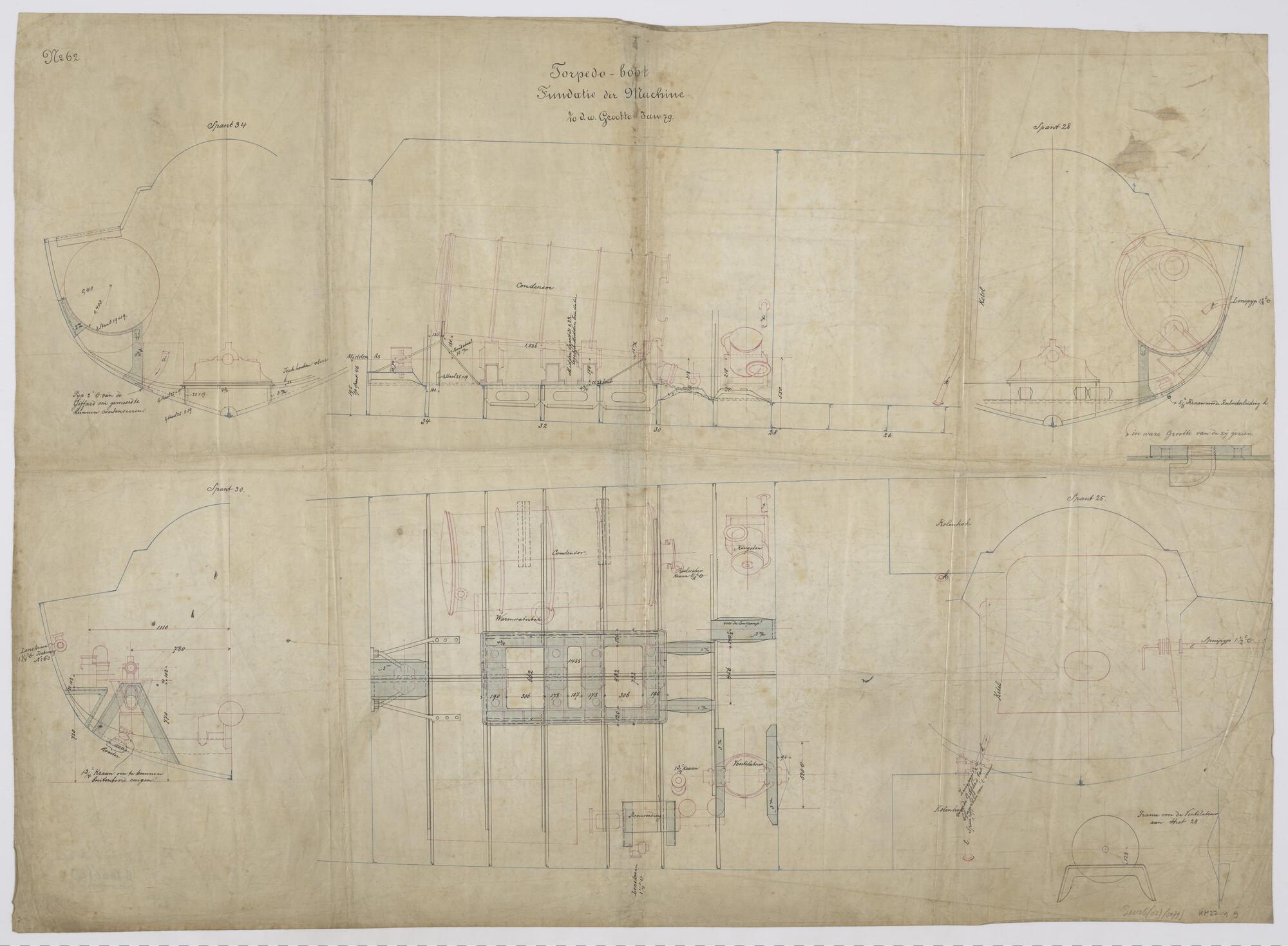Tekening van de fundatie voor de machine voor aan boord van spartorpedoboot Zr.Ms. VIII (schaal 1:2).