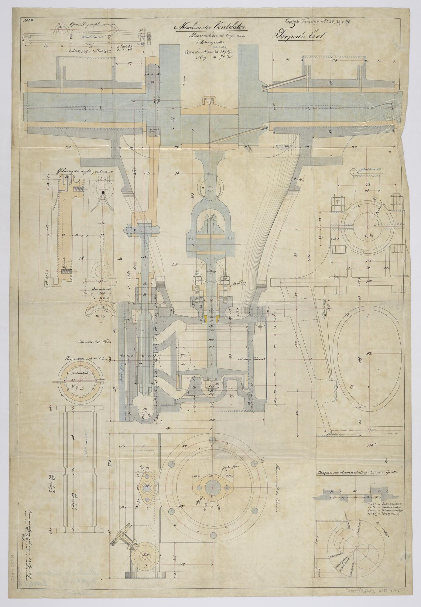 Tekening van de ventilatiemachine, dwarsdoorsnede over de lengte van de as, voor aan boord van spartorpedoboot Zr.Ms. VIII (schaal 1:2).