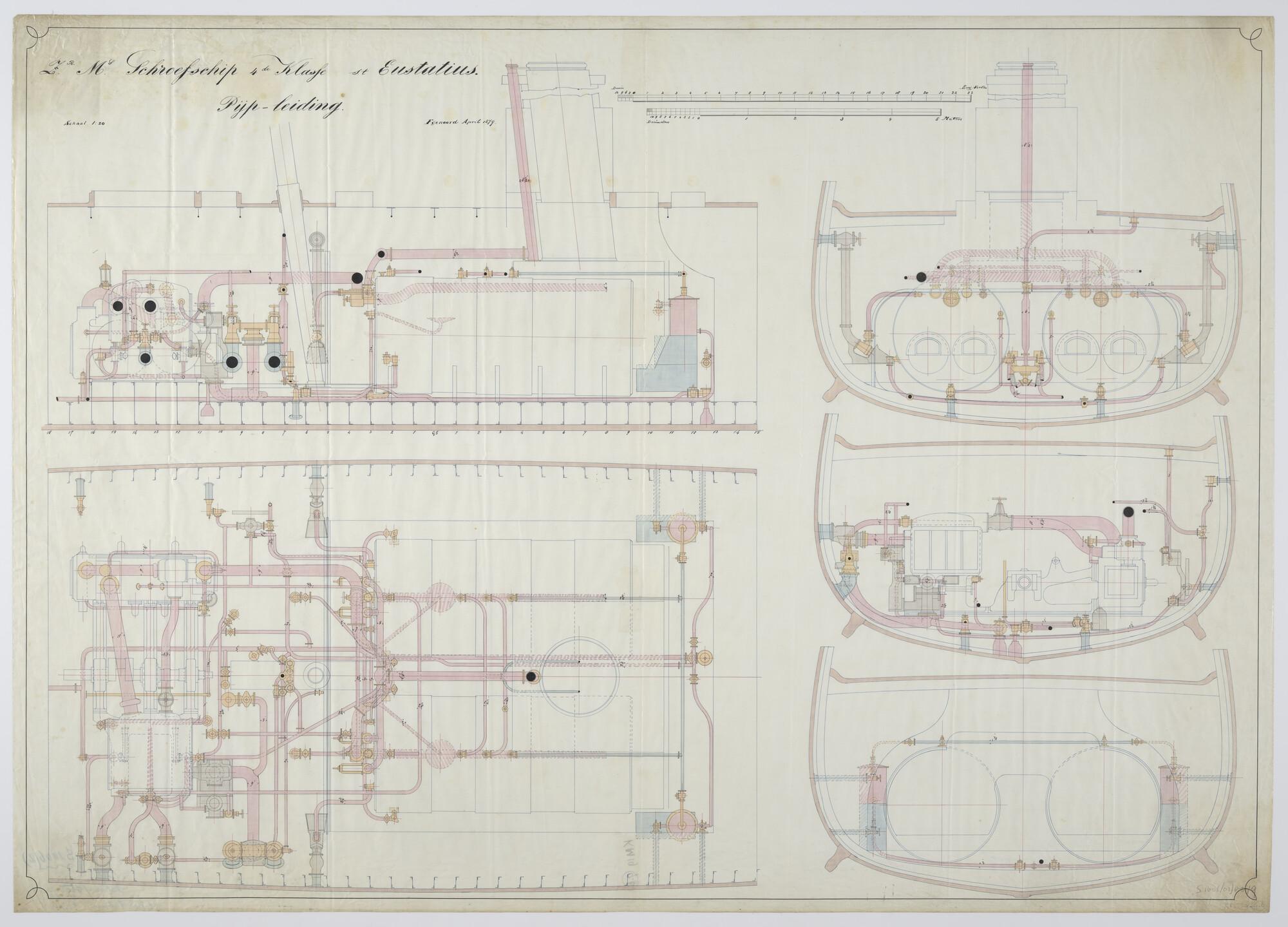 Langsscheepse doorsnede, bovenaanzicht, drie dwarsdoorsneden over de machinekamer en ketelruim met de schoorsteen van het schroefstoomschip der vierde klasse Zr.Ms. St.Eustatius (Bali). Pijpleidingen (schaal 1:10).