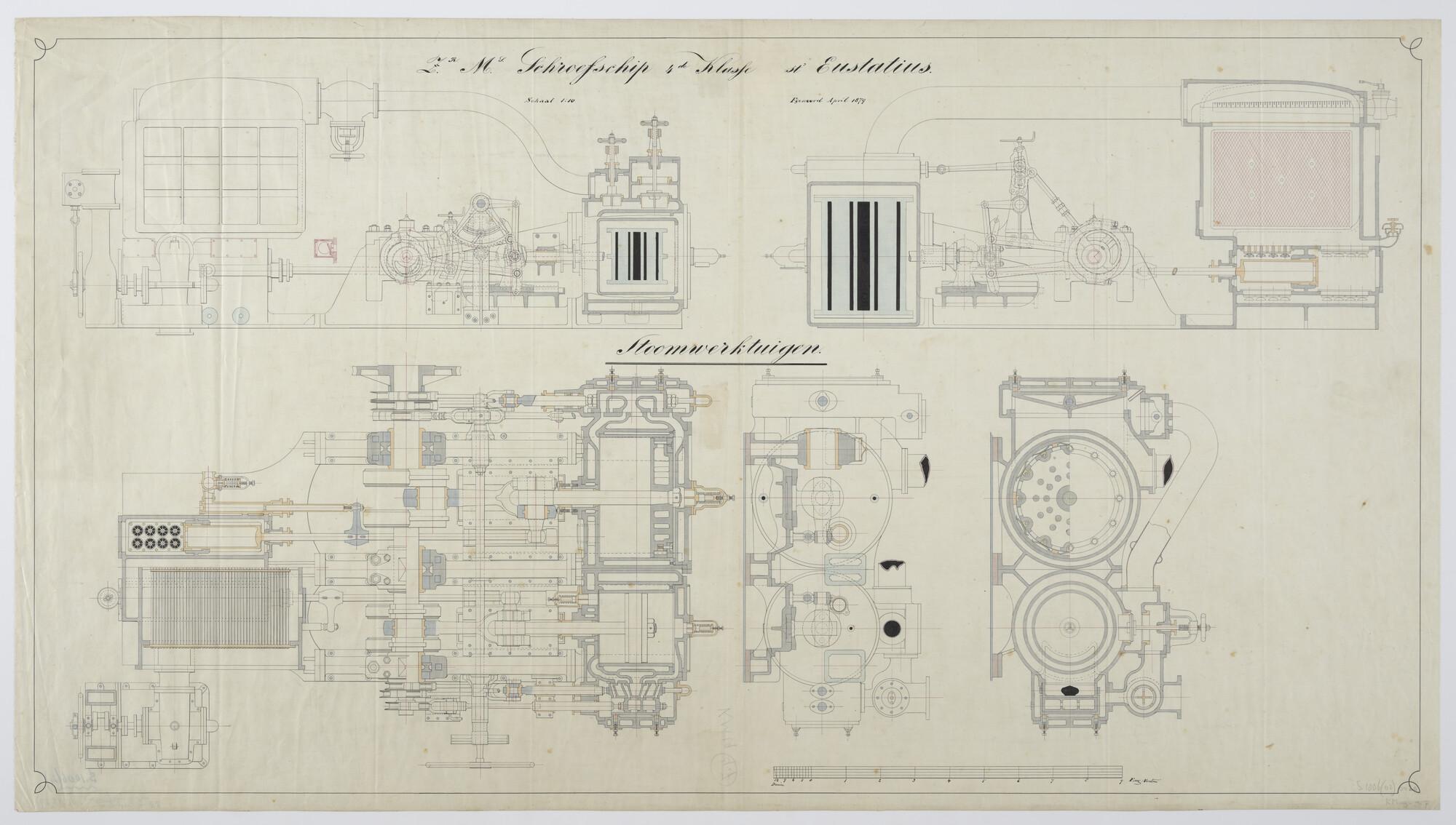 Diverse doorsneden over de eerste twee cilinder compound stoommachine in de Koninklijke marine, geïnstalleerd van het schroefstoomschip der vierde klasse Zr.Ms. St.Eustatius (Bali) (schaal 1:10).