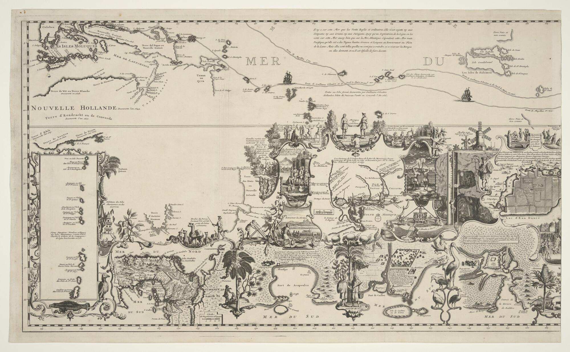 Kaart van de Stille en Atlantische Oceaan in vier losse ongemonteerde bladen, waarop de verschillende ontdekkingsreizen zijn aangegeven. Met afbeeldingen van ontdekkers t/m William Dampier (1712) en zeer veel graveerwerk aan de rand, met deelkaarten, afbeeldingen van volken etc. De kaart is in Mercator projectie en ongekleurd. De kaart is oorspronkelijk gepubliceerd in deel 7 ...
