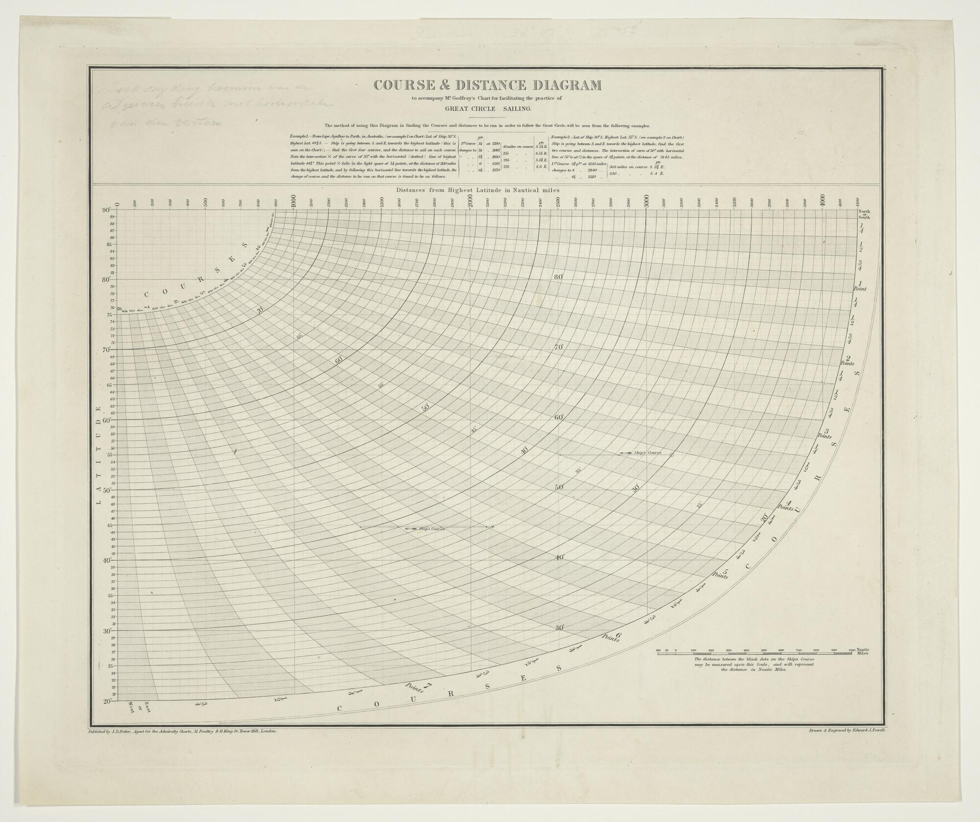 Zeekaart van het zuidelijk halfrond bezuiden 20° breedte met bijbehorend koers en verheidsdiagram, voor grootcirkel zeilen, door Hugh Godfrey. Gravure Edward J. Powell, uitgave J.D. Potter (1850-1873), Londen 1858.