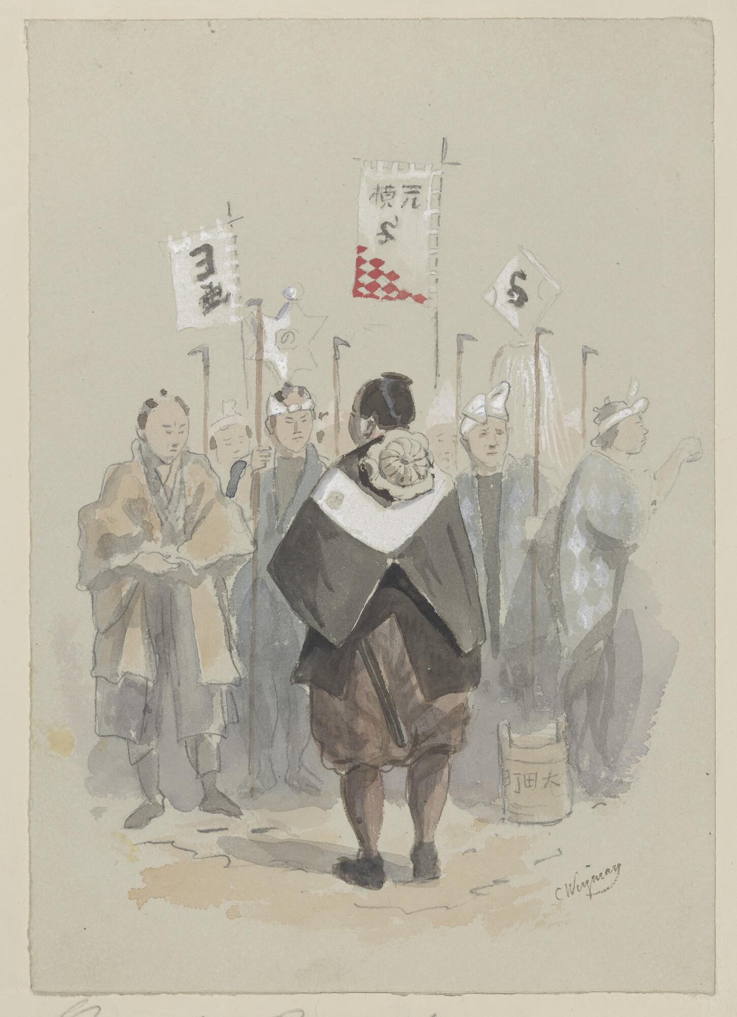 A group of Japanese firefighters, usually consisting of local townspeople, holding firefighter's hooks and banners. The characters on the bucket, read from left to right, indicate that they are from the Ōta-machi neighbourhood in the port town of Yokohama.