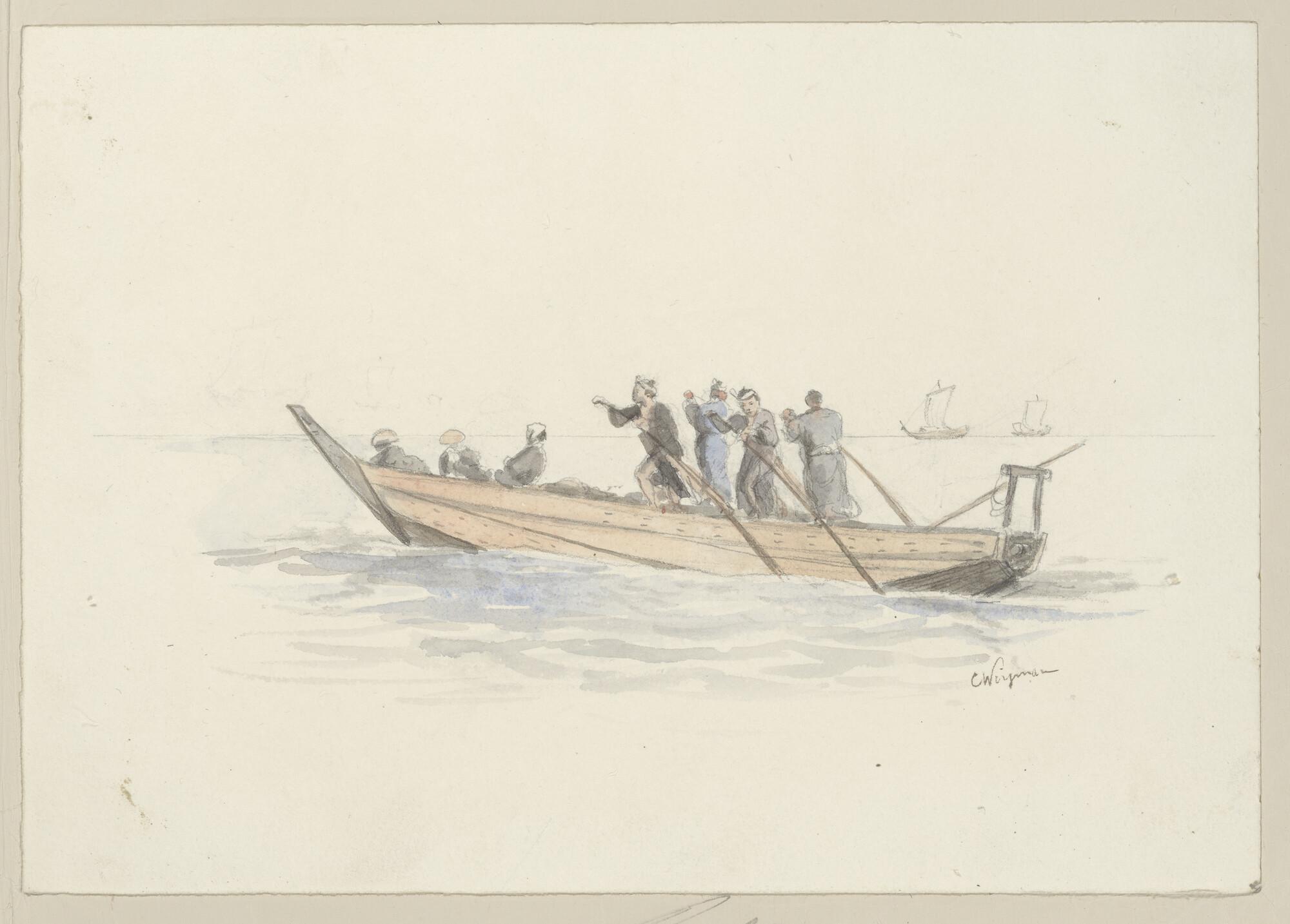 A traditional Japanese boat being propelled by four oarsmen.