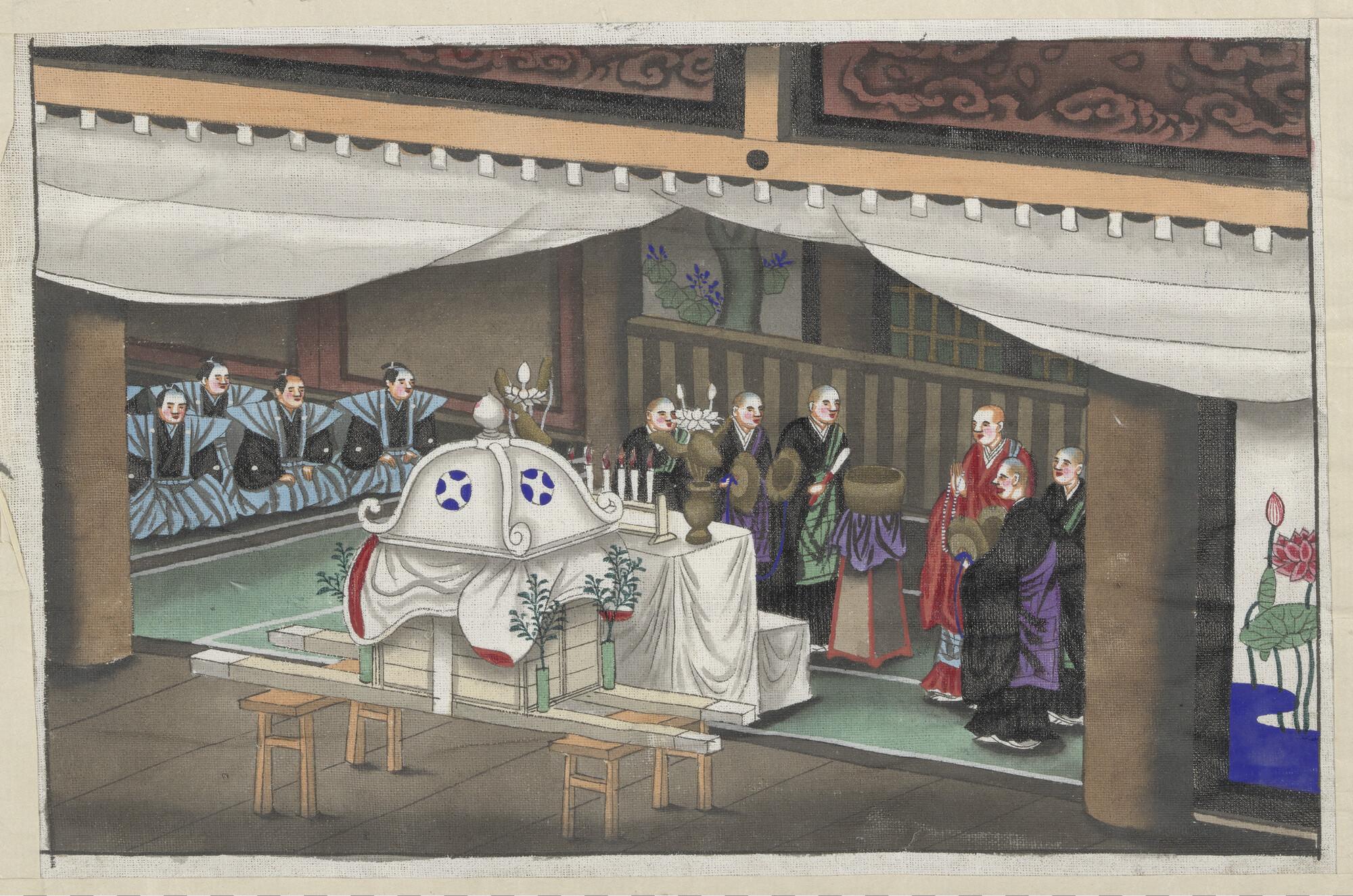Tekening van de uitvaartprocessie van een pater familias: de kist in de tempel.