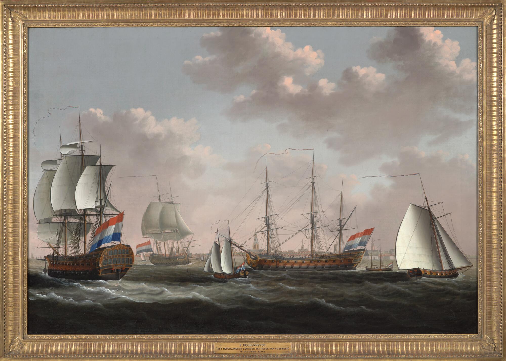 Schilderij in lijst van de Nederlandse blokkadevloot voor anker ter rede van Vlissingen, 1784.