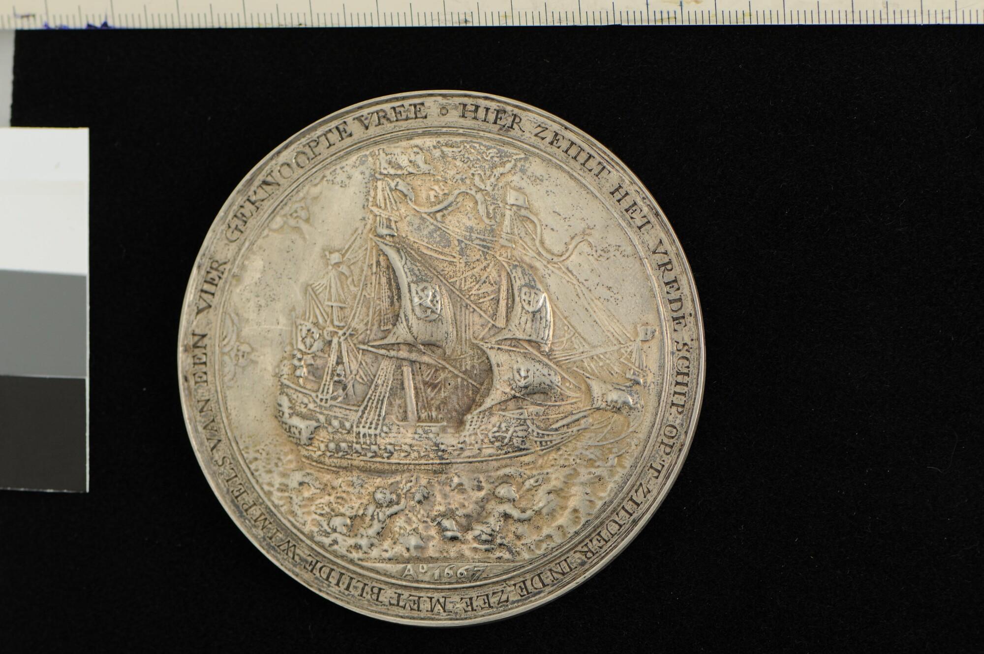 Penning geslagen ter gelegenheid van de Vrede van Breda en het einde van de Tweede Engelse Oorlog, 1667.