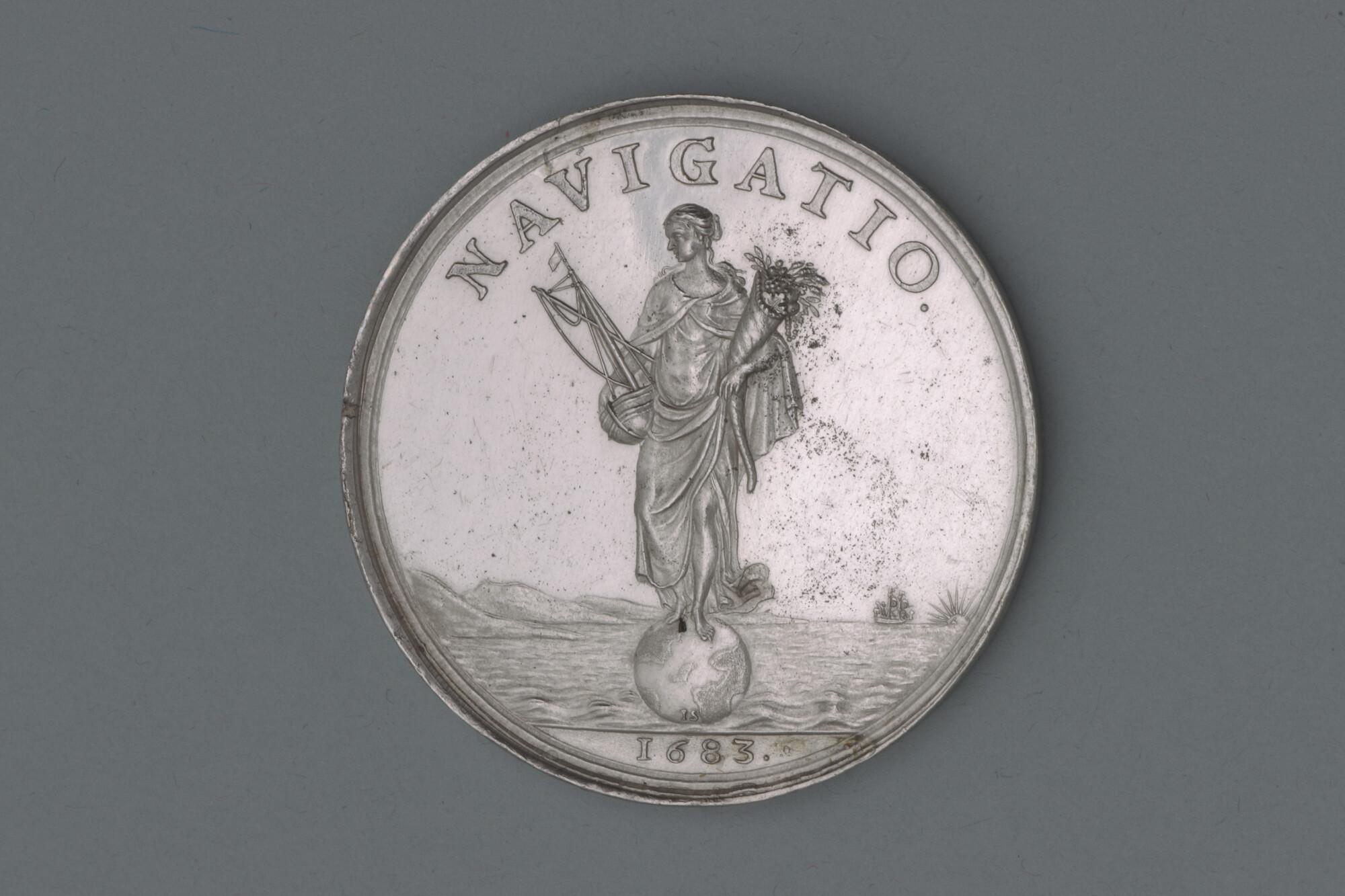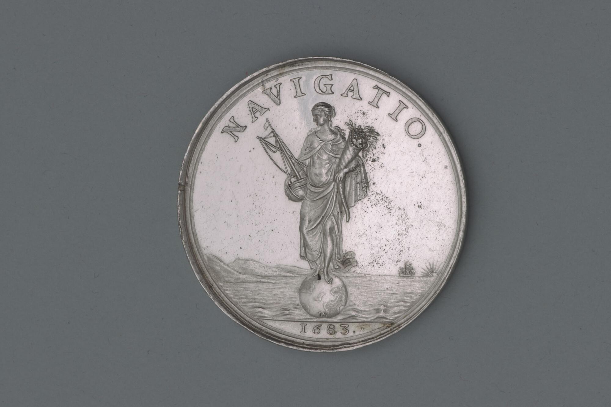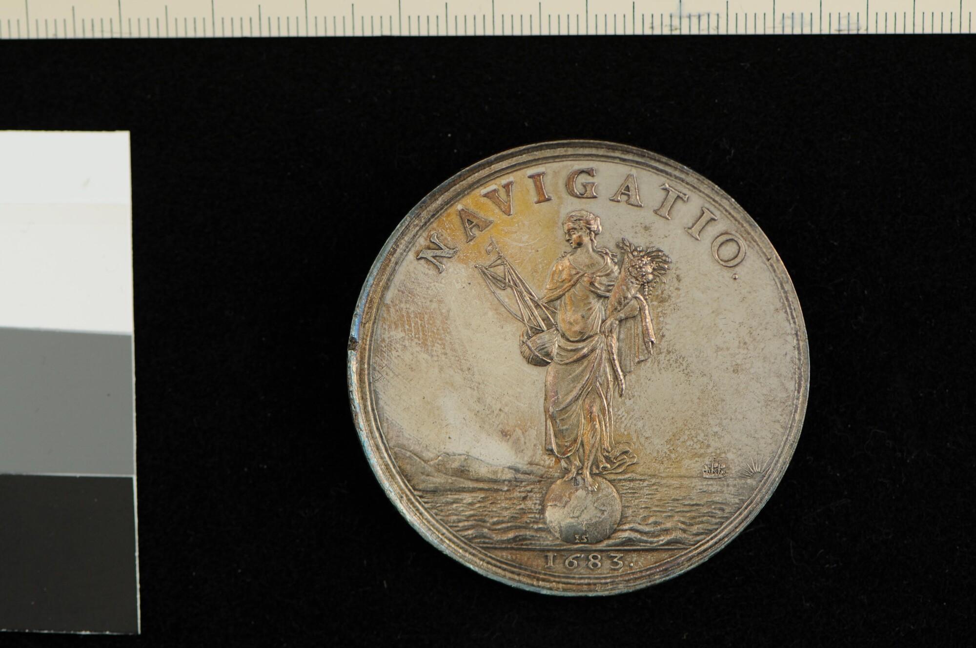 Penning geslagen ter gelegenheid van het aanleggen van een jaagpad langs de Zijl bij Leiden, 1683.