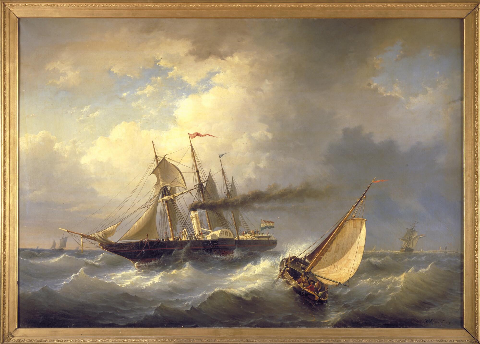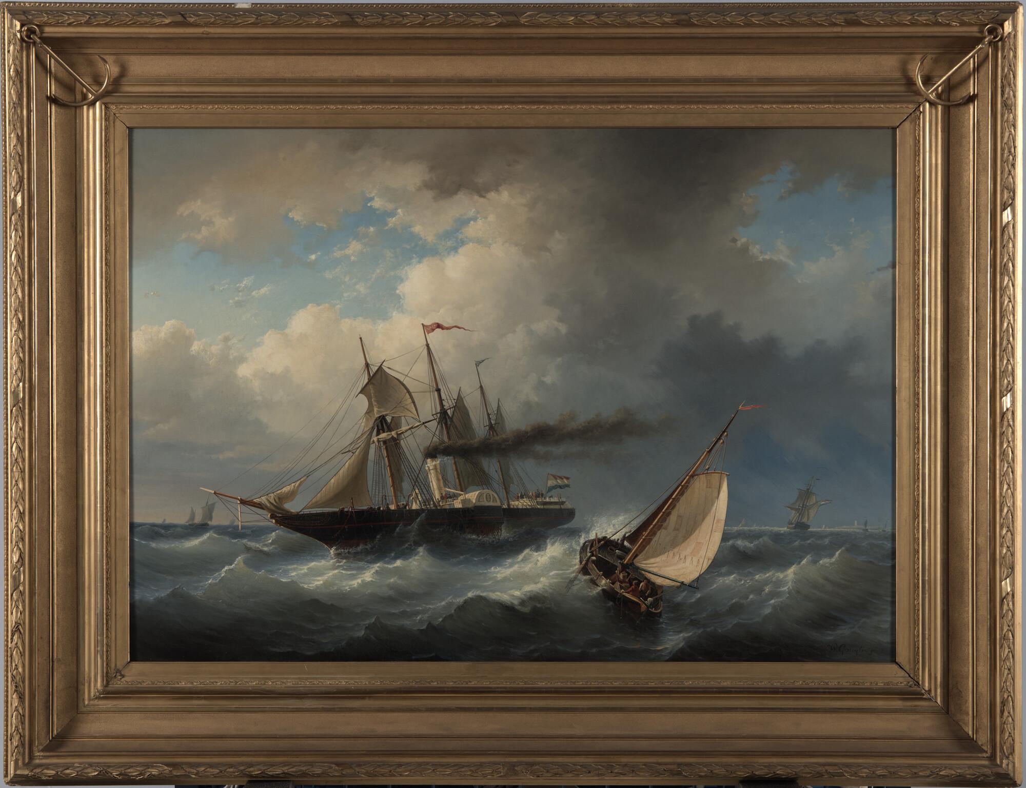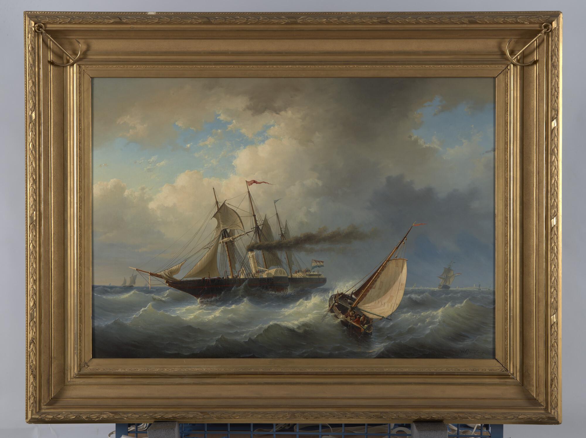 Schilderij in lijst van het raderstoomschip Arti et Amicitiae in de wending. Een raderschip vaart om een woeste zee.