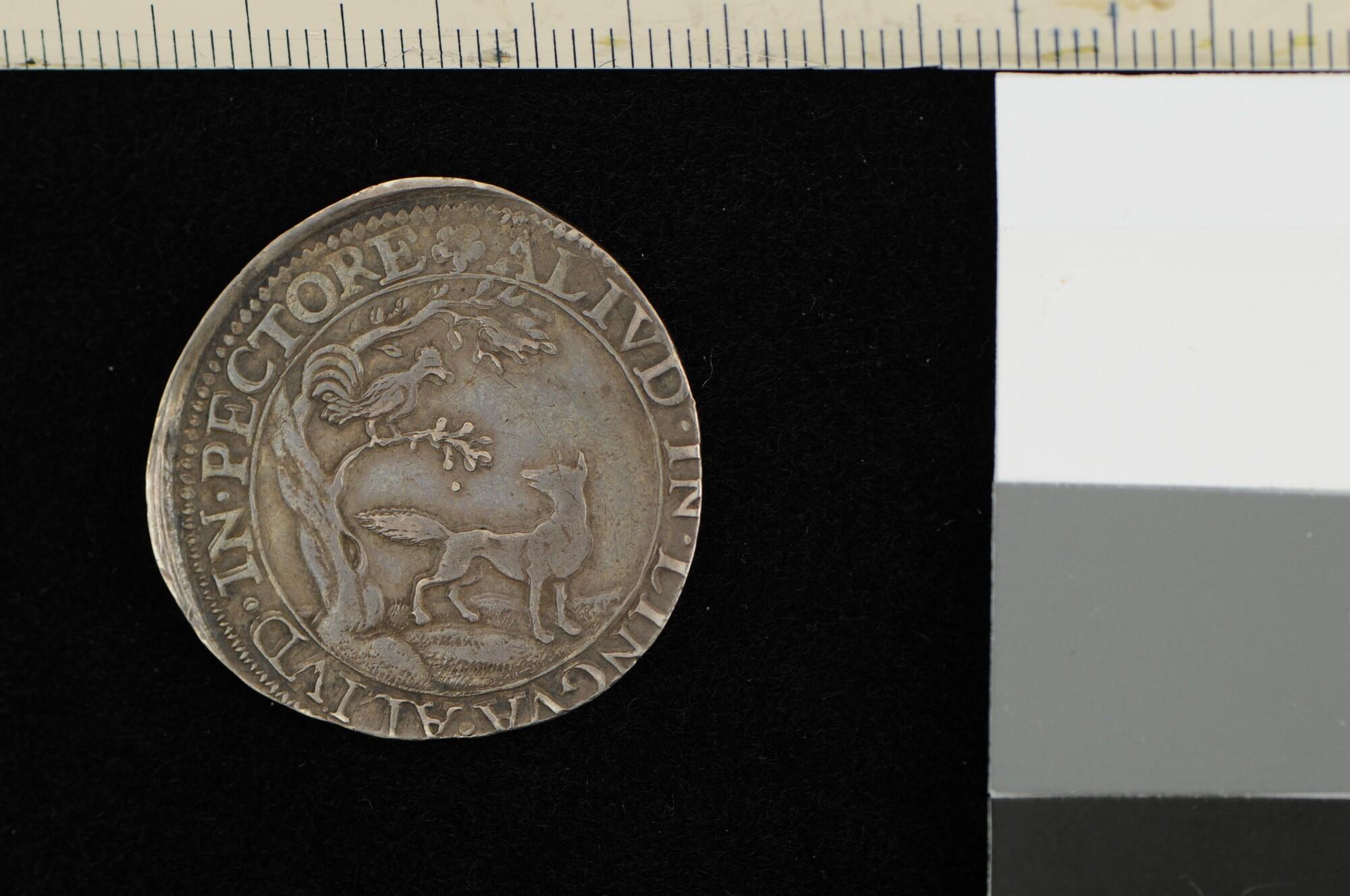 Rekenpenning geslagen op de voorgewende schenking van vergiffenis aan de bezetters van Oostende door Albrecht, aartshertog van Oostenrijk, 1603.