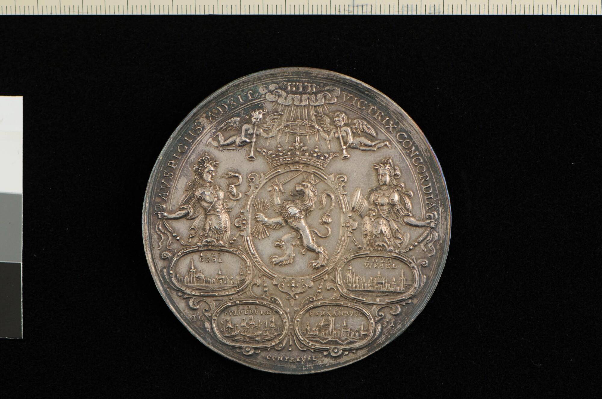 Penning geslagen ter gelegenheid van de overwinningen onder stadhouder Frederik Hendrik in 1627-1630: de inname van 's-Hertogenbosch, Grol en Wesel; de Zilvervloot verslagen door admiraal Piet Hein; Pernambuco ingenomen door admiraal Lonek en generaal Waardenburg.