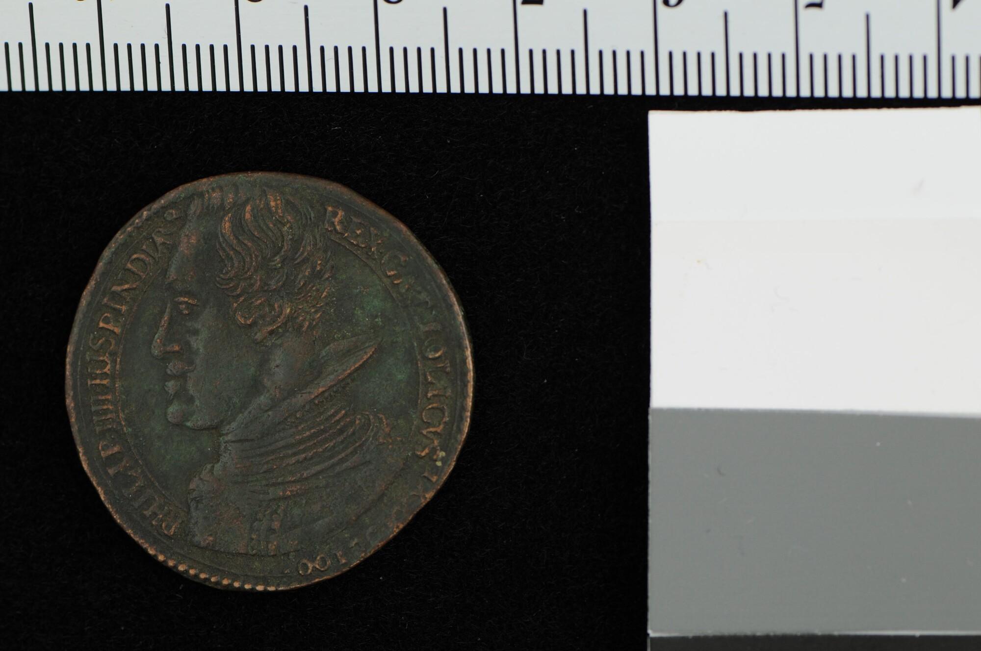 Rekenpenning geslagen op het verslaan van de Nederlandse vloot, onder leiding van admiraal Adriaan Jansz. Pater, bij Todos de los Santos door de Spaanse vloot, onder leiding van Antoni d' Oquendo, 1631.