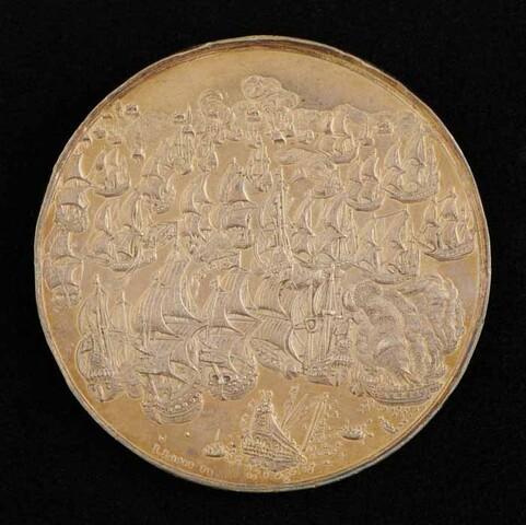 Penning geslagen ter gelegenheid van de overwinning op de Spaanse vloot onder Don Antonio d'Oquendo bij Duins door Maarten Harpertsz. Tromp, 21 oktober 1639. Geslagen op last van de Staten Generaal.
