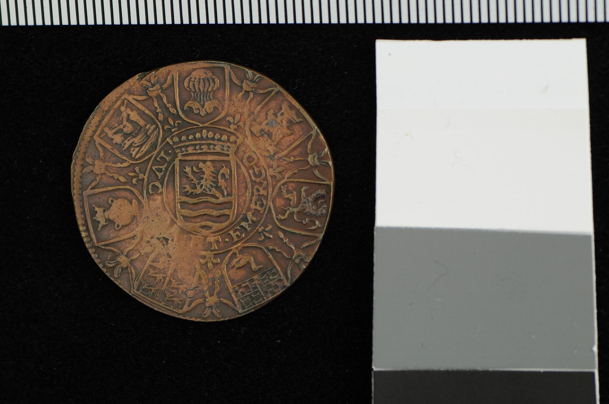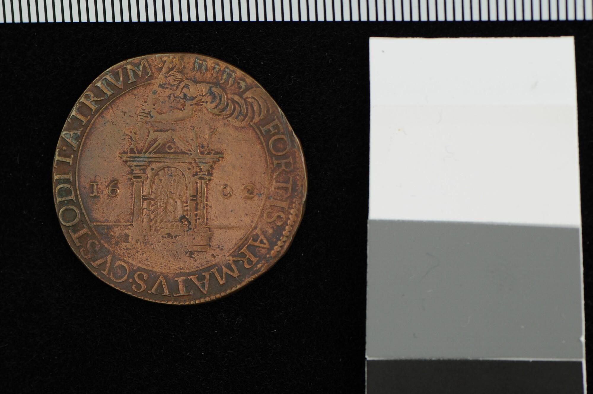 Rekenpenning van Zeeland op het oproepen tot bewapening van de bevolking van Zeeland in de strijd tegen de Spanjaarden, 1602.
