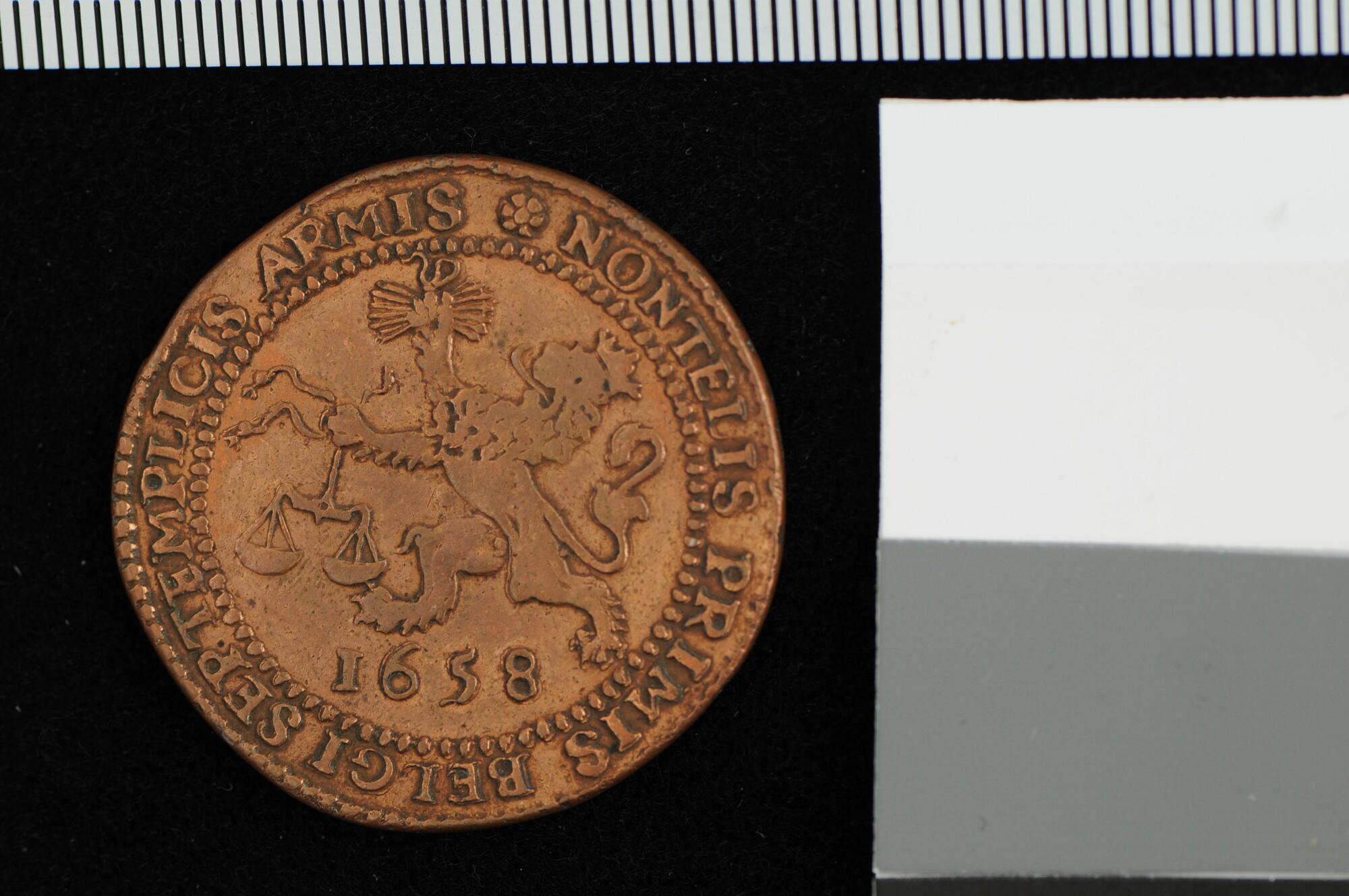 Rekenpenning geslagen op de steun van de Verenigde Nederlanden aan Denemarken in de oorlog met Zweden, 1658.