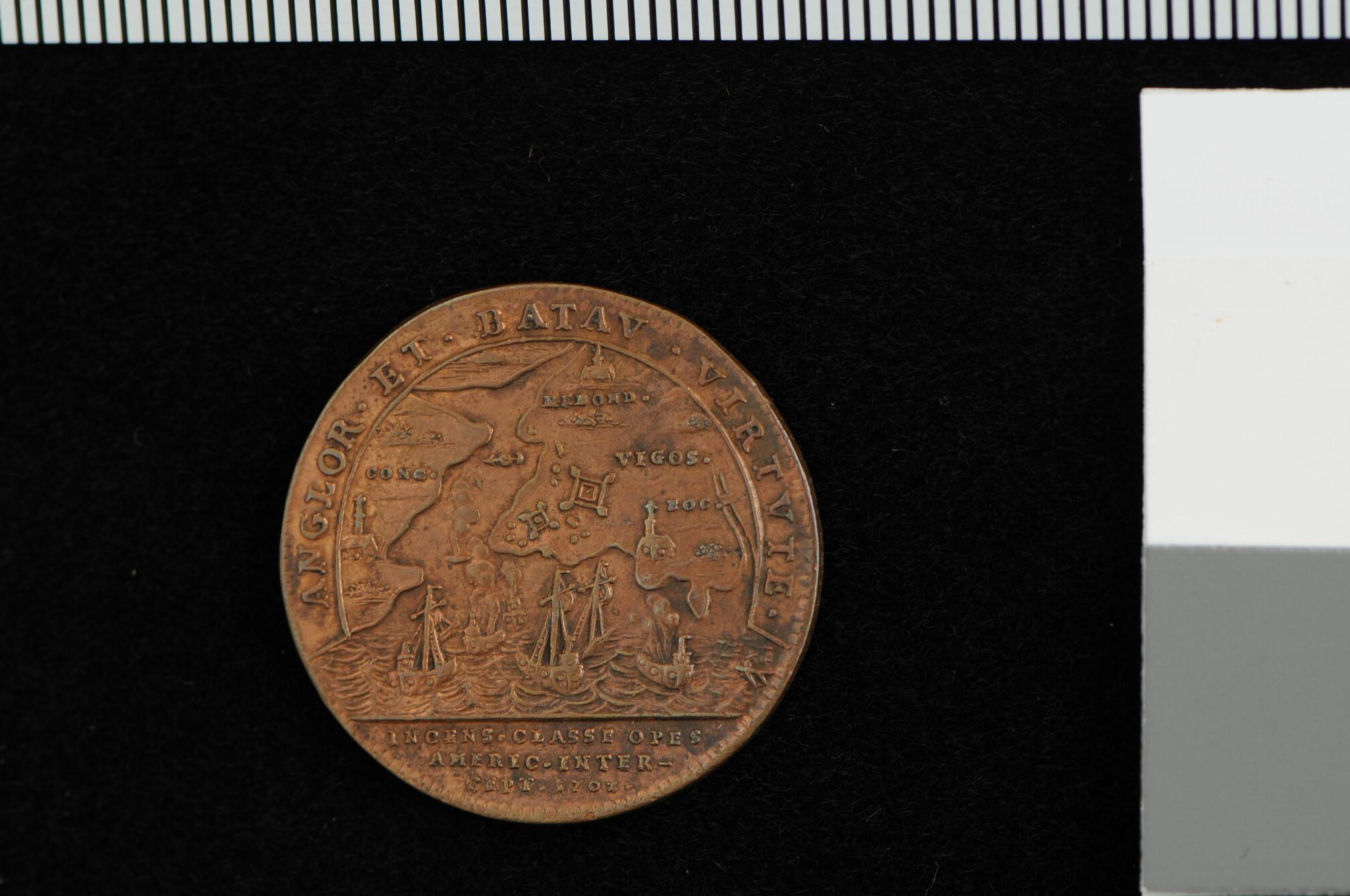 Rekenpenning op de verbranding van de Spaanse en Franse vloot in de baai van Vigo. Geslagen ter ere van Anna Stuart, koningin van Engeland, 1702.