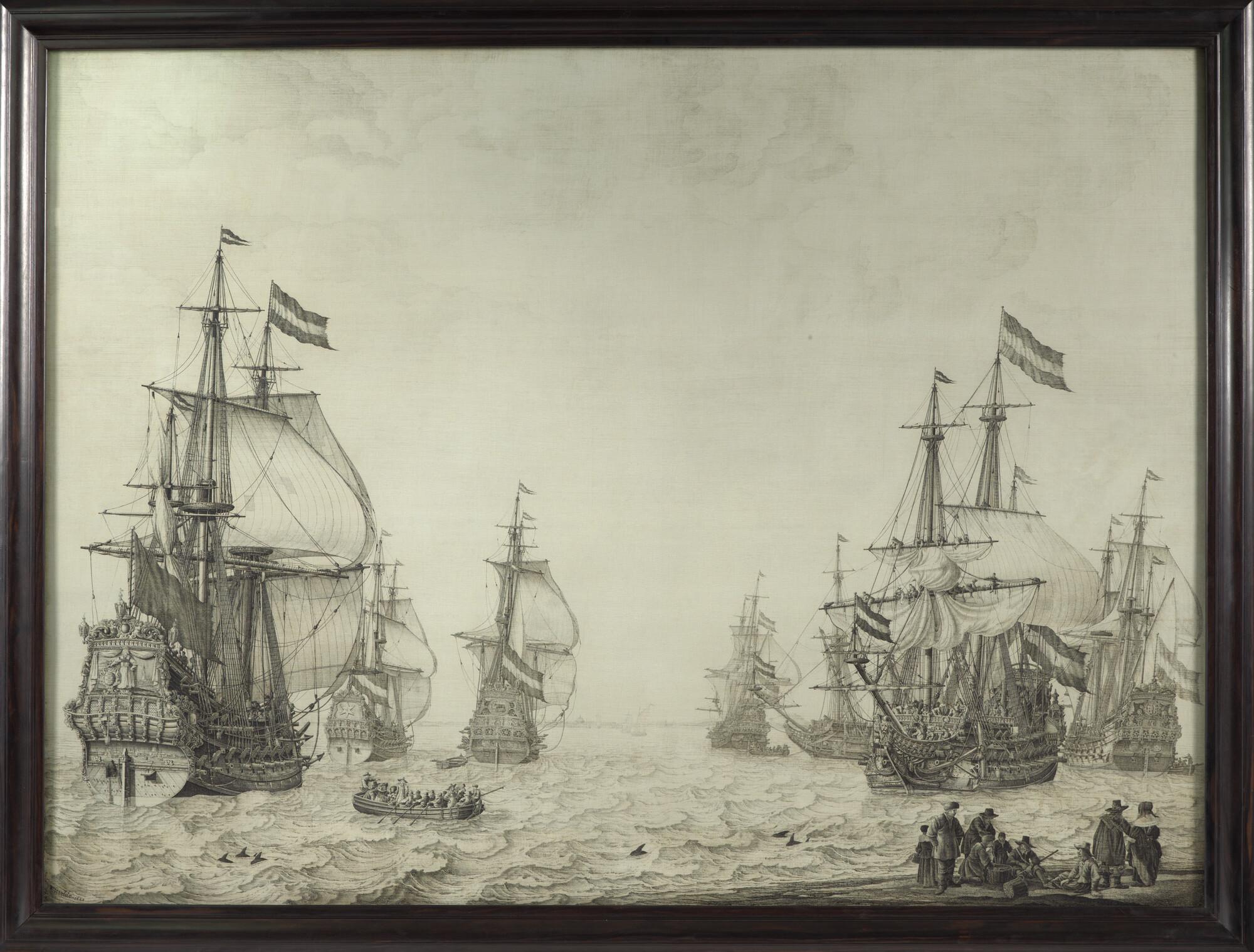Een eskader Nederlandse fregatten ten anker gaande voor de kust, mogelijk de rede van Texel, tijdens de Eerste Engelse Oorlog.