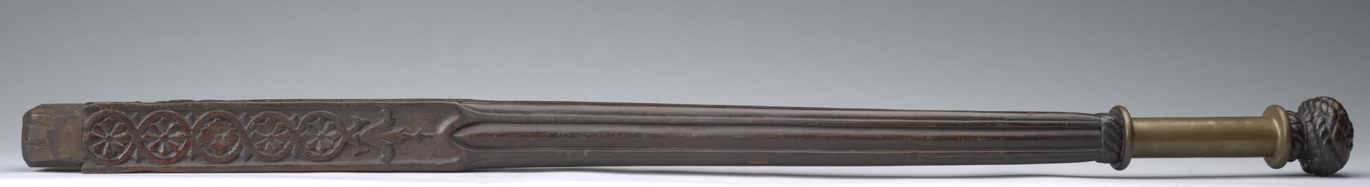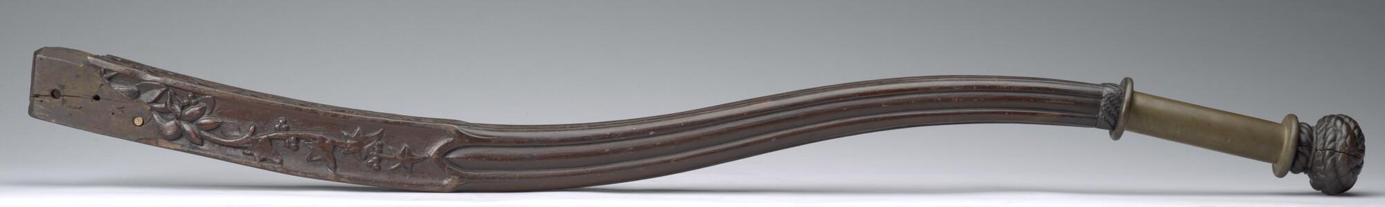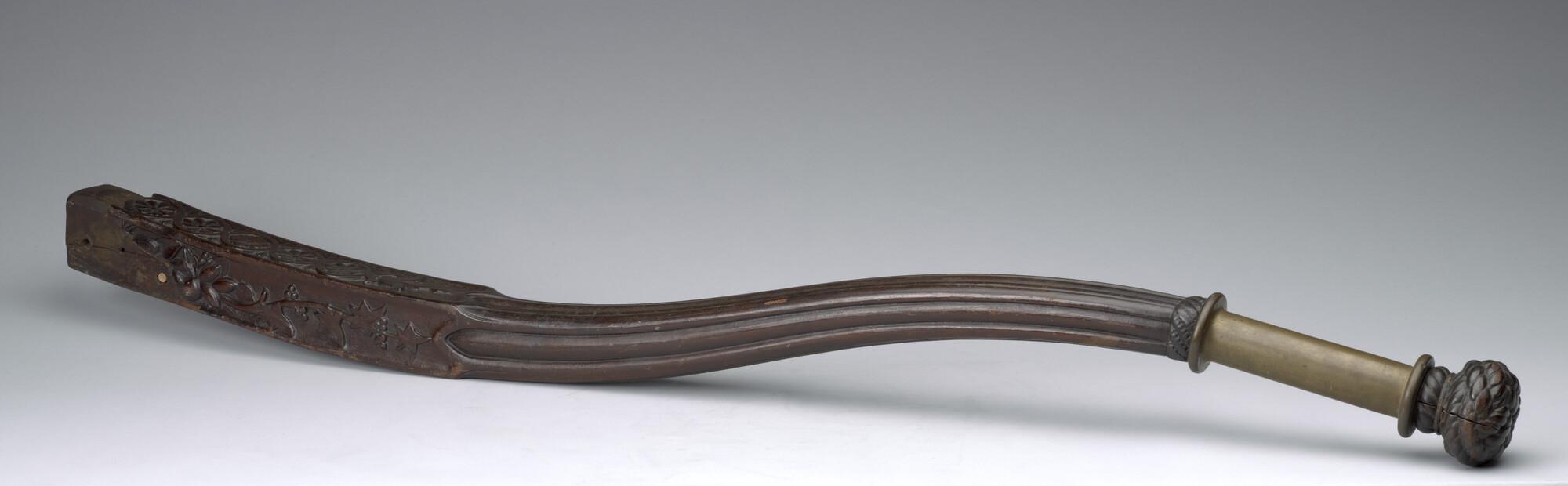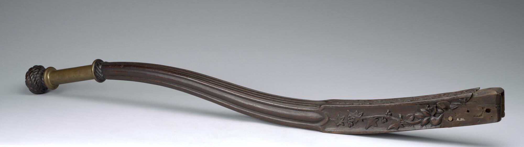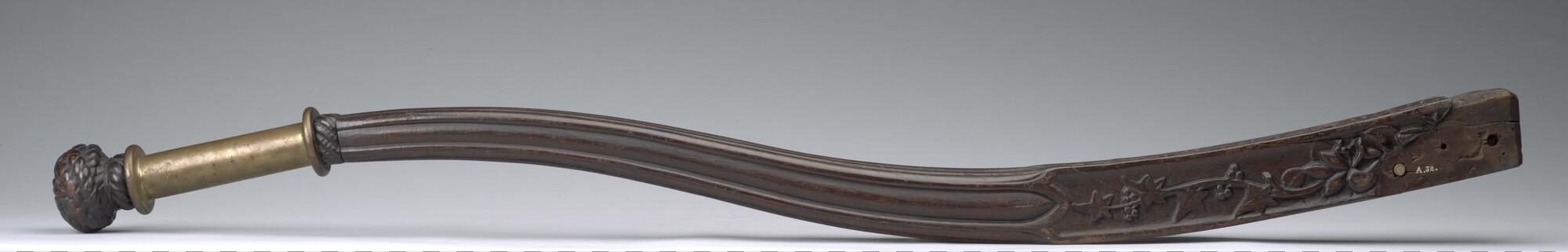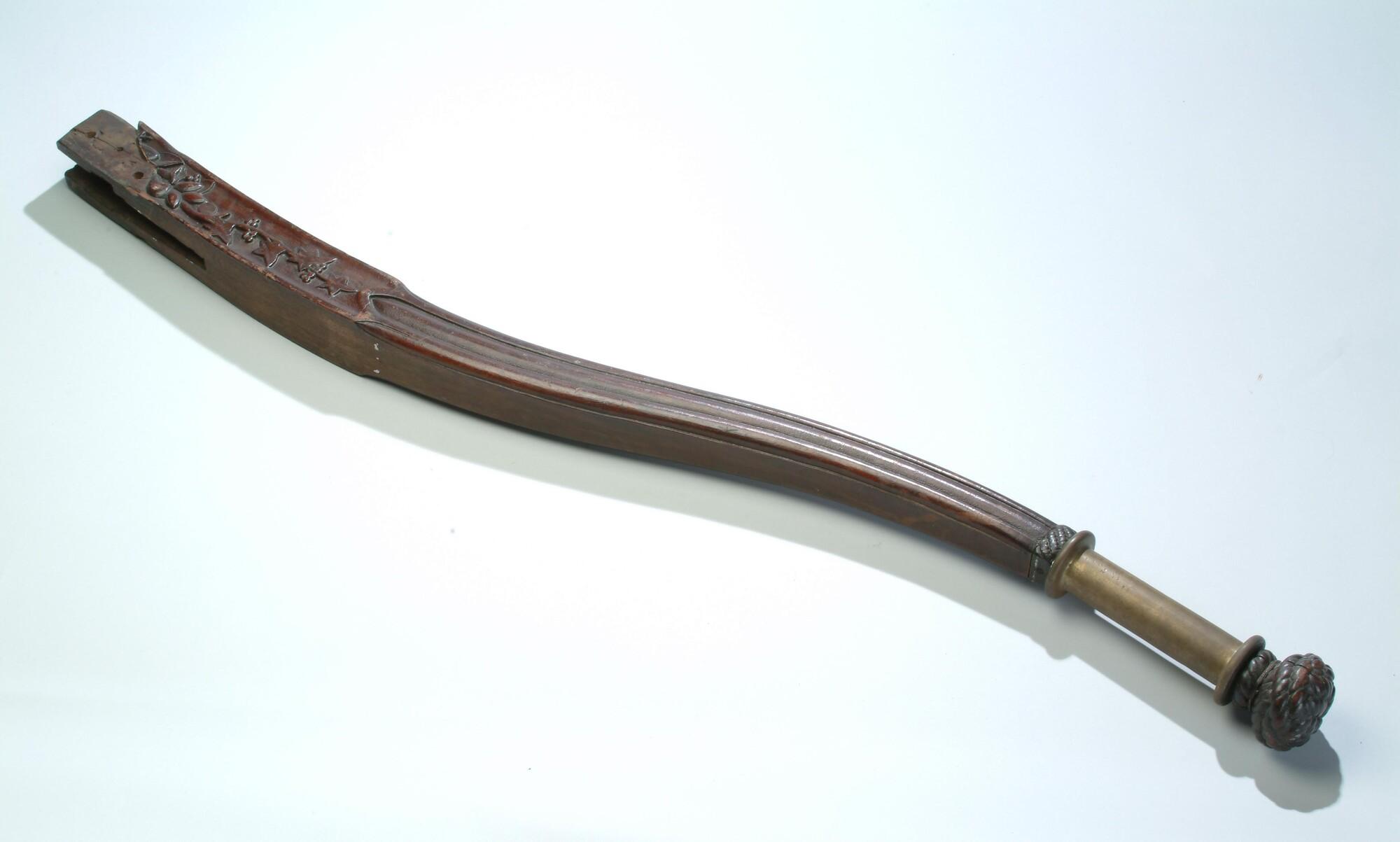Helmstok van bewerkt hout, vierkant in doorsnede, afkomstig van een binnenvaartschip.