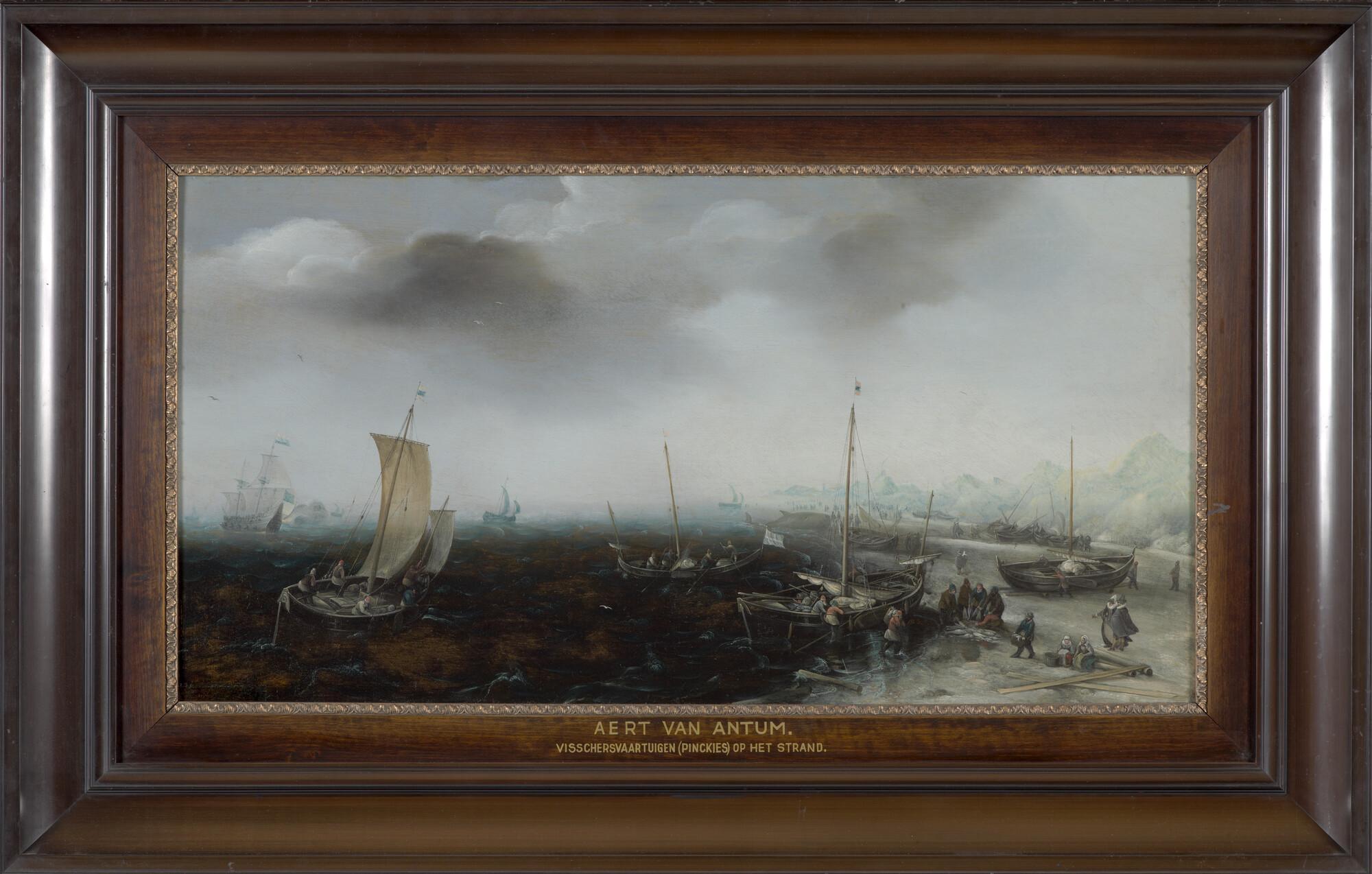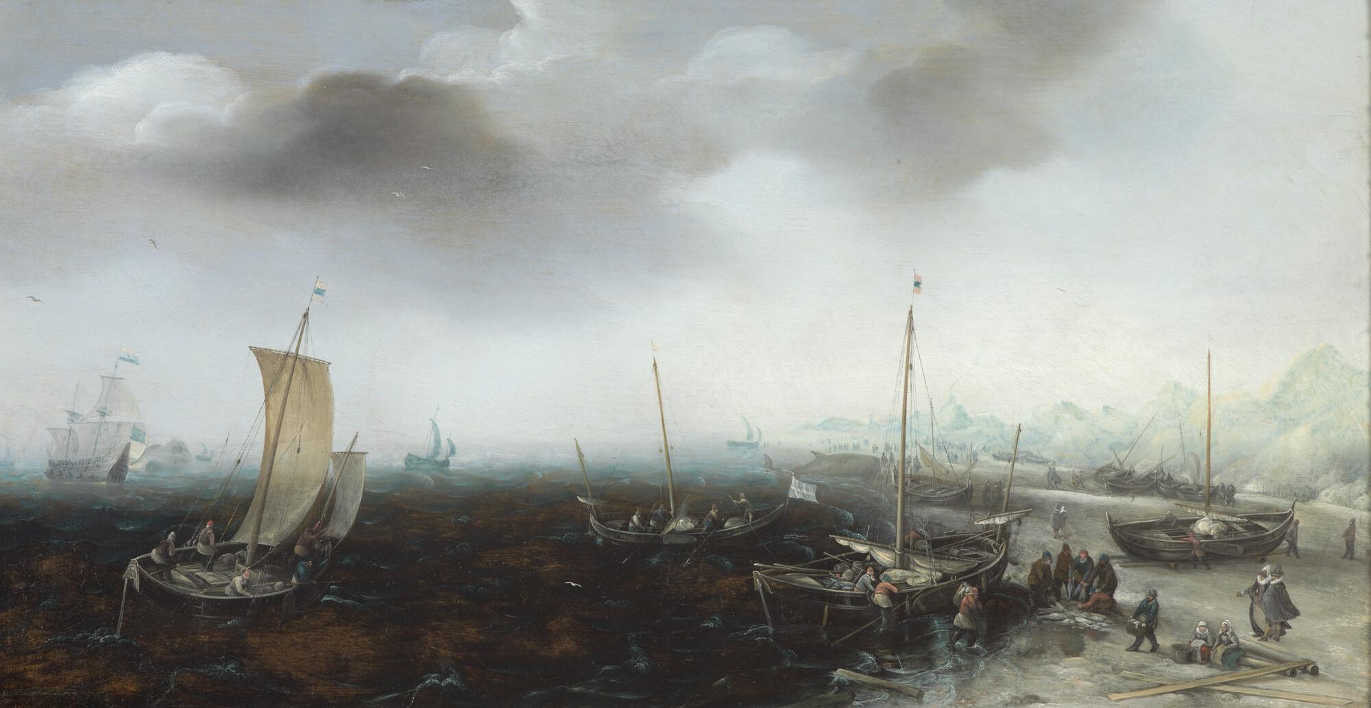 Pinken voor de kust en op het strand. Rechts op de achtergrond ligt een aangespoelde walvis en links vaart een bewapende koopvaarder of een oorlogsschip.