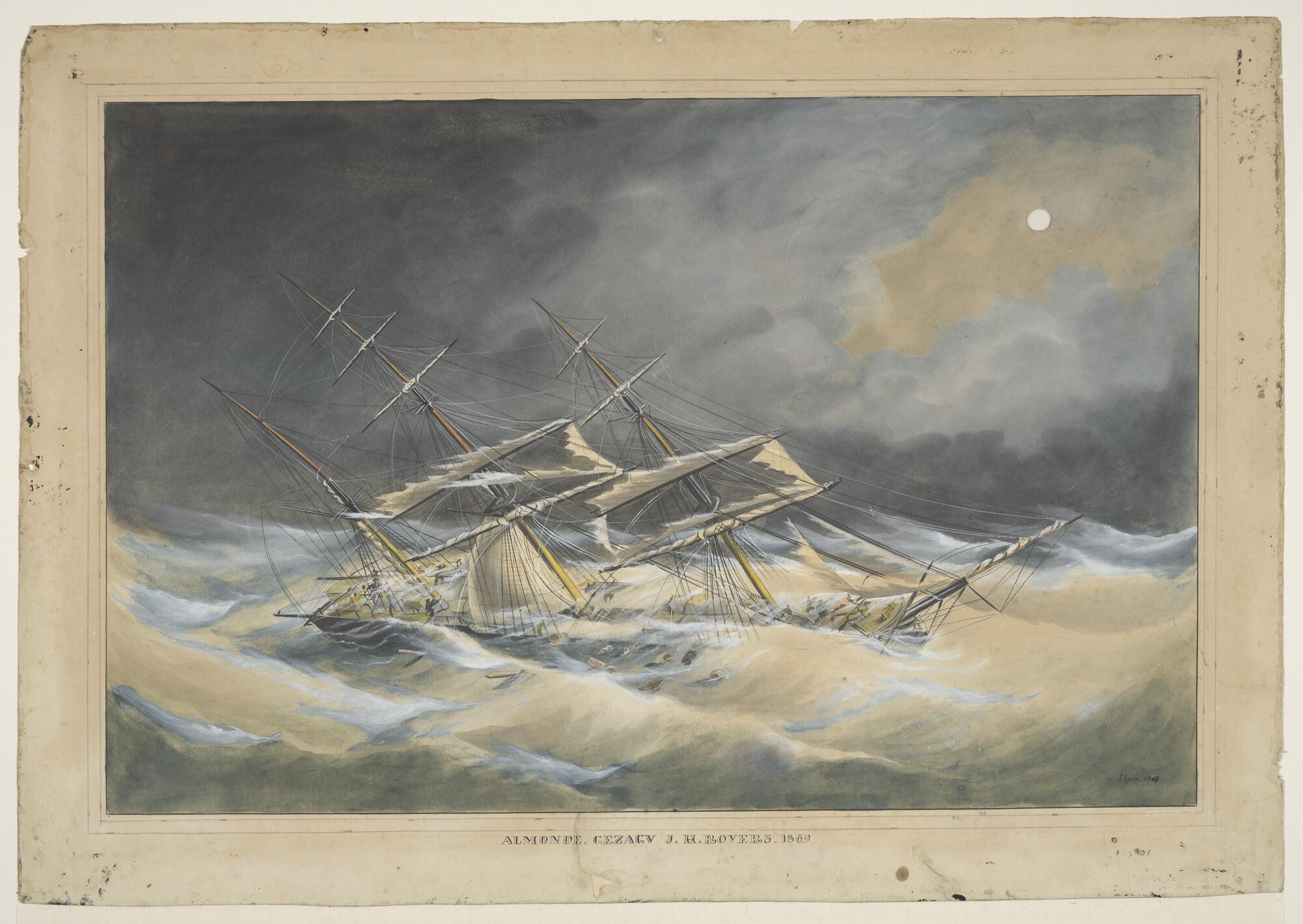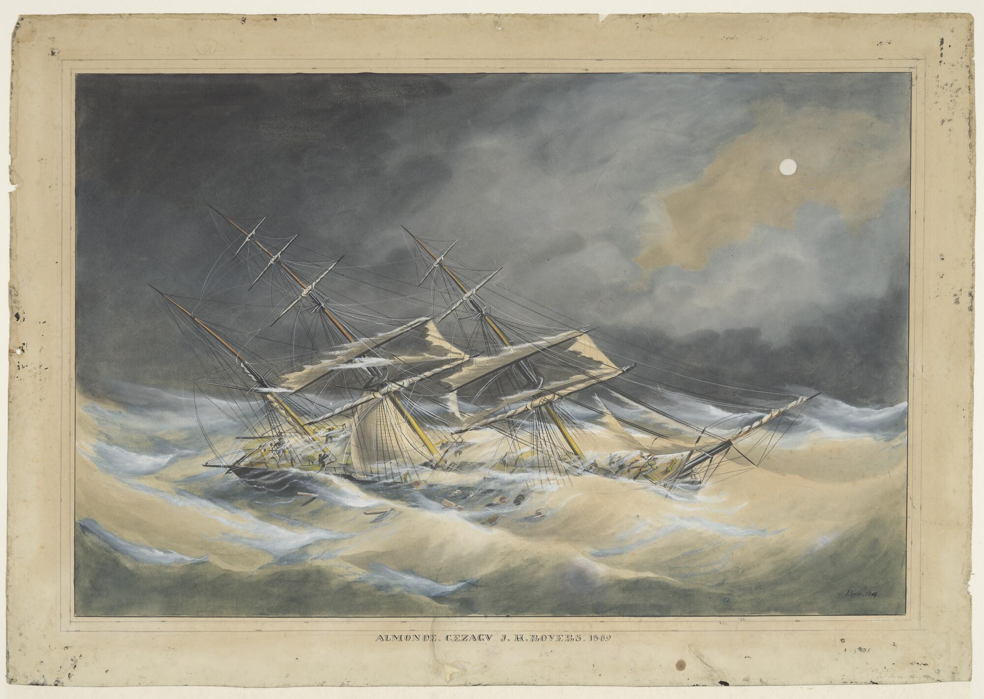 Het barkschip "Almonde" in vliegend weer.