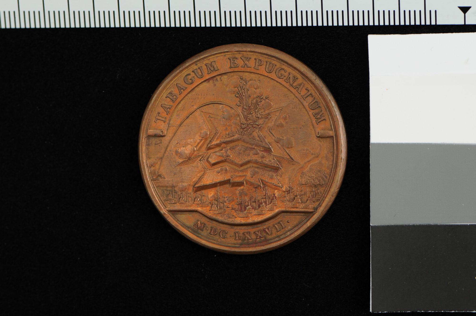 Franse penning geslagen ter gelegenheid van de verovering van het eiland Tobago (Nieuw Walcheren), 1677.