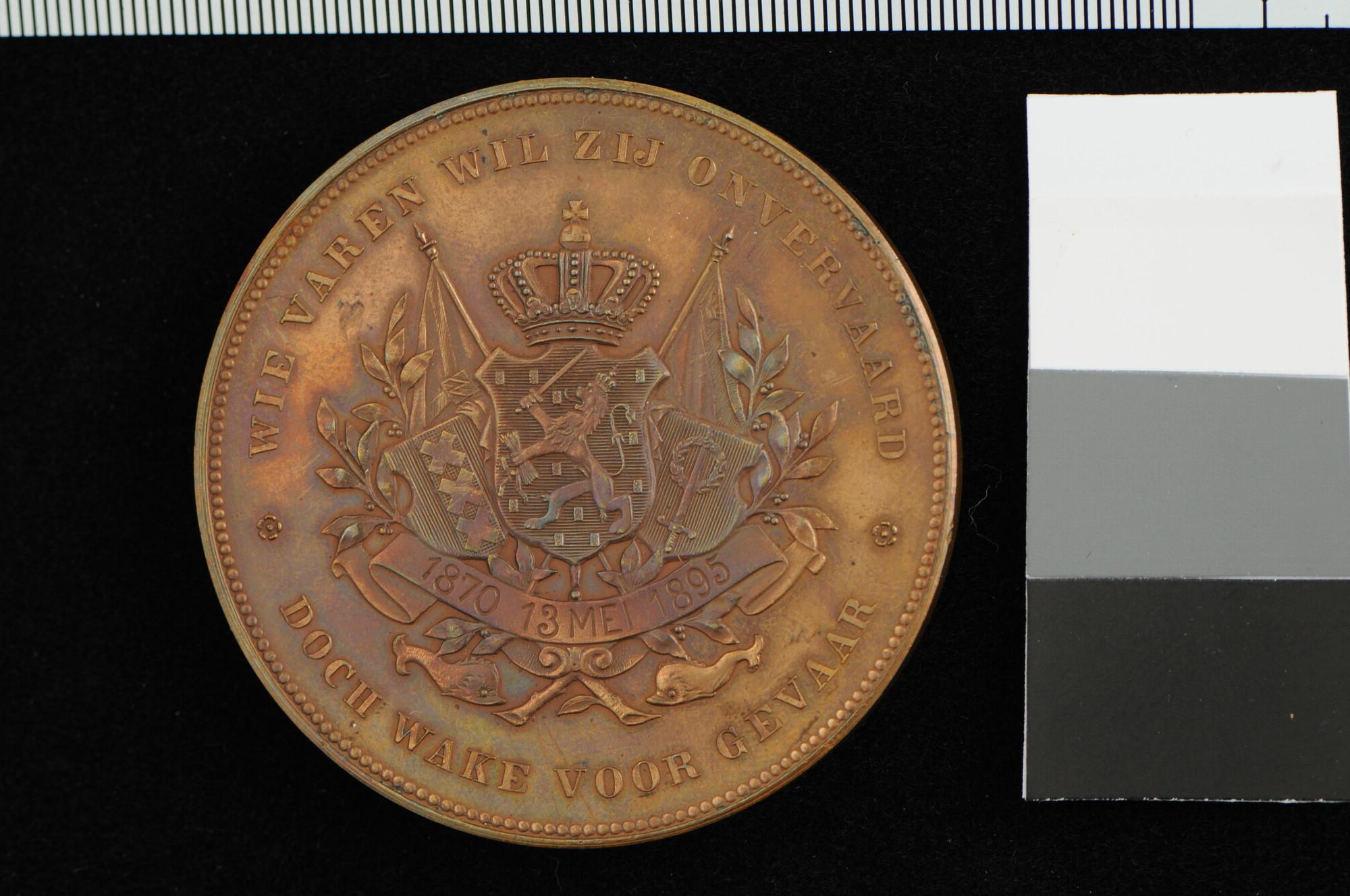 Penning geslagen op het 25-jarig bestaan van de Stoomvaart-Maatschappij "Nederland" (SMN) op 13 mei 1895. Deze penning werd door de stoomvaartmaatschappij aan het personeel ten geschenke gegeven.