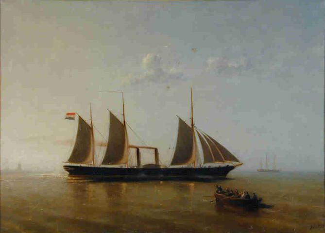 Het raderstoomschip 1e klasse Zr.Ms. Valk varend onder stoom en zeil