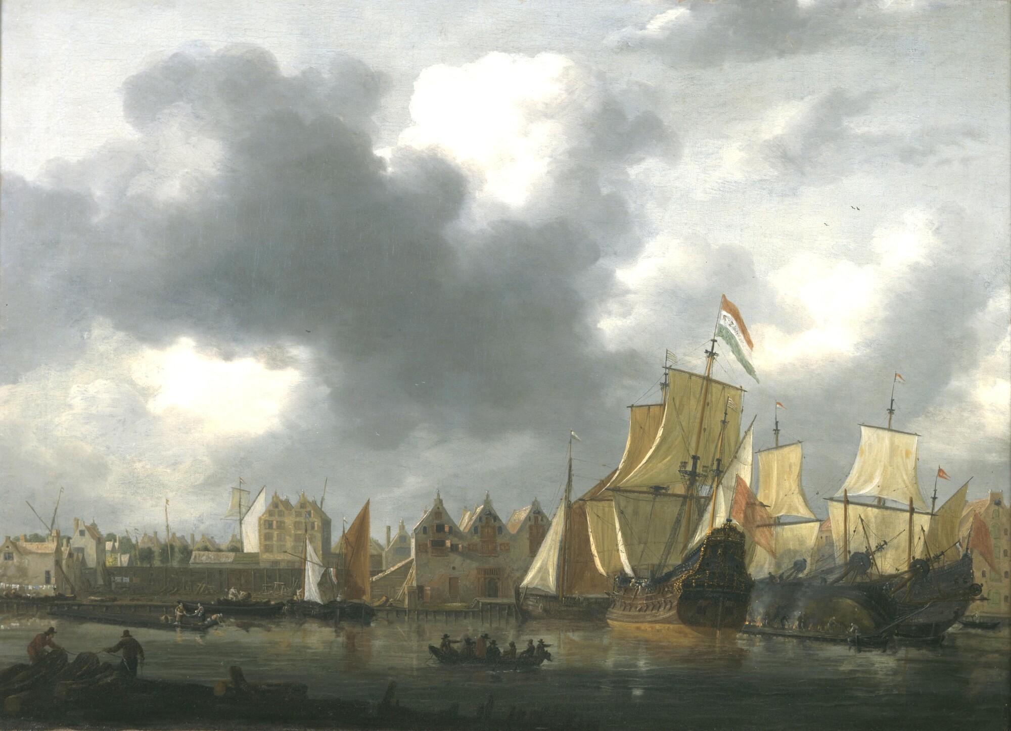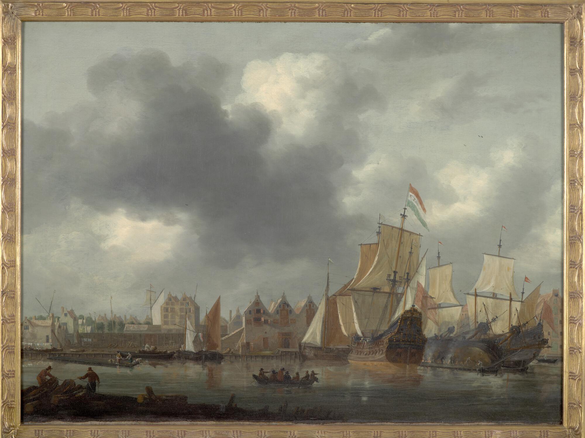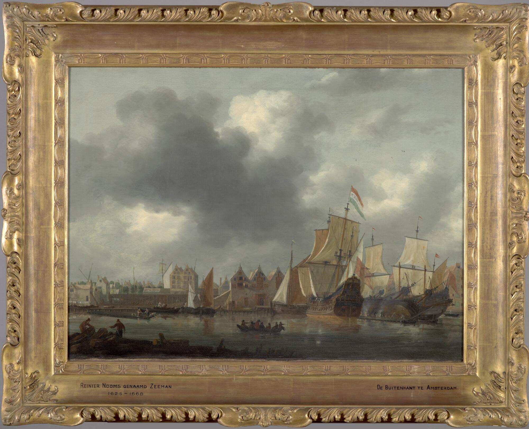 Op de voorgrond liggen verschillende zeilschepen voor anker in de Nieuwe Waal, een van de schepen wordt in het water gebreeuwd. Dit deel van de haven werd onder ander gebruikt door de Verenigde Oost-Indische Compagnie en de Admiraliteit van Amsterdam voordat zij verhuisden naar nieuwe locaties op het nabijgelegen Oostenburg en Kattenburg. In lijst.