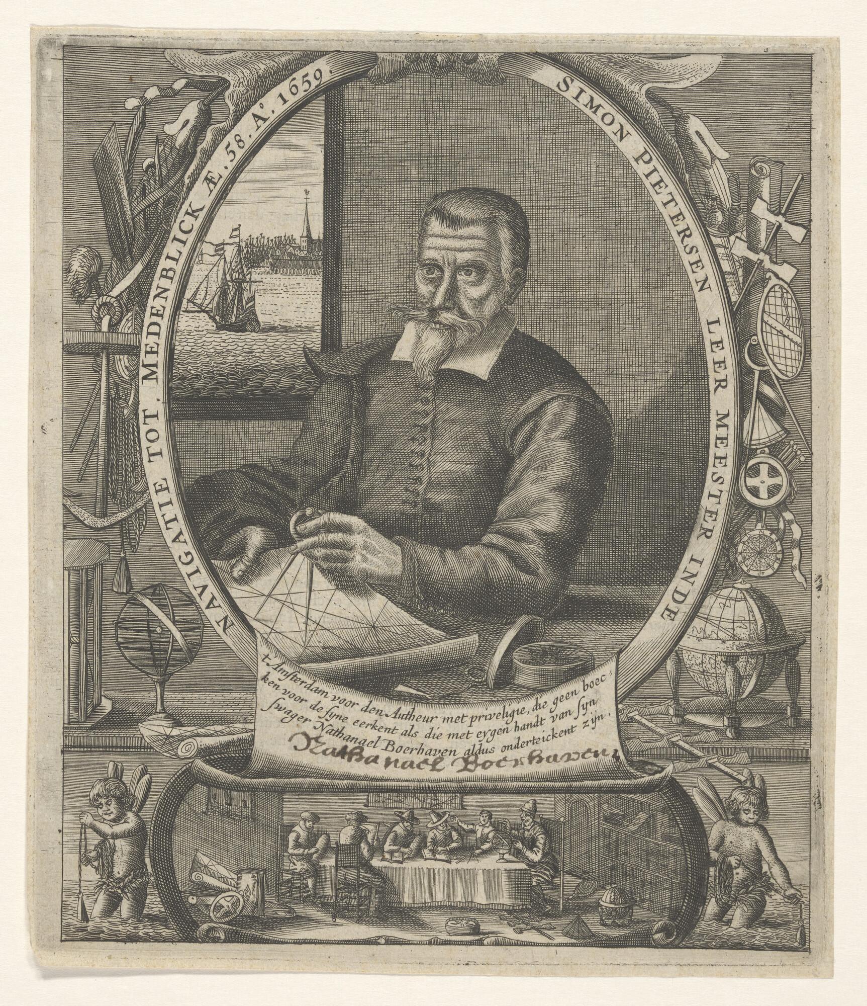 Portret van Simon Pietersen, leermeester zeevaartkunde te Medemblik. Titelprent van diens "Stuermans schoole".