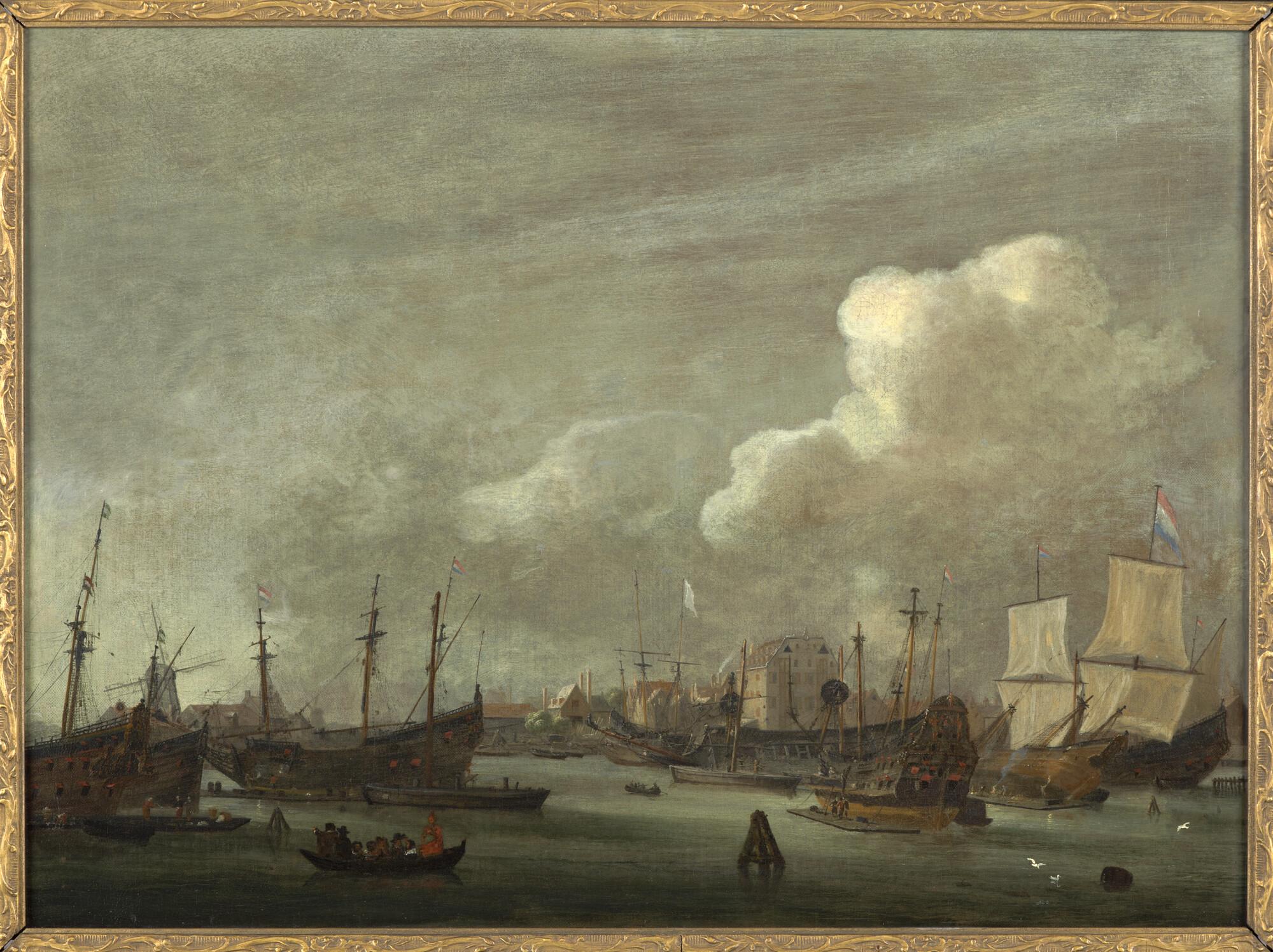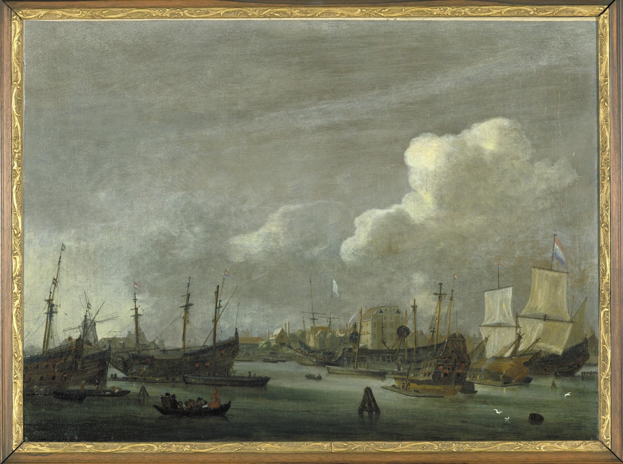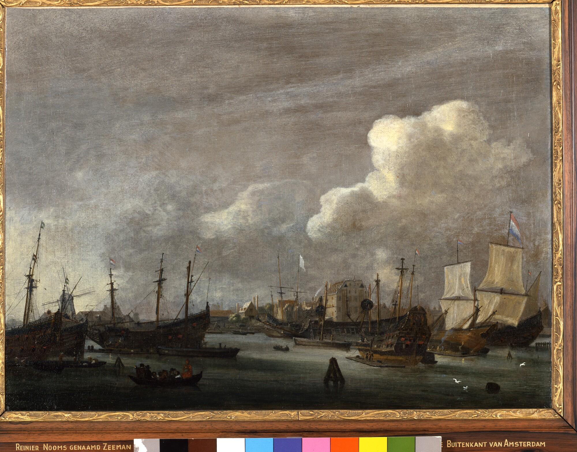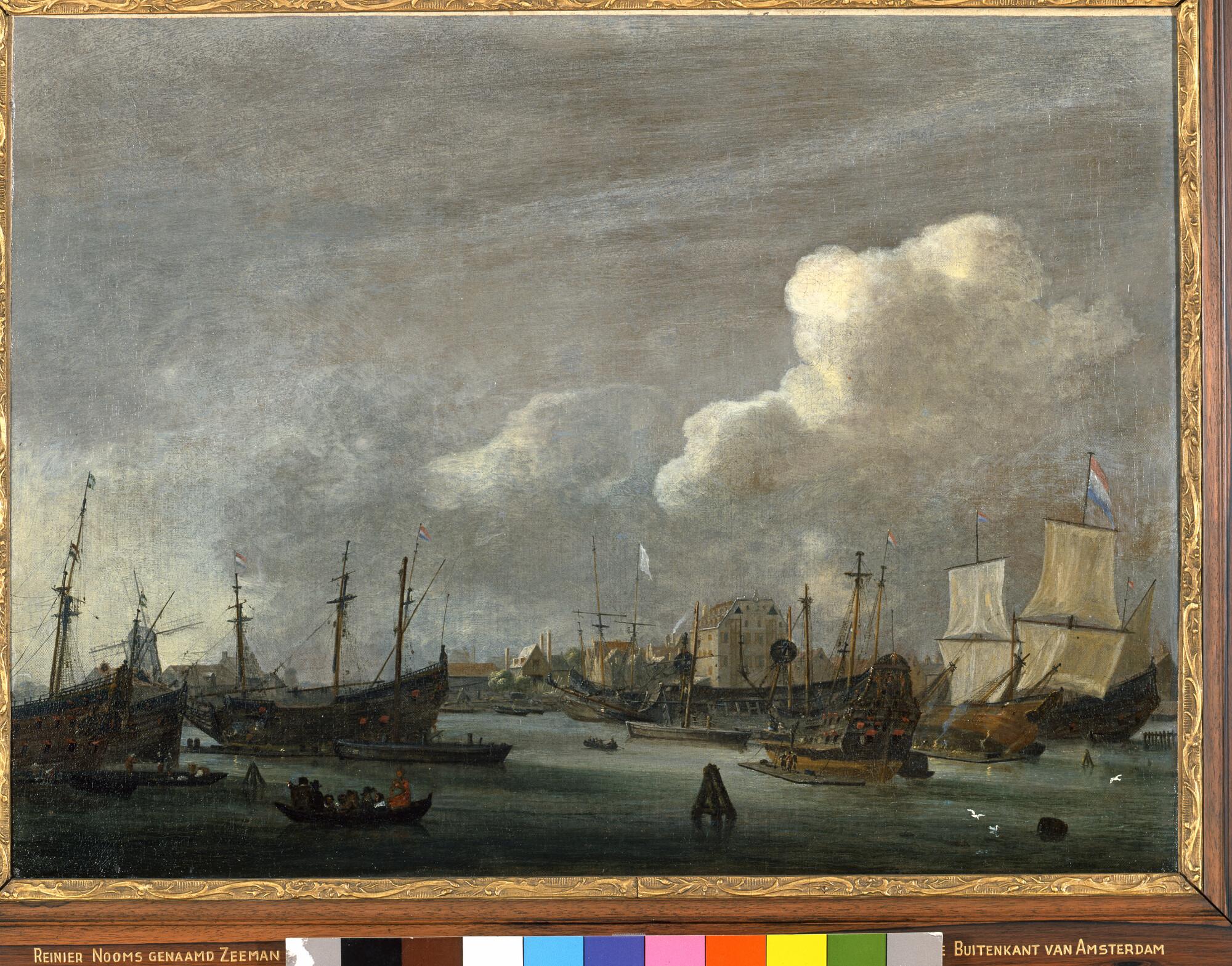 Schilderij in lijst van de Buitenkant bij het eiland Rapenburg te Amsterdam, gezien vanaf het IJ, met links het bolwerk Rijsenhoofd en midden het pakhuis van de West-Indische Compagnie, het latere Willige Rasphuis en aan het eind van de achttiende eeuw het eerste gebouw van de Kweekschool voor de Zeevaart.