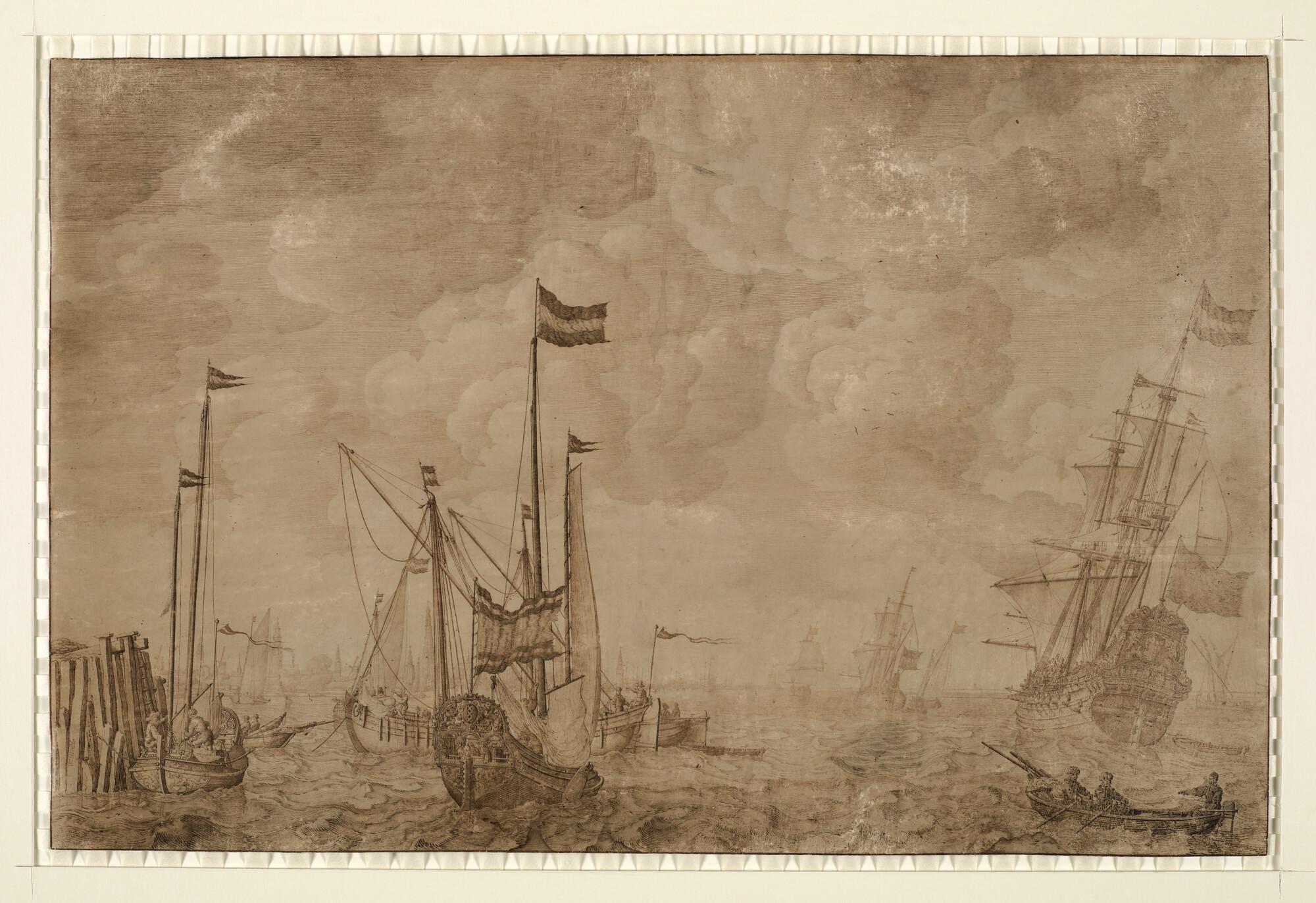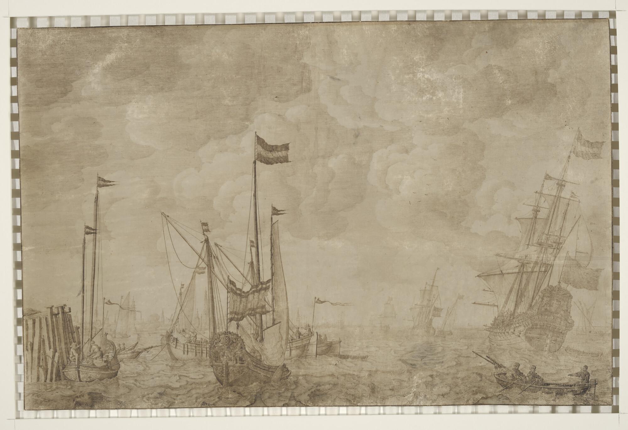 Gezicht op de rede van Amsterdam met verscheidene schepen, waaronder een jacht en een driemaster. Links ligt een sloep afgemeerd aan een zeewering. Op de achtergrond zijn de contouren van Amsterdam zichtbaar.