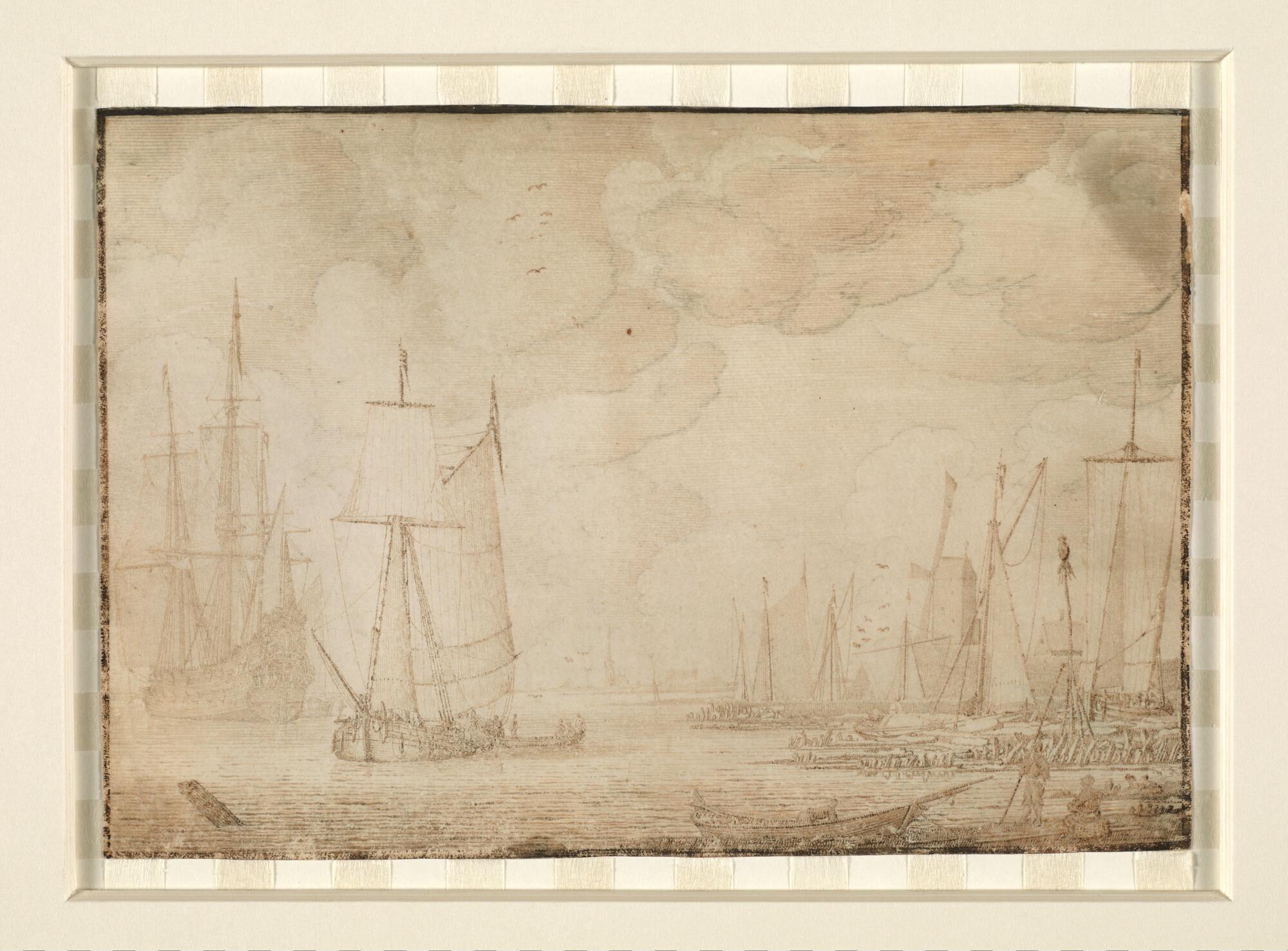 Een sloep ligt langszij een vrachtschip. Op de achtergrond ligt een oorlogsschip. Voor een vestingwal met daarop een windmolen liggen meerdere schepen voor anker. Op de voorgrond staan twee mannen op de oever bij een weischuit. In het water op de voorgrond steekt een paal uit het water.