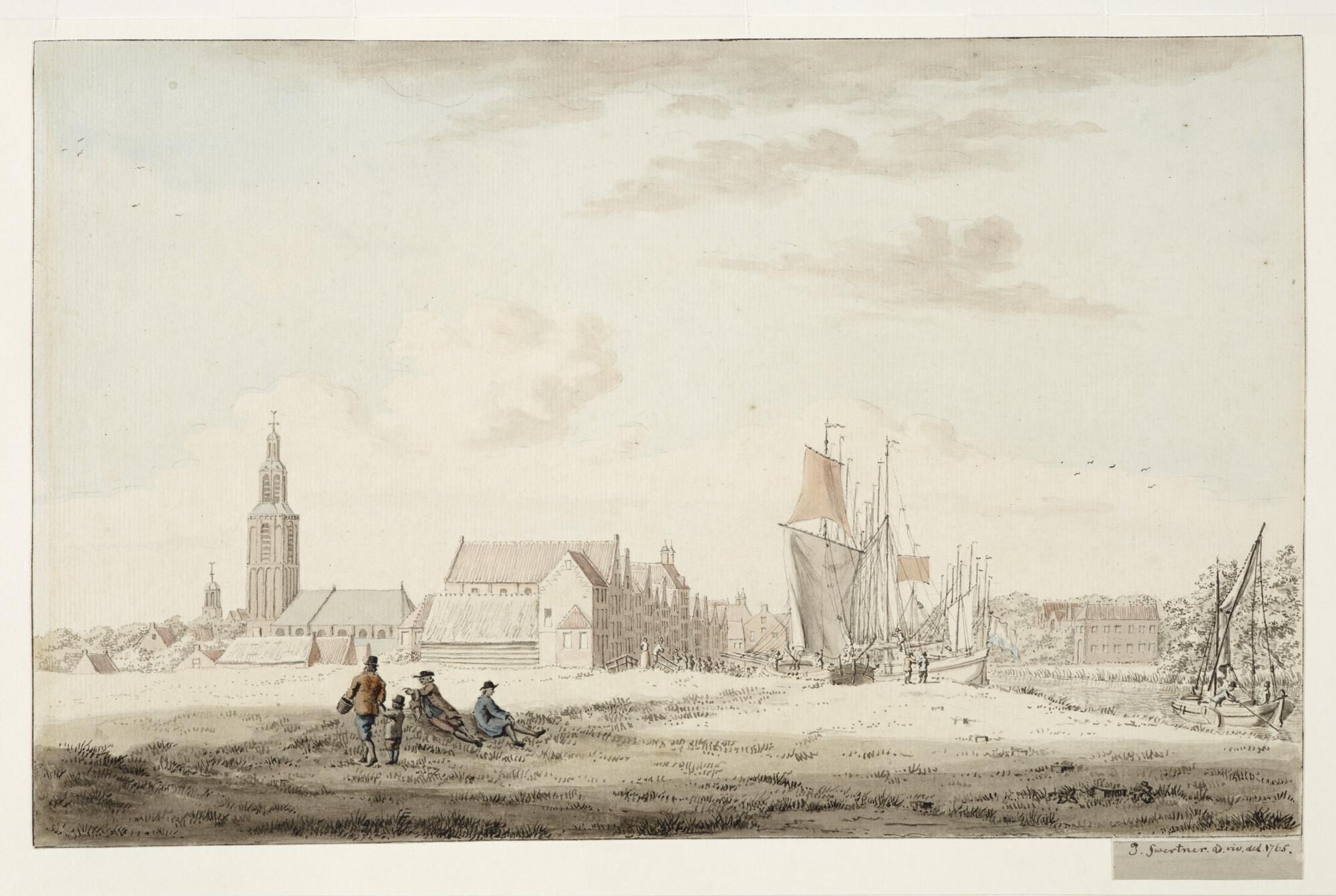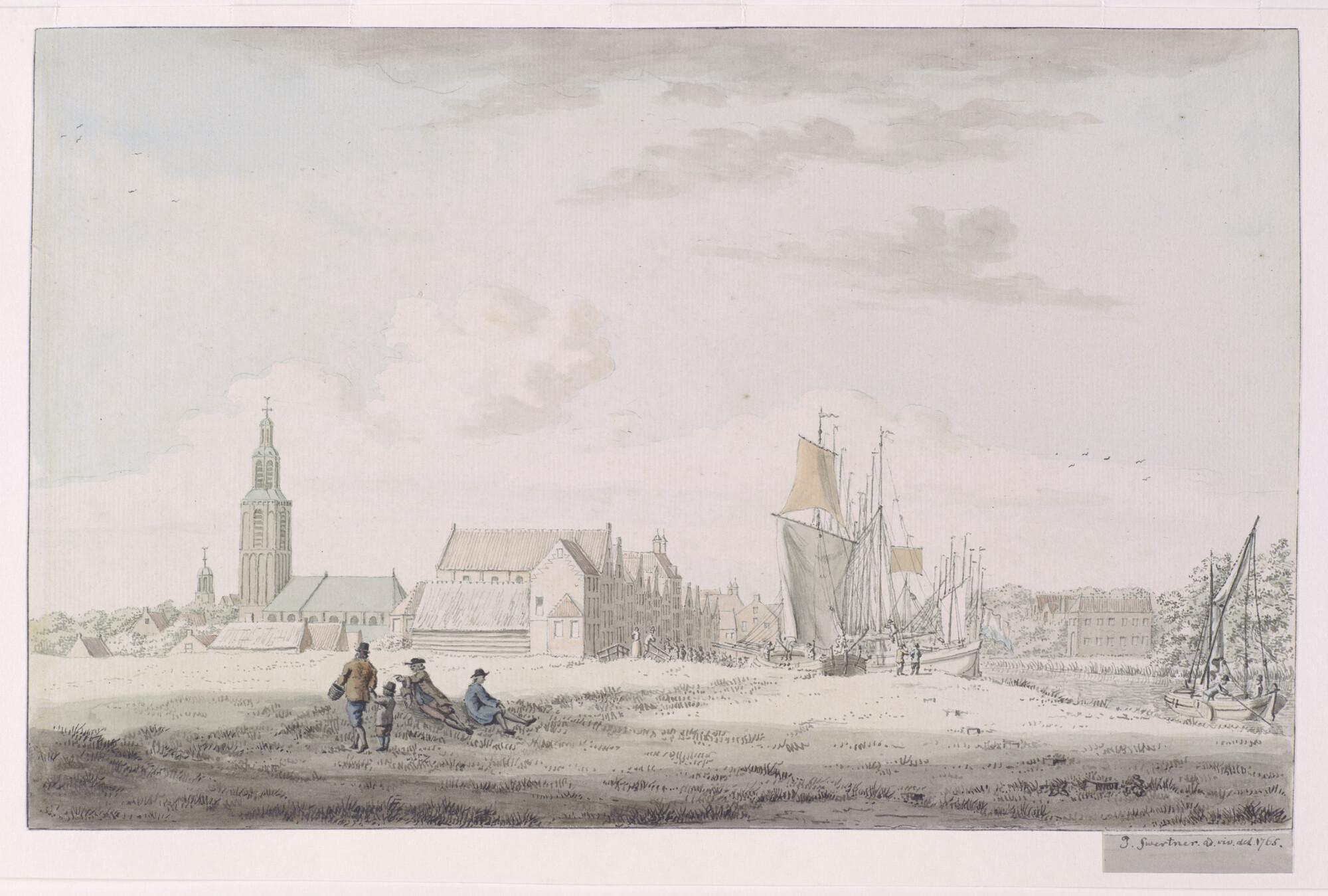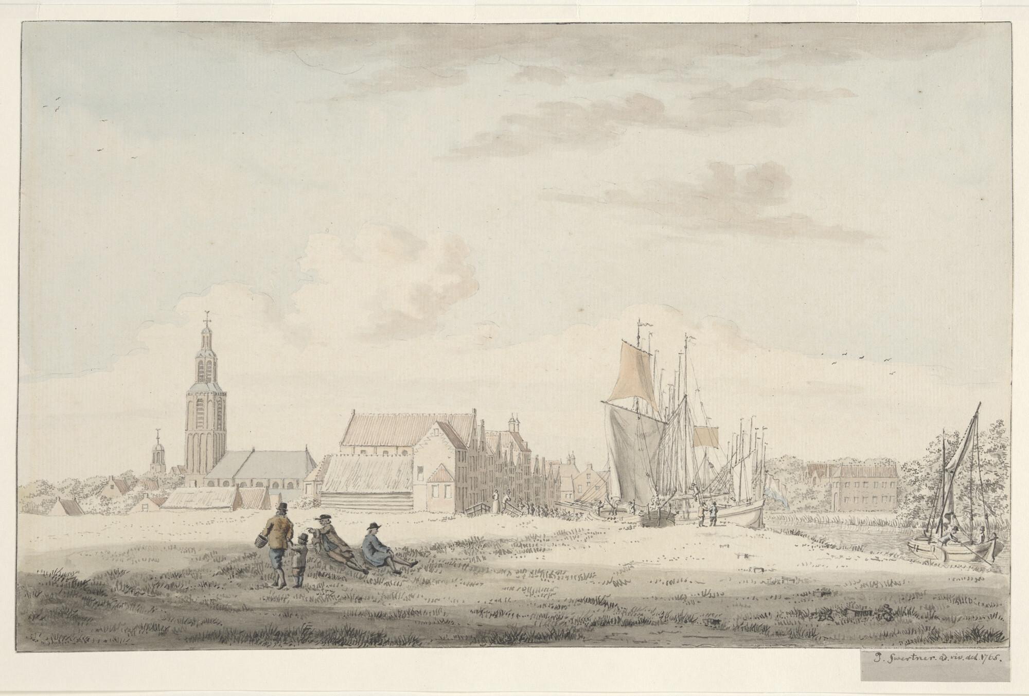 Gezicht op de Westhavenkade in Vlaardingen. Buizen en hoekers maken zich gereed voor het nieuwe haringseizoen. Talloze mensen bekijken de schepen vanaf de kade. Geheel links de toren van de Grote Kerk. Rechts de nog spaarzame bebouwing aan de Oosthavenkade. In het midden op de achtergrond het Huis met de Lindeboom; de woning van de ...