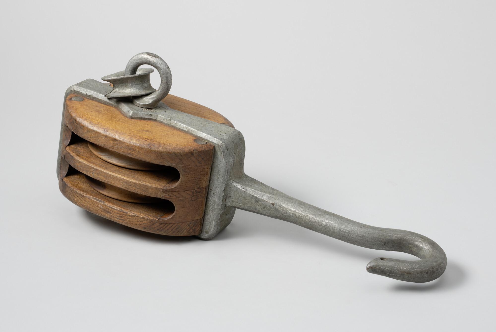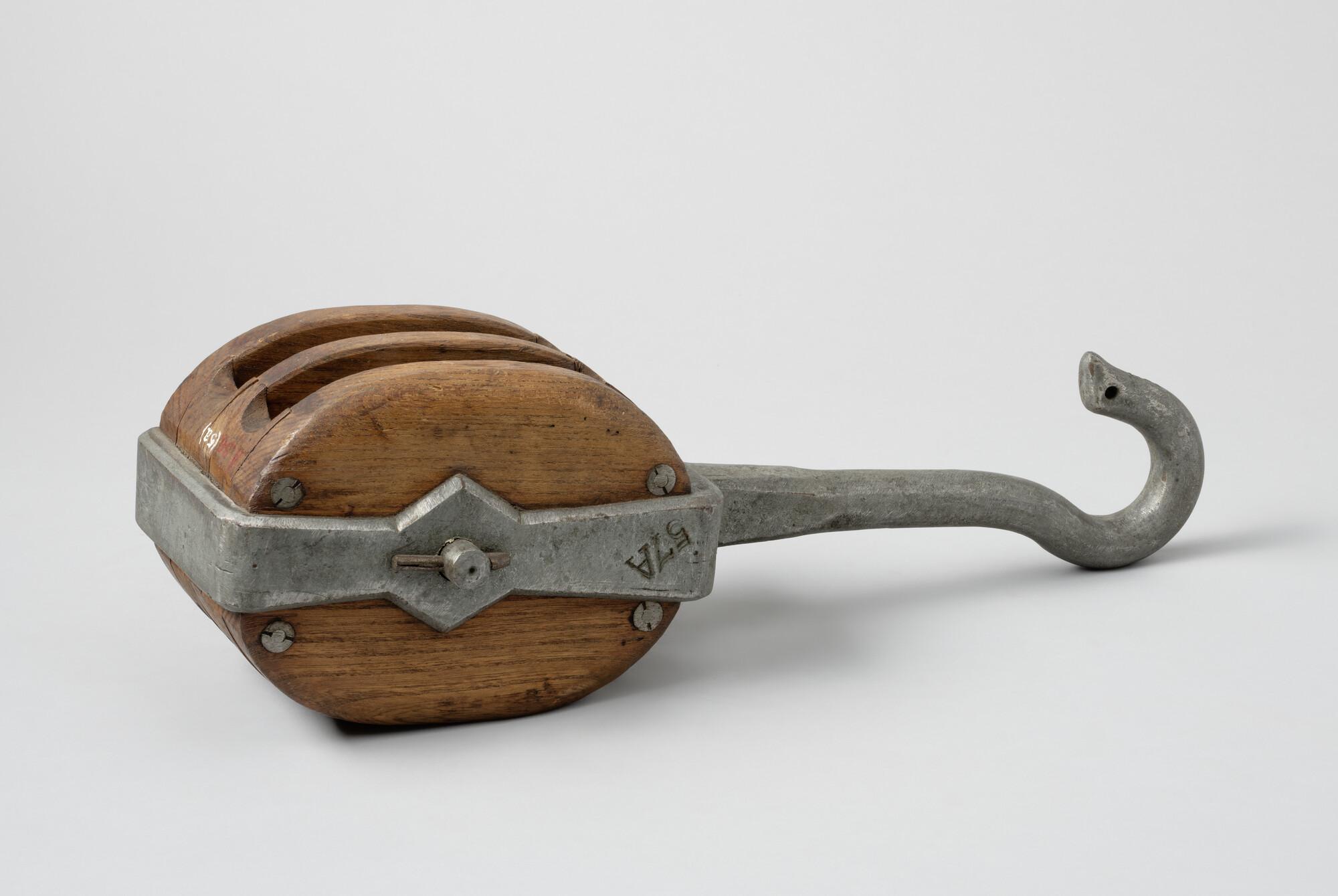 Iepenhouten blok met pokhouten schijven, ijzeren nagel met aan één kant oog met ovale kous. IJzerbeslag met lange vaste haak. Haak over schijven. Gemerkt: tweemaal gekruiste ankers; 20 in ijzer 57A en jaartal 1882. Gebruikt voor kluivervallen op loodskotters.
