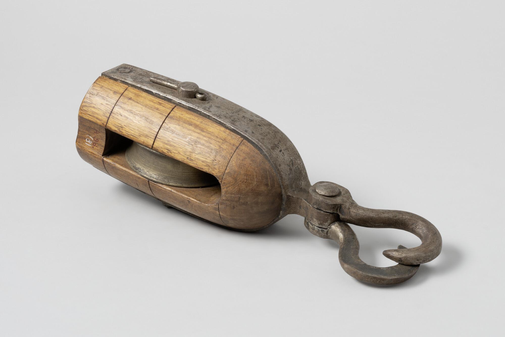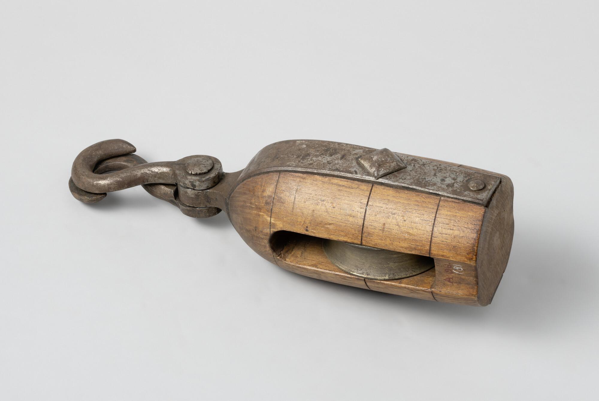 Iepenhouten schoothoornblok met bronzen schijf en ijzeren nagel. IJzer beslag. Met aan bovenkant zusterhaken. Blok gebruikt voor kluiveruithaler op loodskotters.
