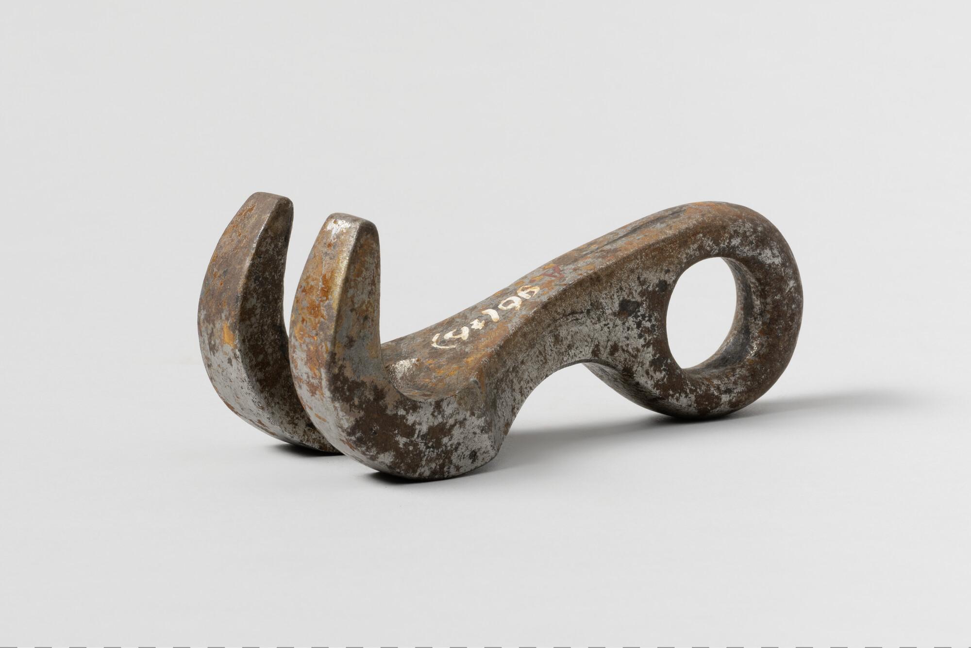 Harp, ijzer, oog aan bovenkant, aan onderkant twee haken dwars op oog. Voor ketting van 17 mm.