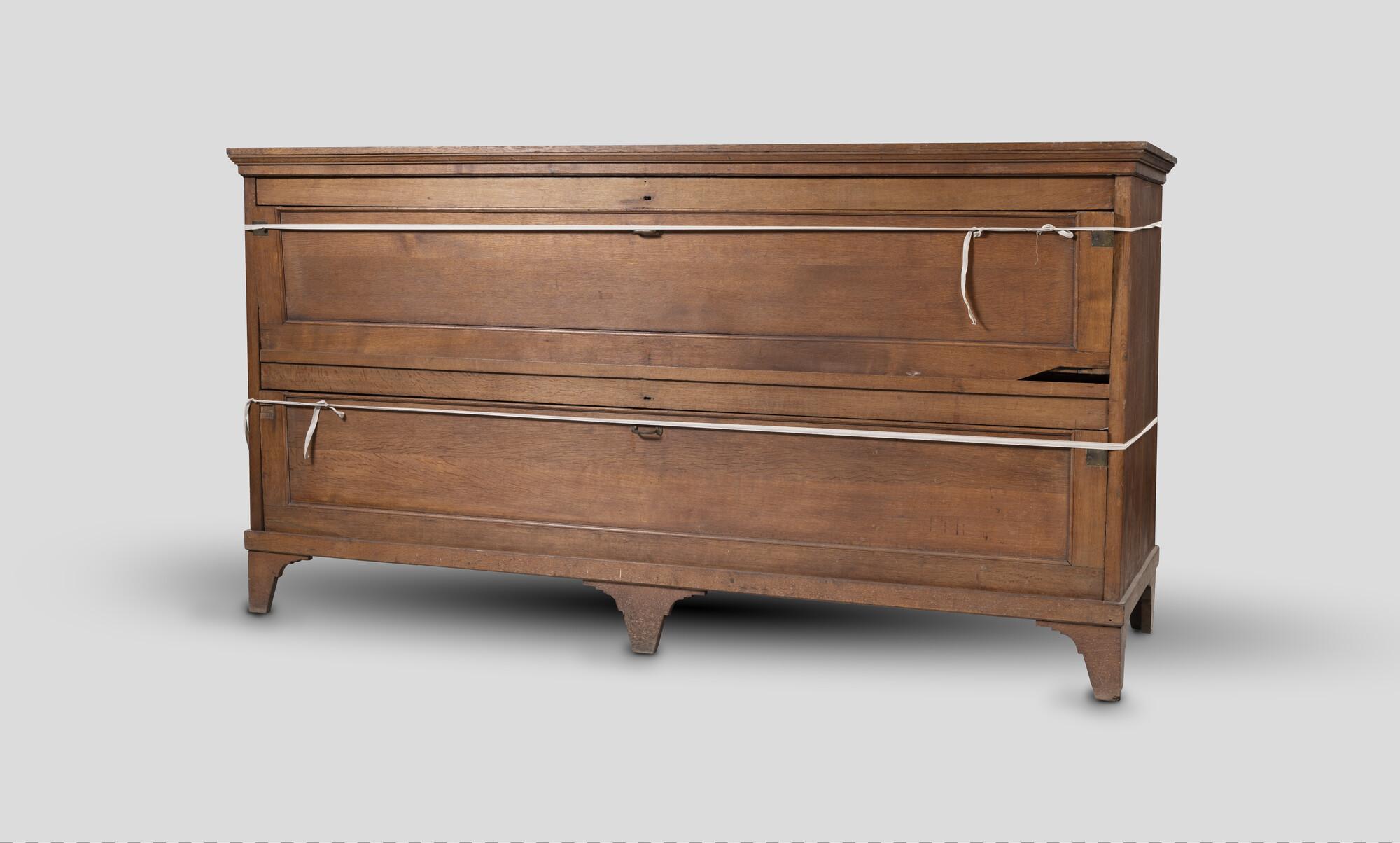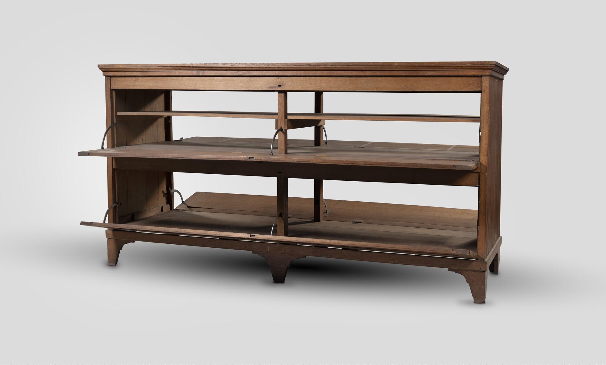 Eikenhouten kaartenkast in twee afdelingen, aan beide kanten te gebruiken, met planken en vier grote secretaire kleppen. Deze kast heeft gediend in het grote kaartenmagazijn van de firma Van Keulen, Damrak hoek Nieuwebrugsteeg