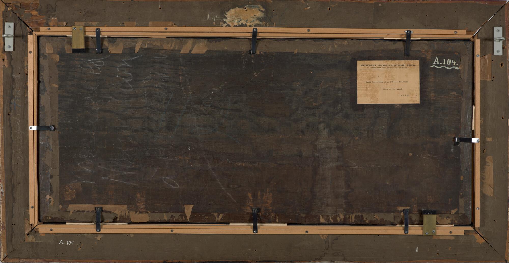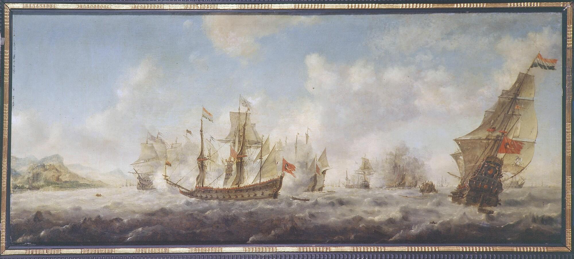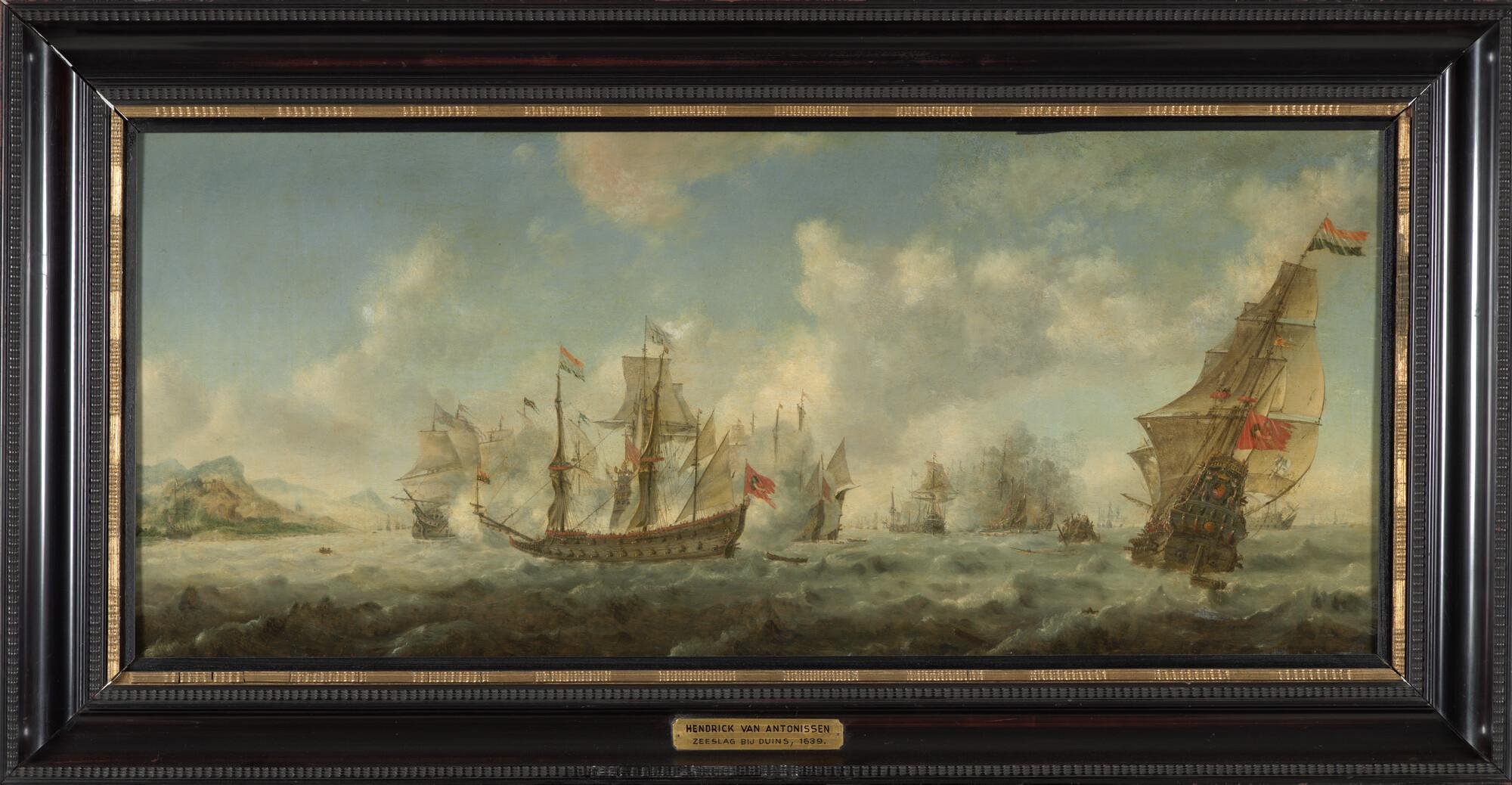 De Zeeslag bij Duins, 21 oktober 1639. Op de voorgrond de Aemilia, het vlaggeschip van Maarten Harpertsz. Tromp, in het midden het vlaggeschip van Cornelis Evertsen, met bloedvlag.