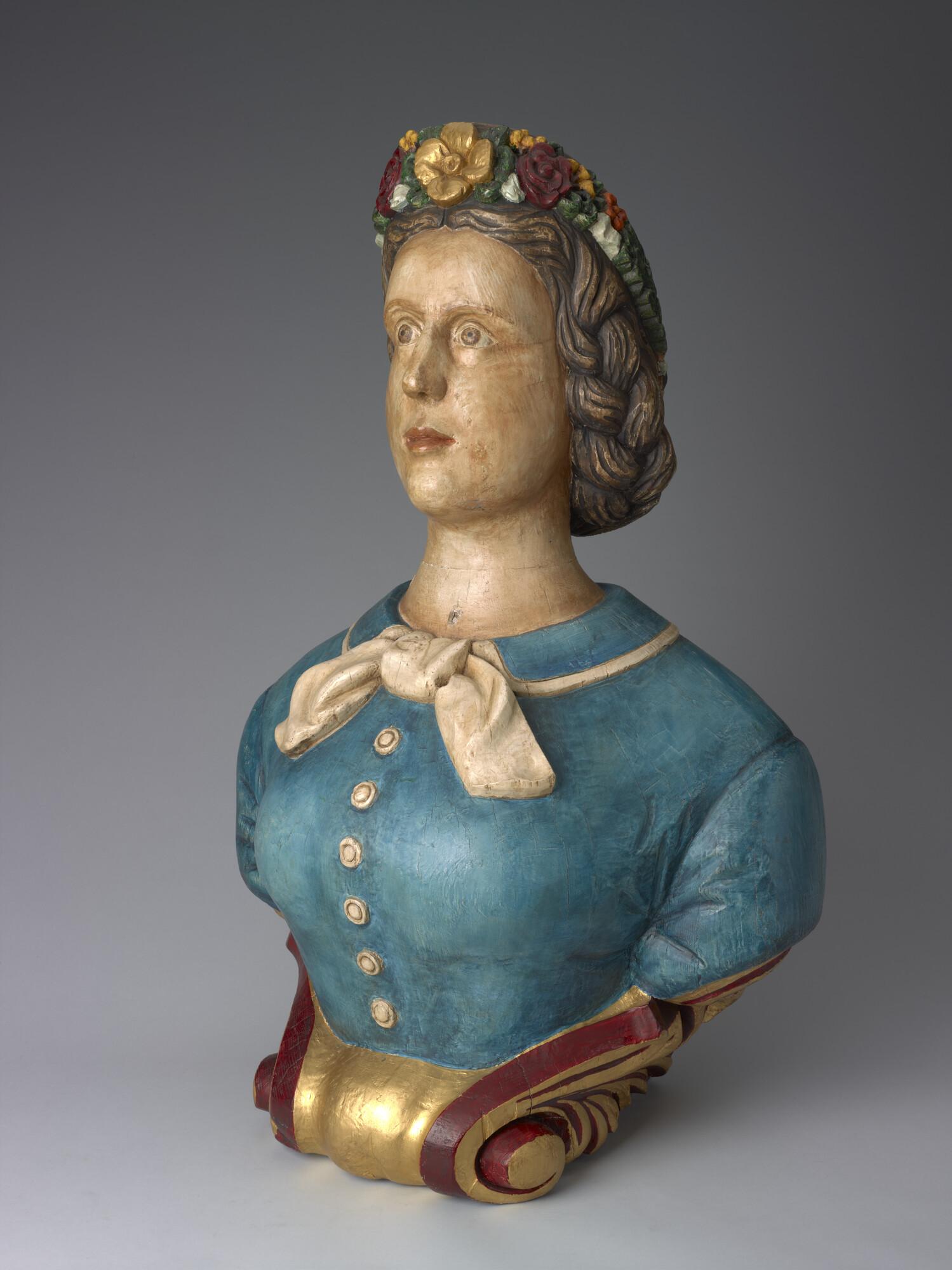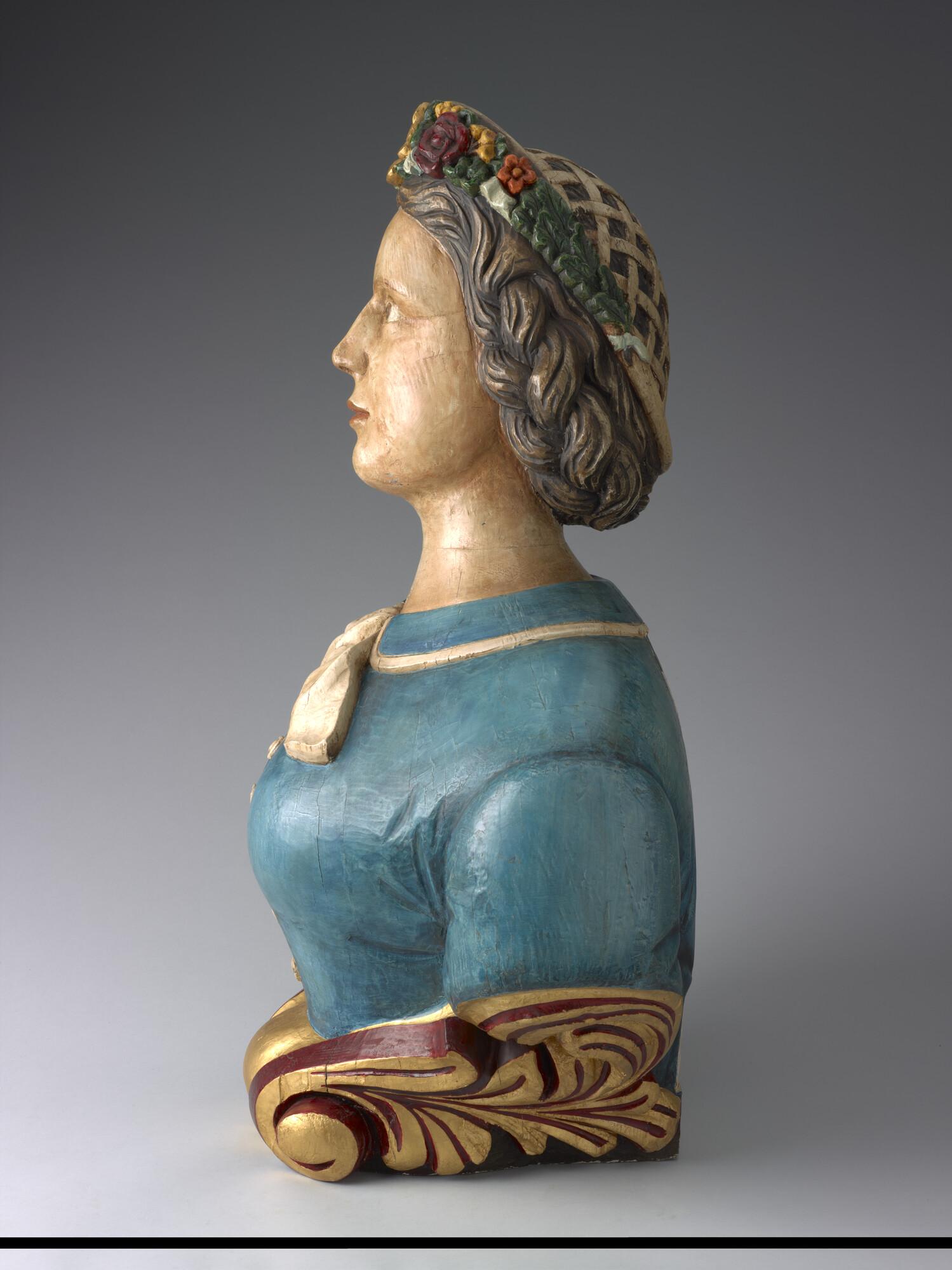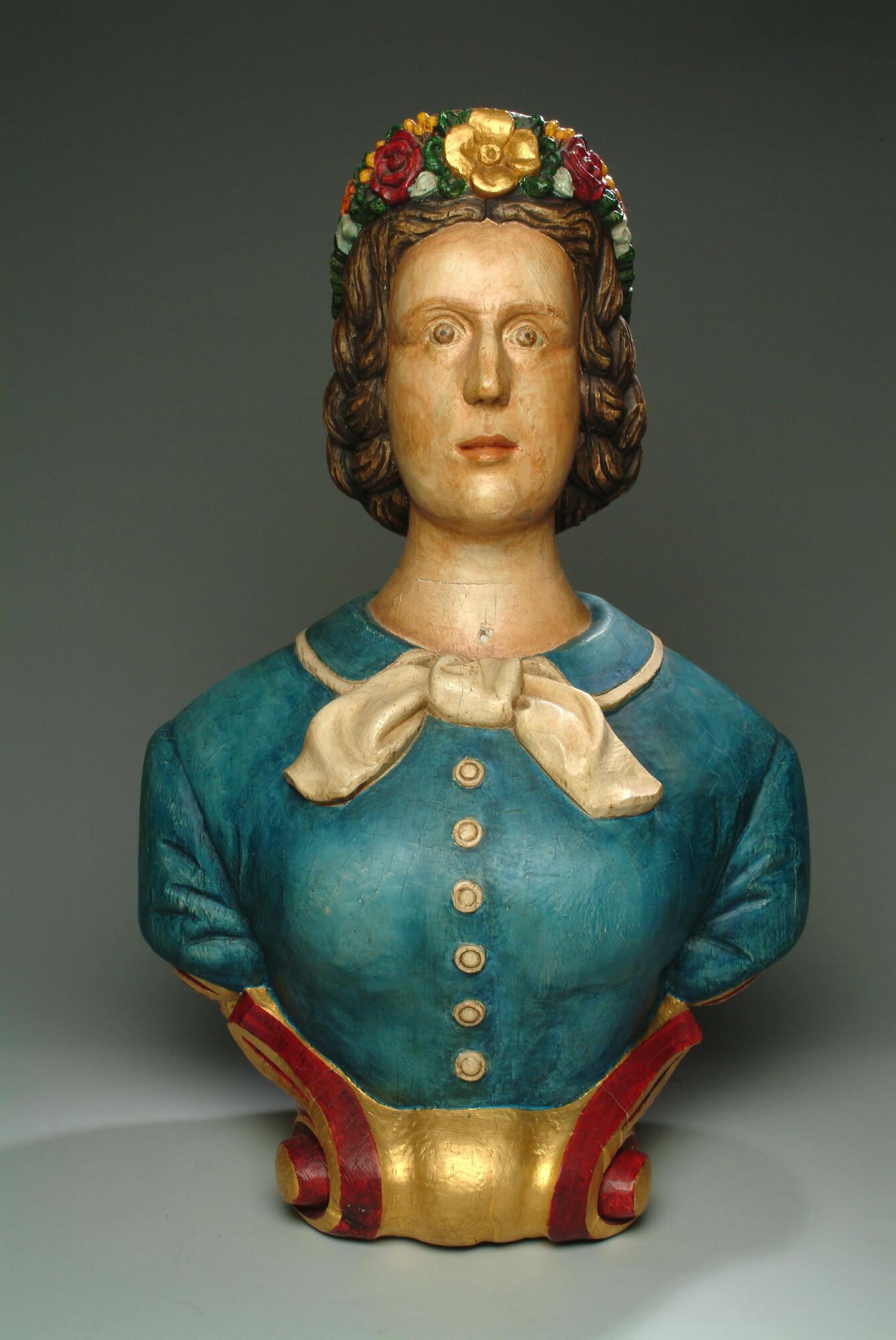 Schegbeeld (heupstuk) in de vorm van een vrouwenfiguur, met gekruld bruin haar bijeengehouden door een bonnet met aan zij- en voorkant een bloemenversiering.