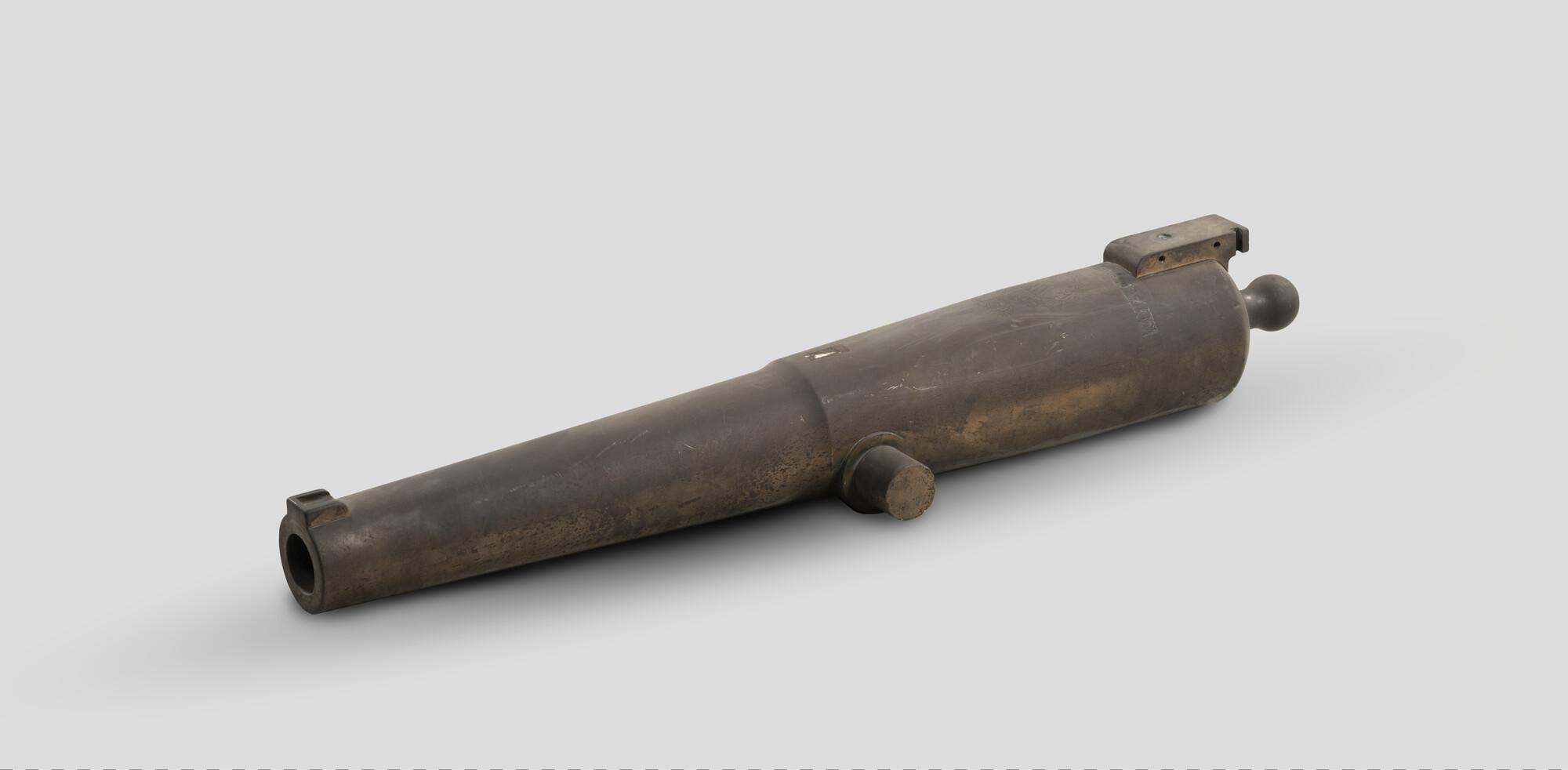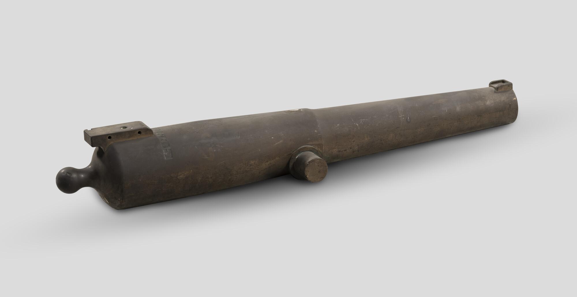 Kanon, gemerkt op het lange veld: 's Hage 1884 onder een door een lauwerkrans omgeven Koninklijke W. Gemerkt op de linkertap N 70 K.G. 97. Is gebruikt op een recherchevaartuig.