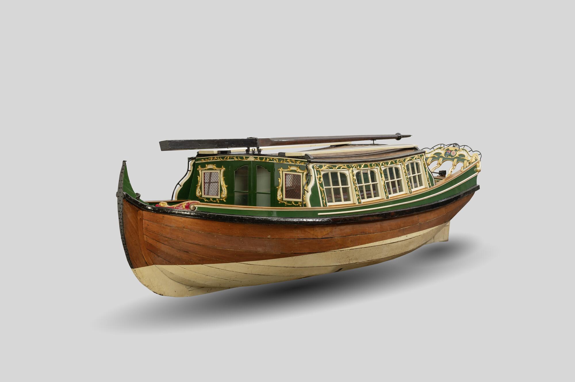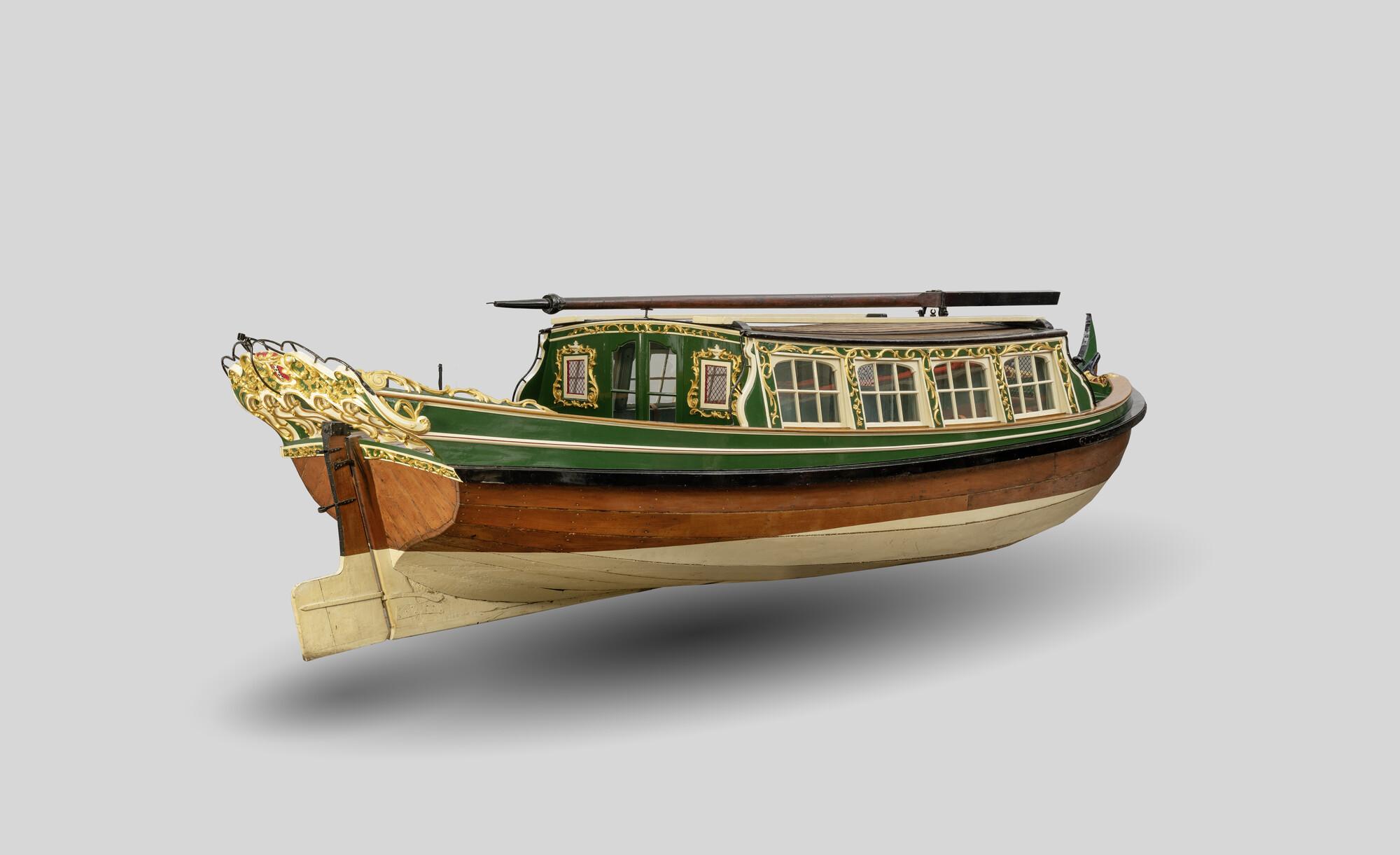 Trekjacht. Aan de buitenkant van de spiegel het wapen van Amsterdam. Aan de binnenkant van het hek staan de wapenschilden van twee echtgenoten (Crone en MacFairlane), aangebracht bij de restauratie in opdracht van G.C.E. Crone. Aan de buitenkant van het hek de drie Andreaskruisen van de stad Amsterdam. Met bijbehorende mast.