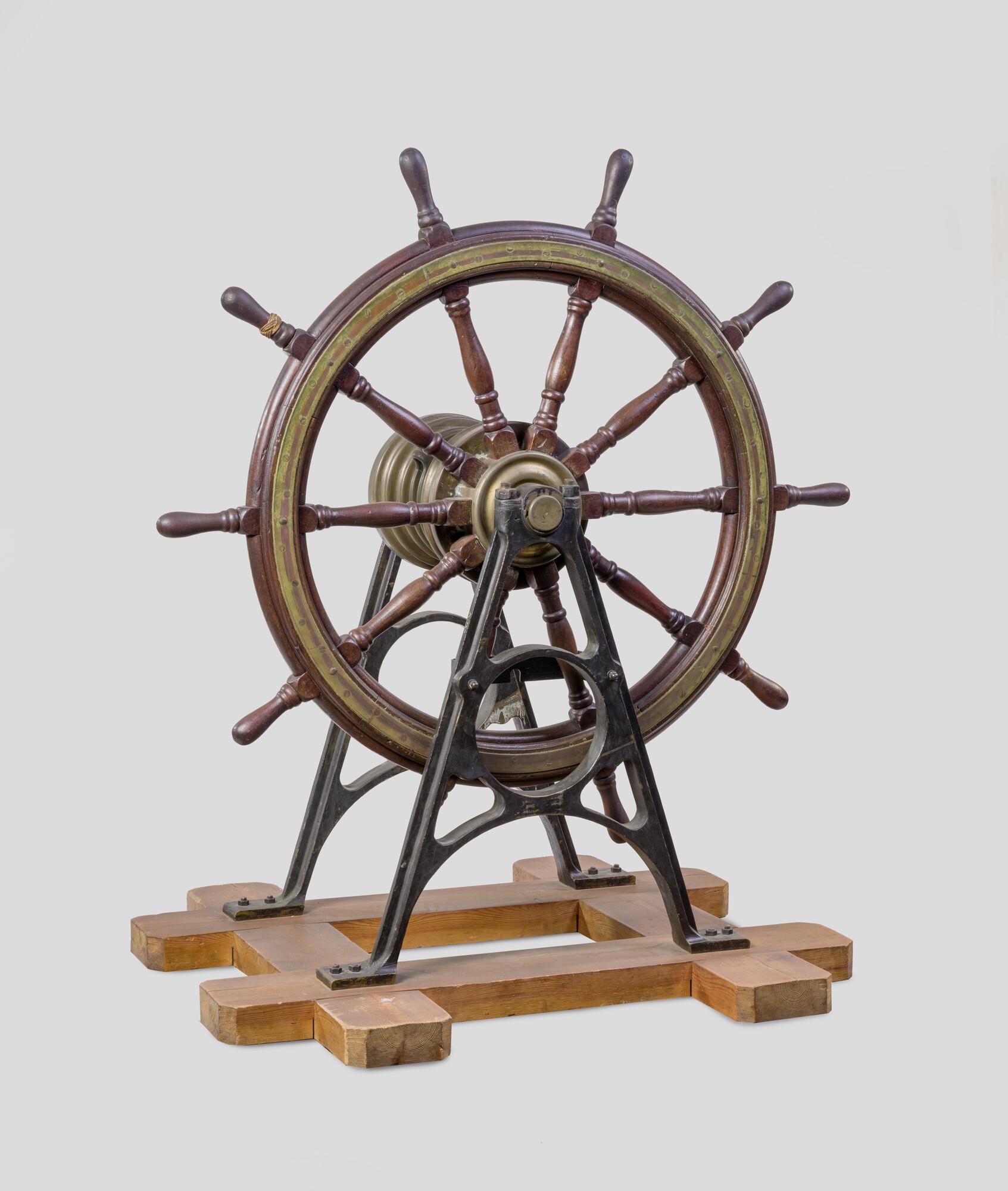 Stuurrad met holle trommel op twee bronzen stoelen gemonteerd. Afkomstig van een stoomkanonneerboot met vooruit wijzende roerpen.