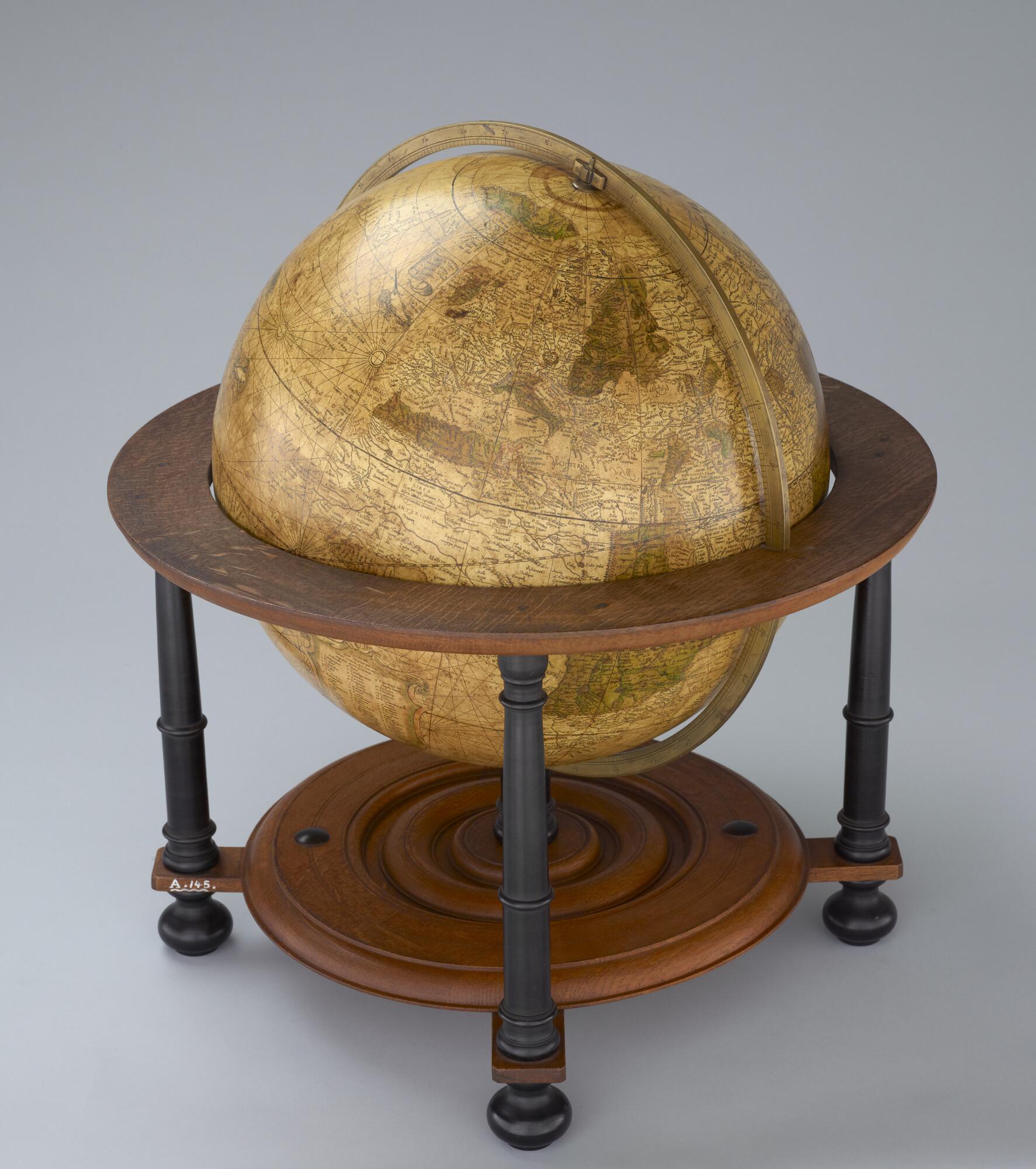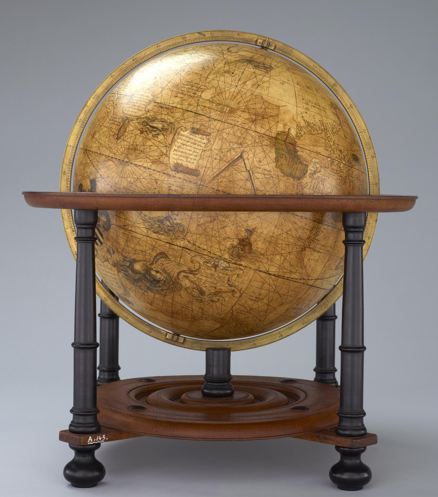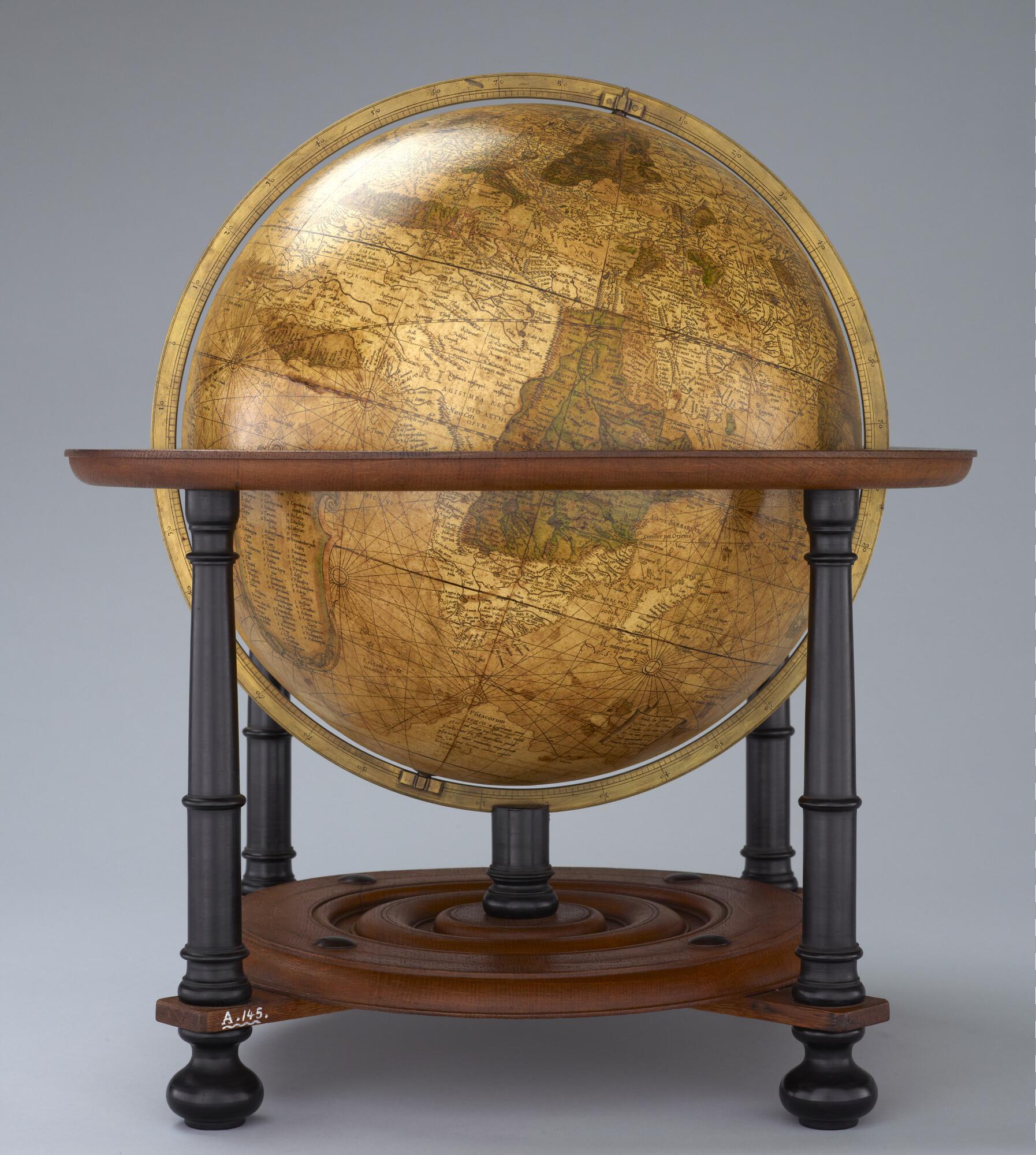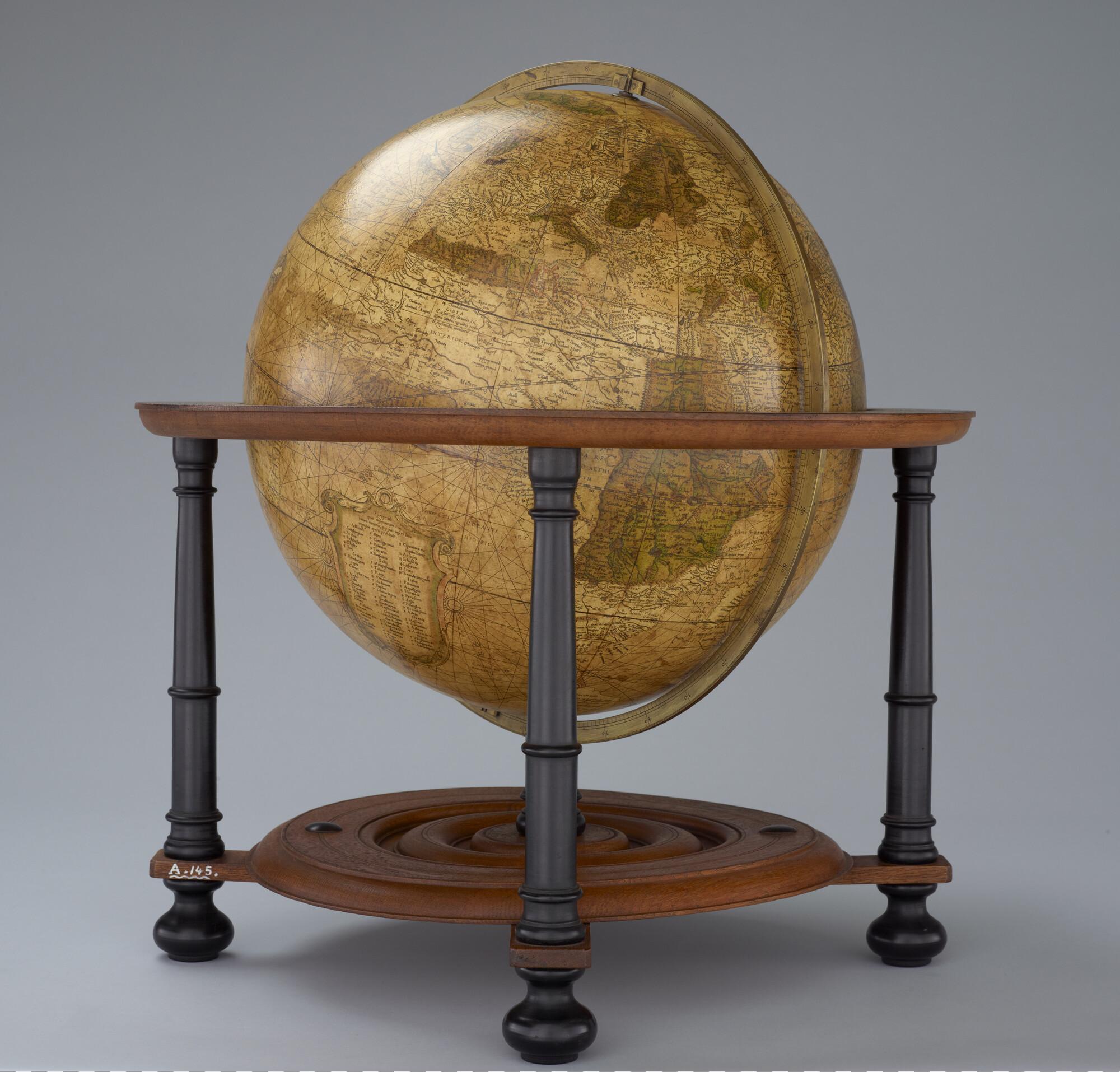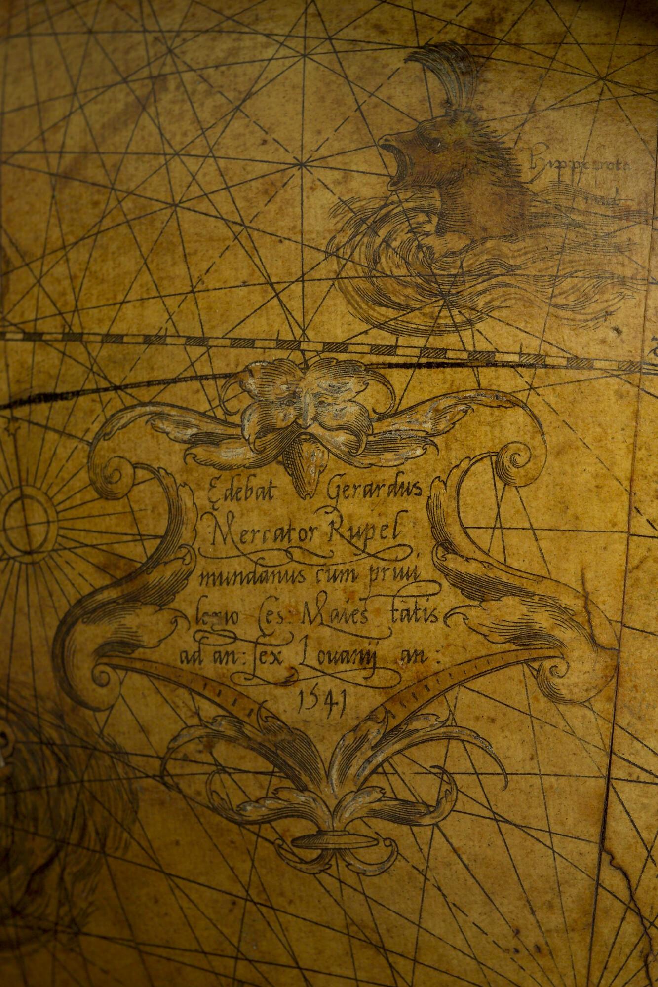 Aardglobe van 42 cm. in doorsnede door Gerard Mercator, 1541. Waarschijnlijk een facsimile uit 1875 gemaakt met behulp van de in dat jaar gepubliceerde globesegmenten op ware grootte. De oorspronkelijke globe is opgedragen aan Nicolas Perrenot de Granvelle, bisschop van Attrecht (schaal 1:30.500.000).