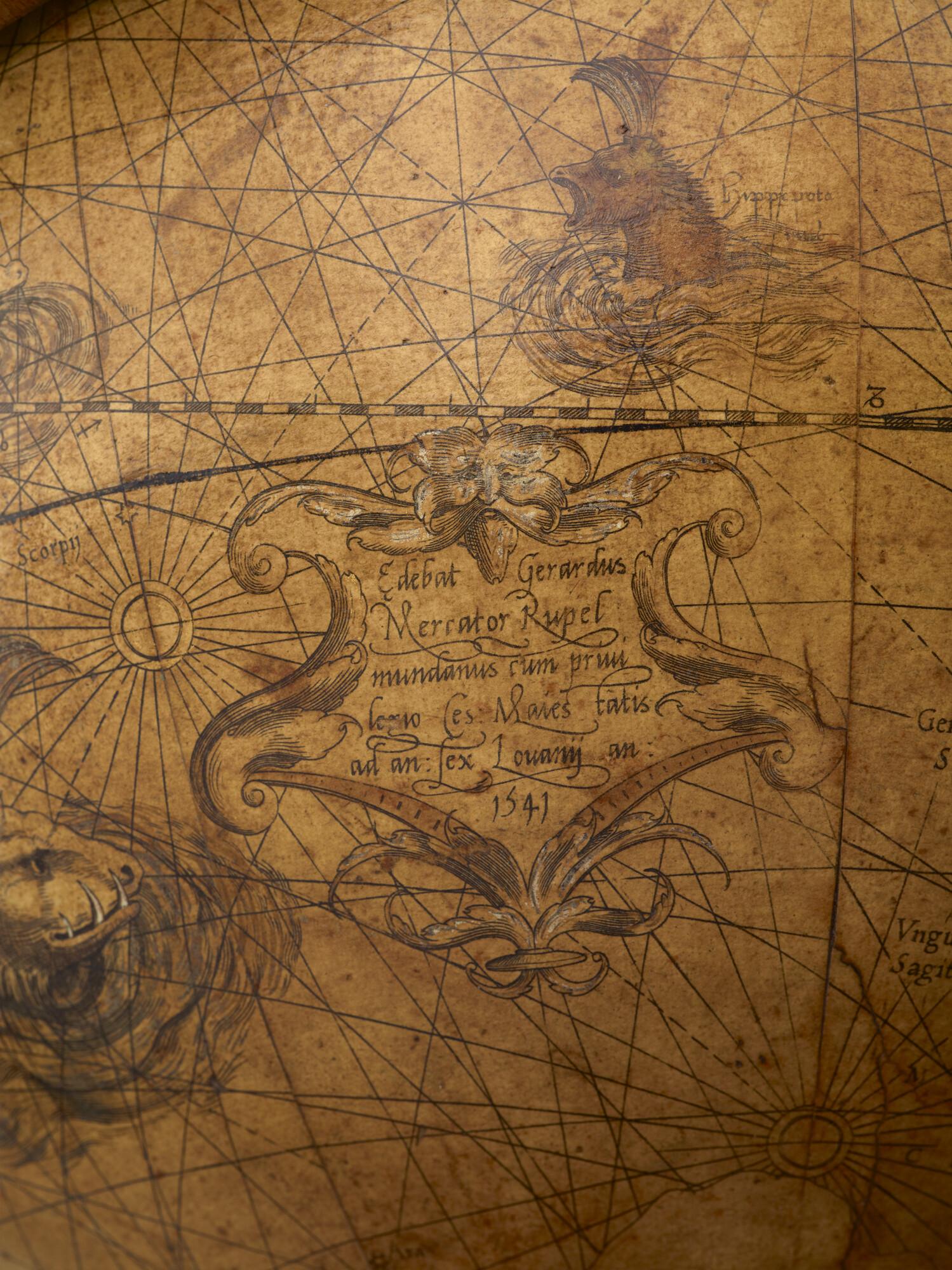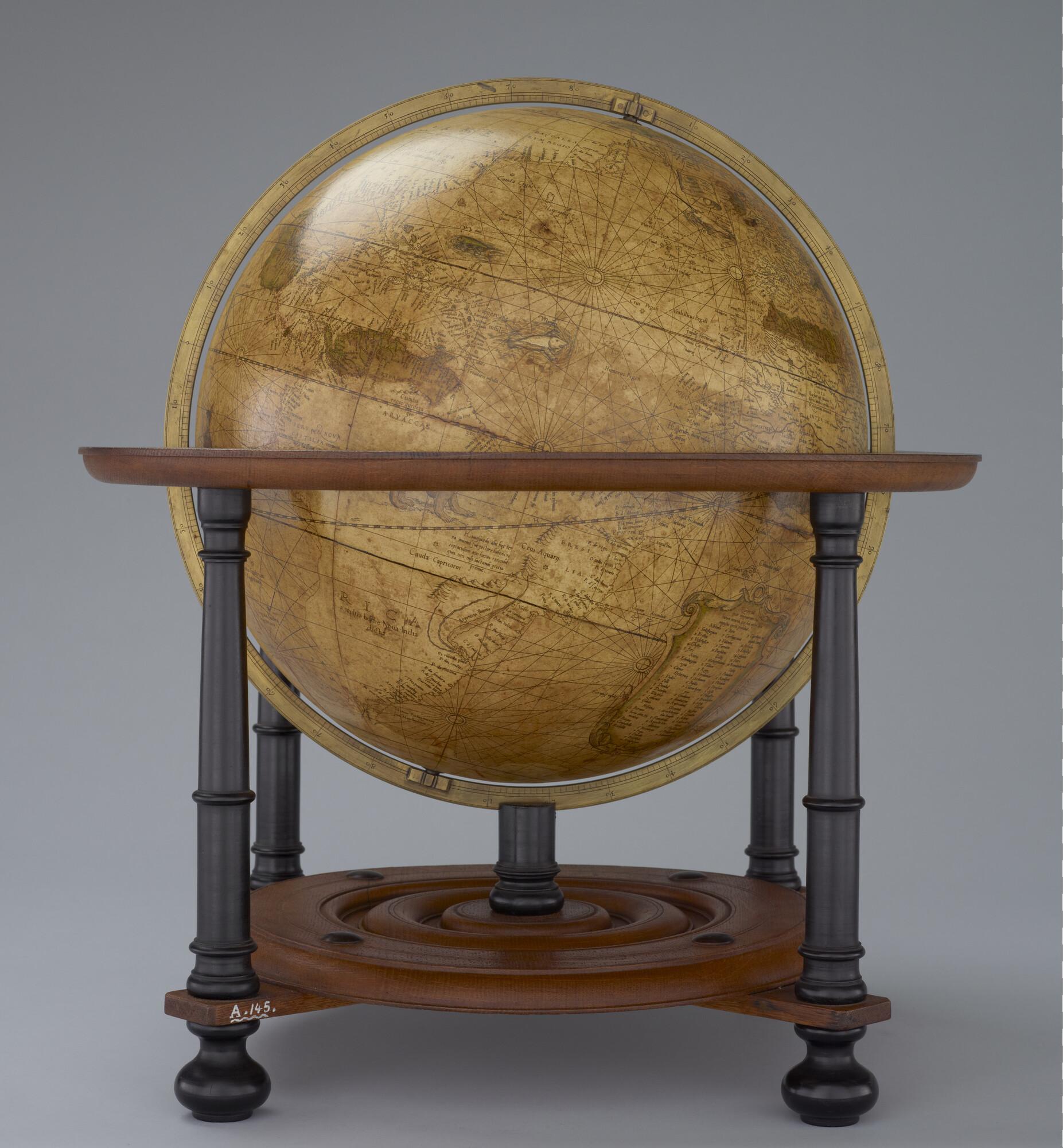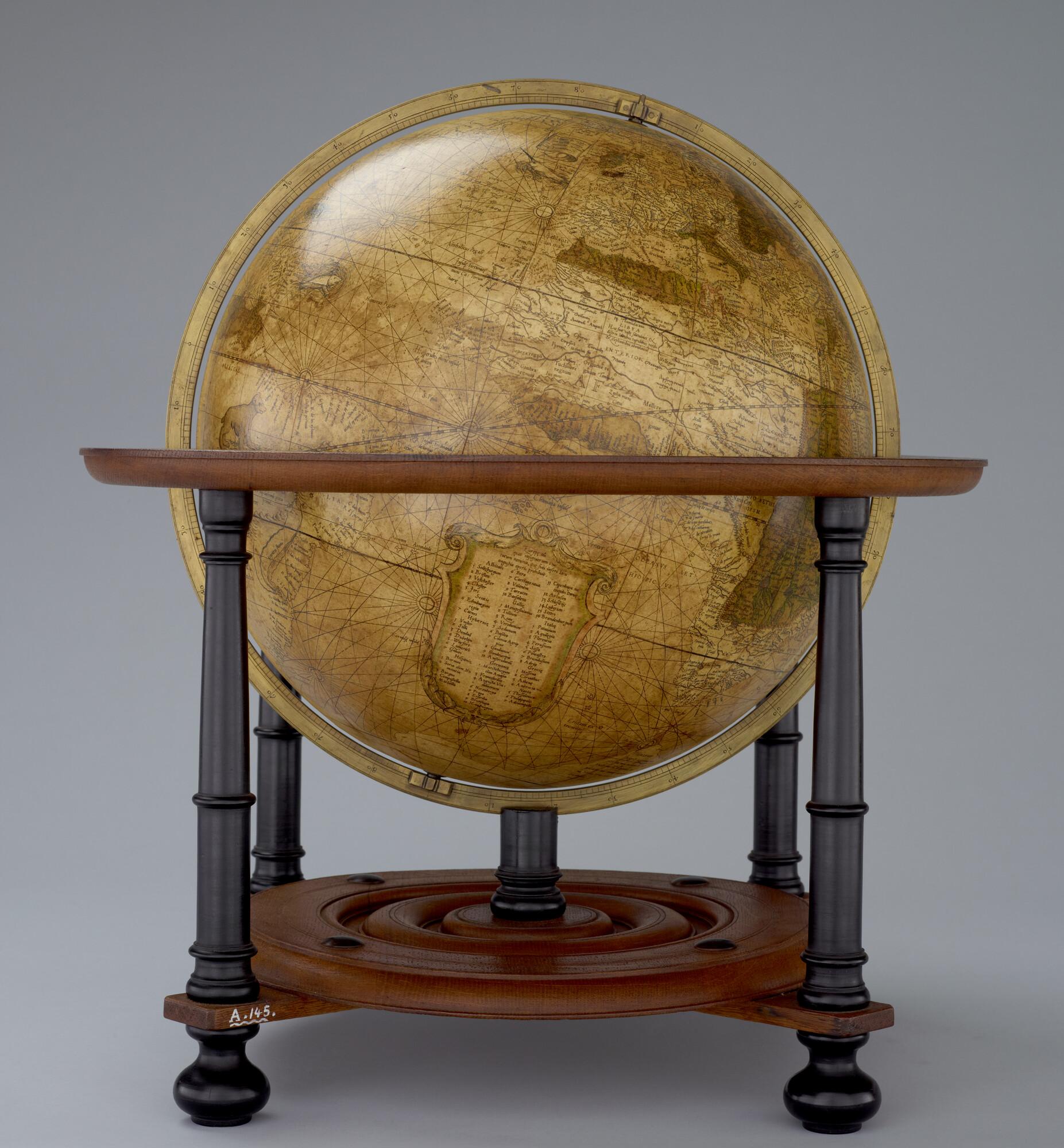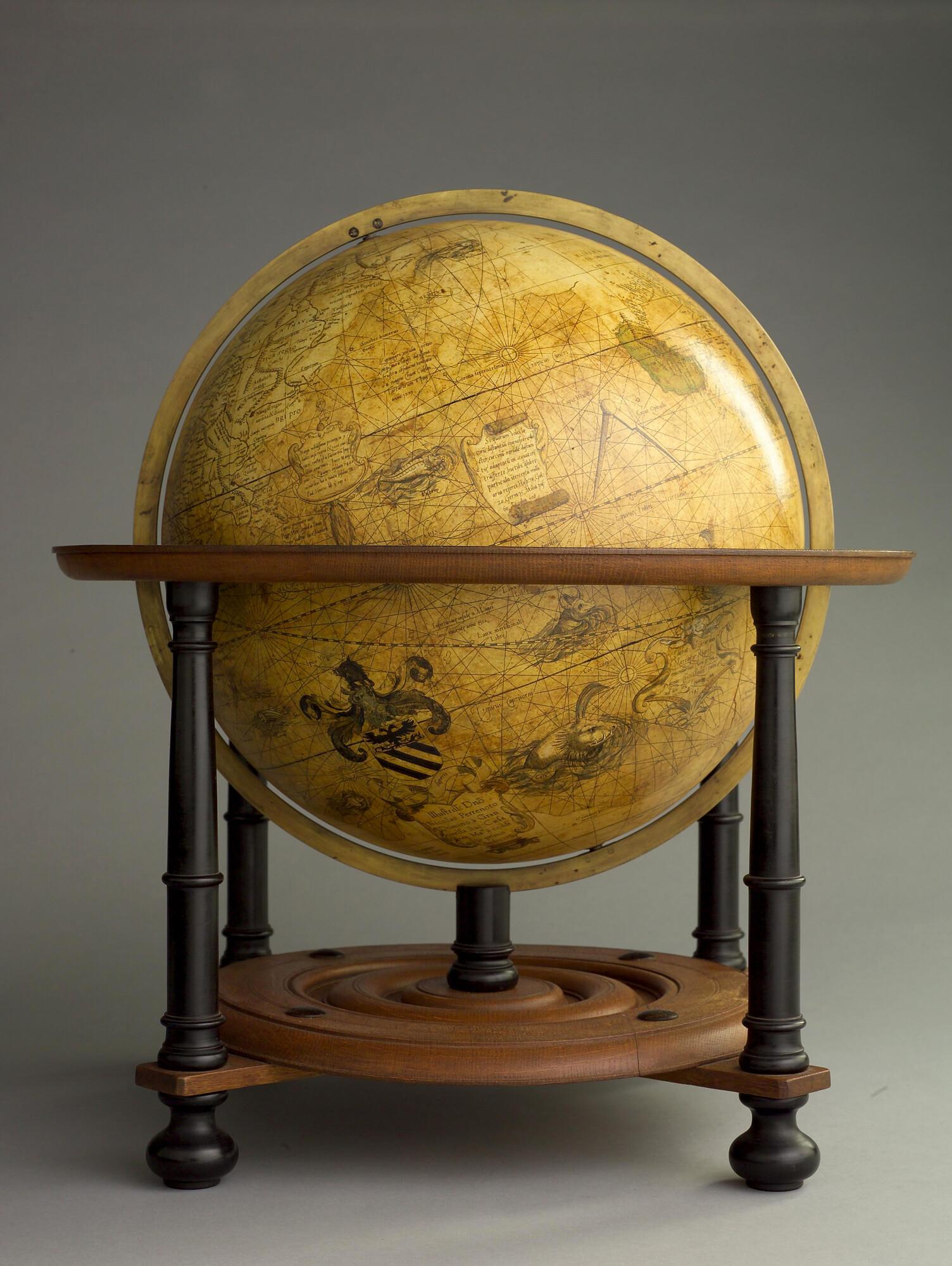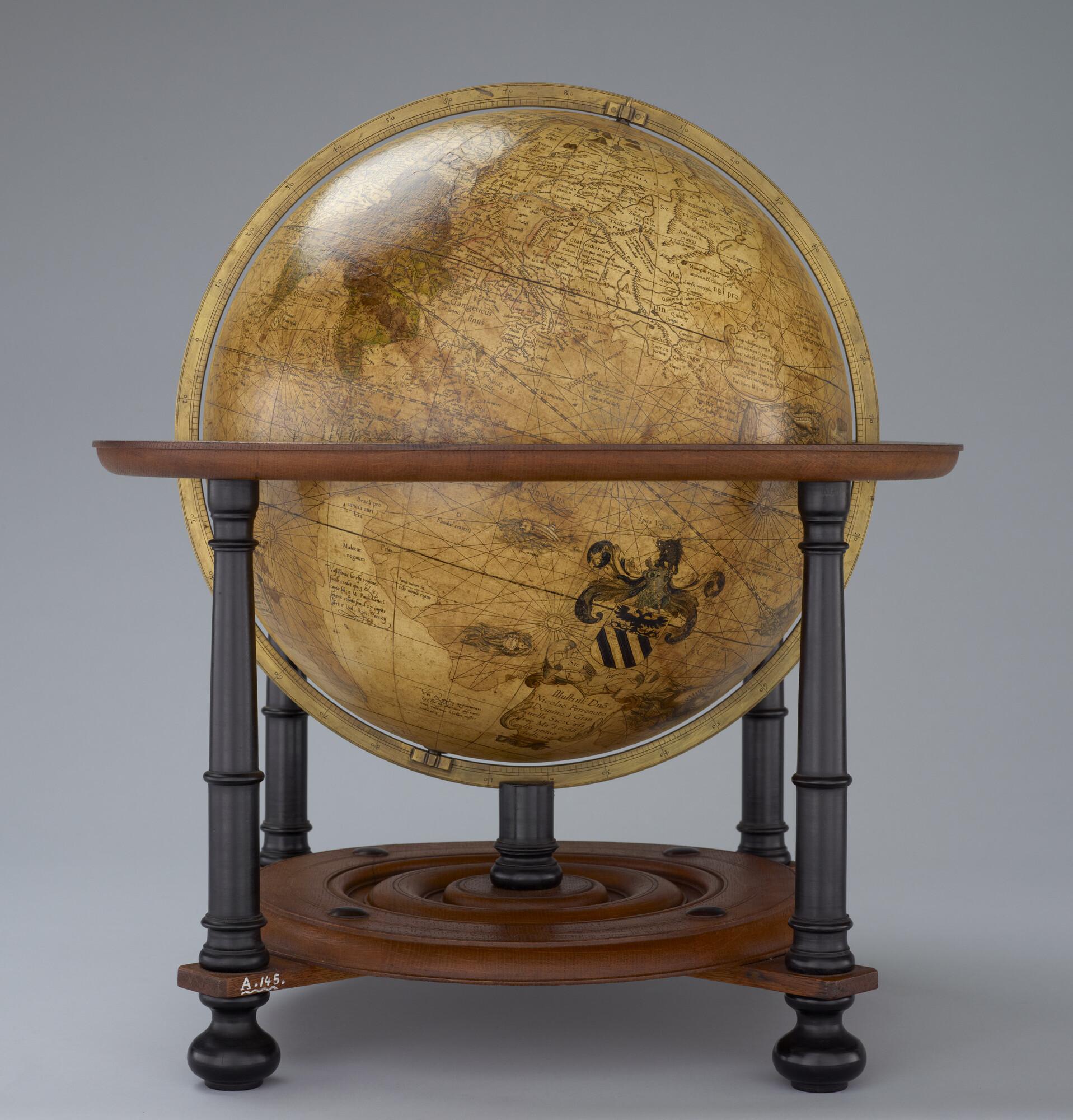 Aardglobe van 42 cm. in doorsnede door Gerard Mercator, 1541. Waarschijnlijk een facsimile uit 1875 gemaakt met behulp van de in dat jaar gepubliceerde globesegmenten op ware grootte. De oorspronkelijke globe is opgedragen aan Nicolas Perrenot de Granvelle, bisschop van Attrecht (schaal 1:30.500.000).