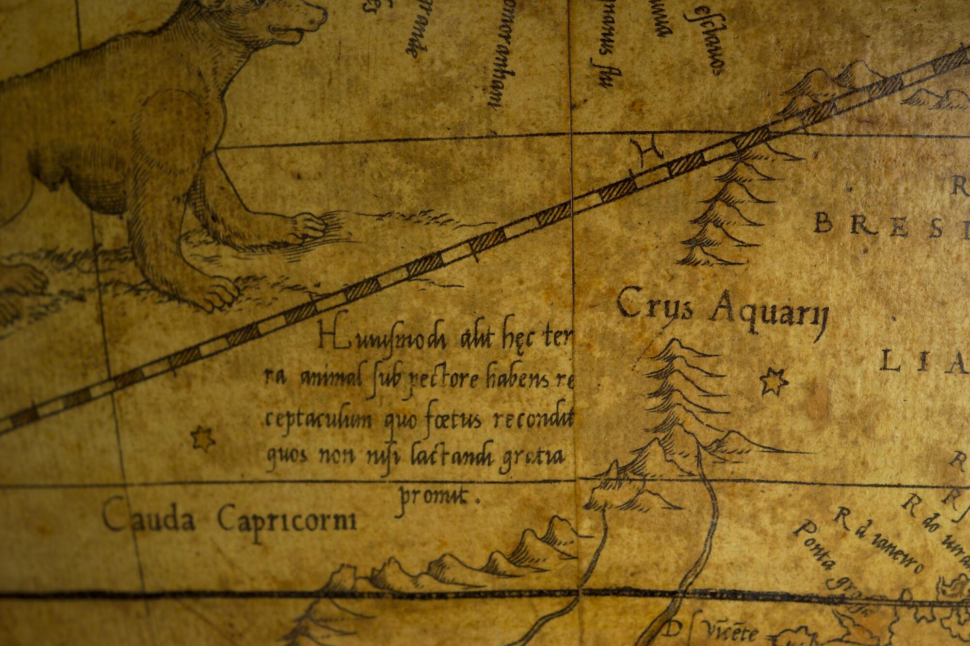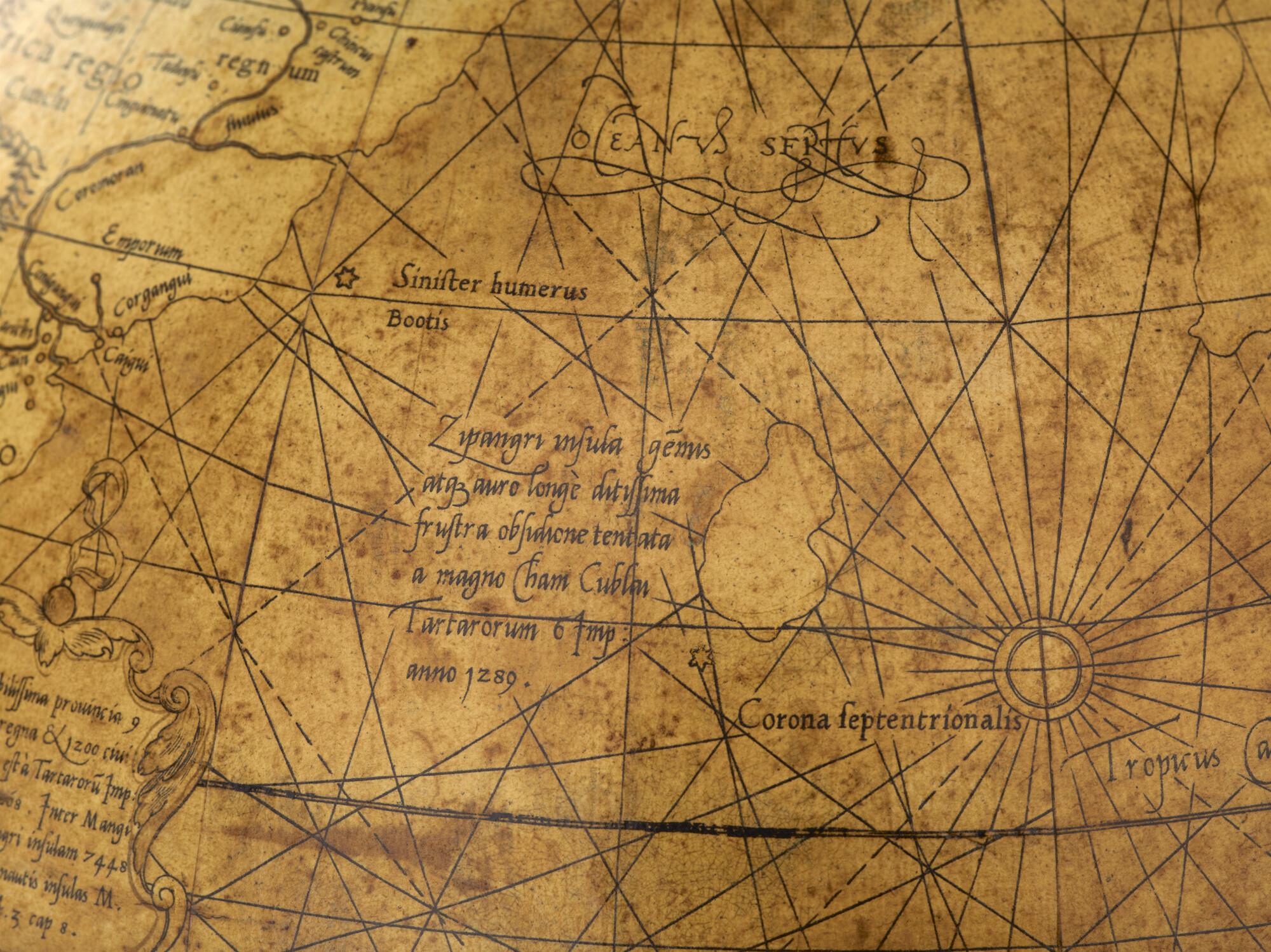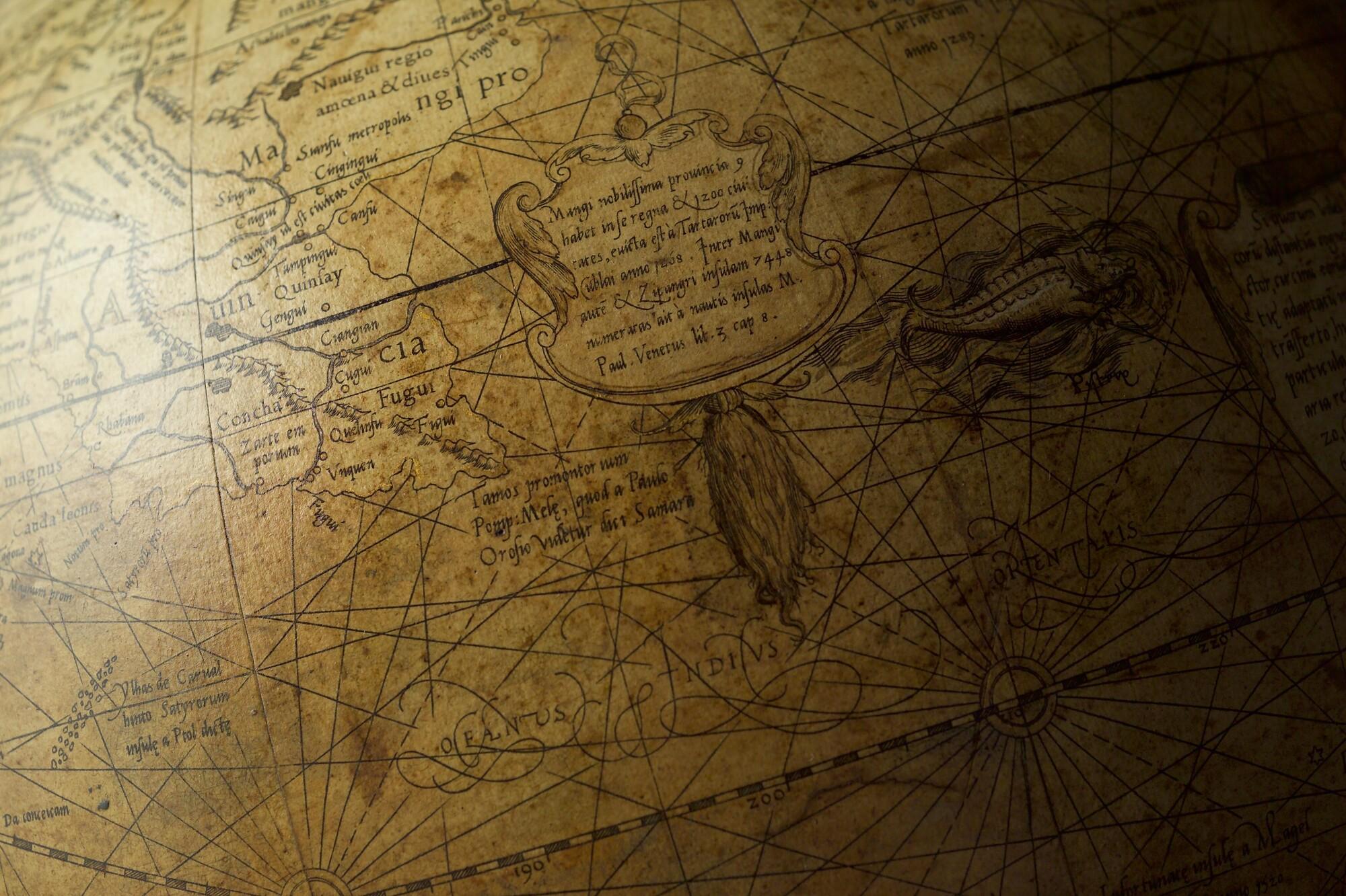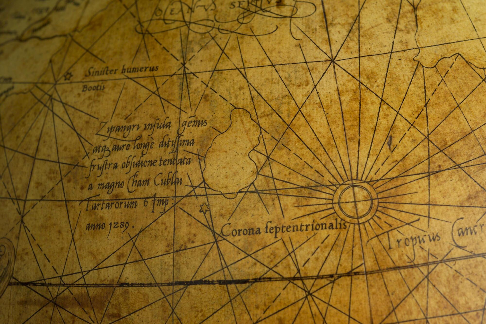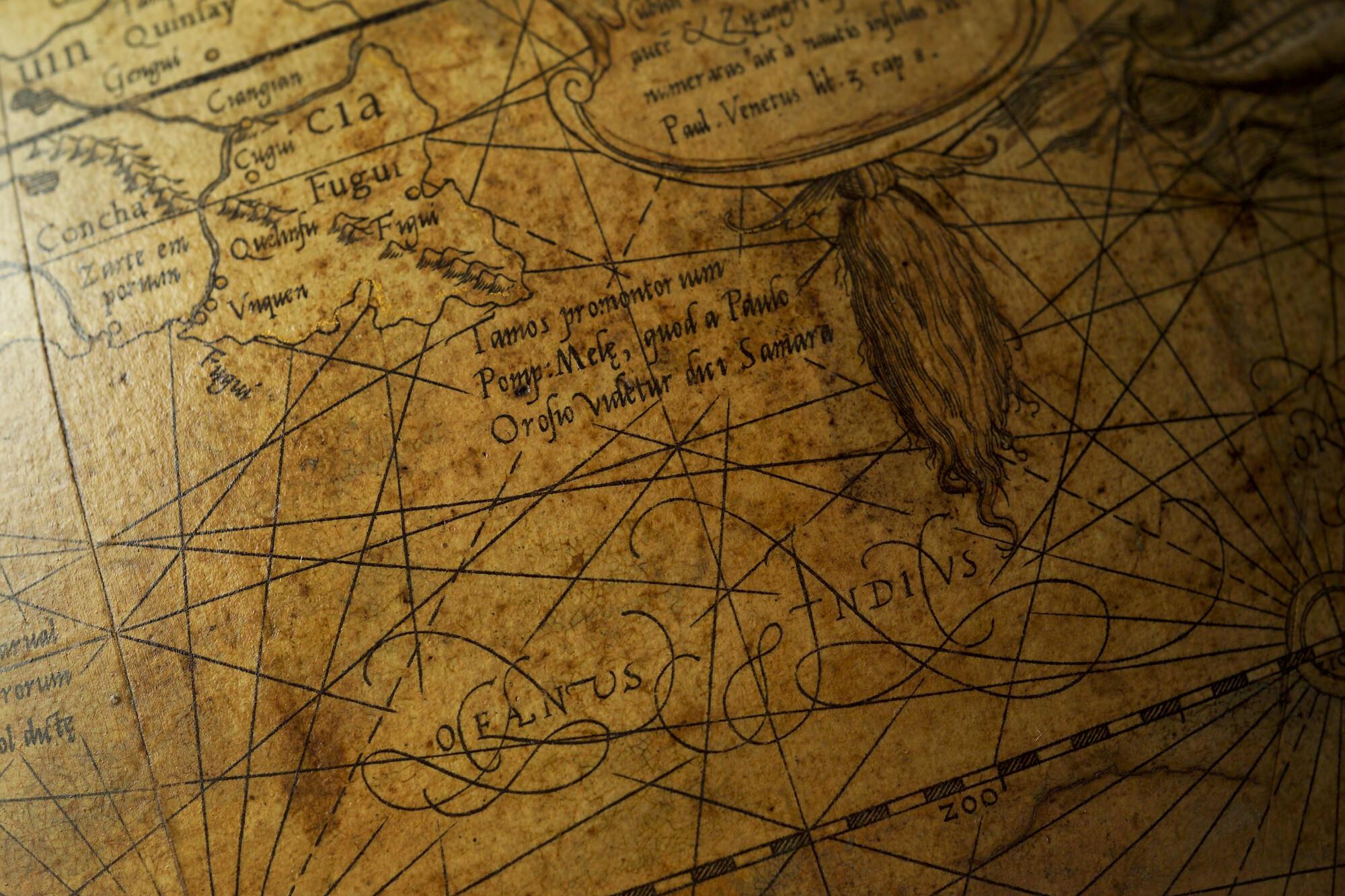 Aardglobe van 42 cm. in doorsnede door Gerard Mercator, 1541. Waarschijnlijk een facsimile uit 1875 gemaakt met behulp van de in dat jaar gepubliceerde globesegmenten op ware grootte. De oorspronkelijke globe is opgedragen aan Nicolas Perrenot de Granvelle, bisschop van Attrecht (schaal 1:30.500.000).