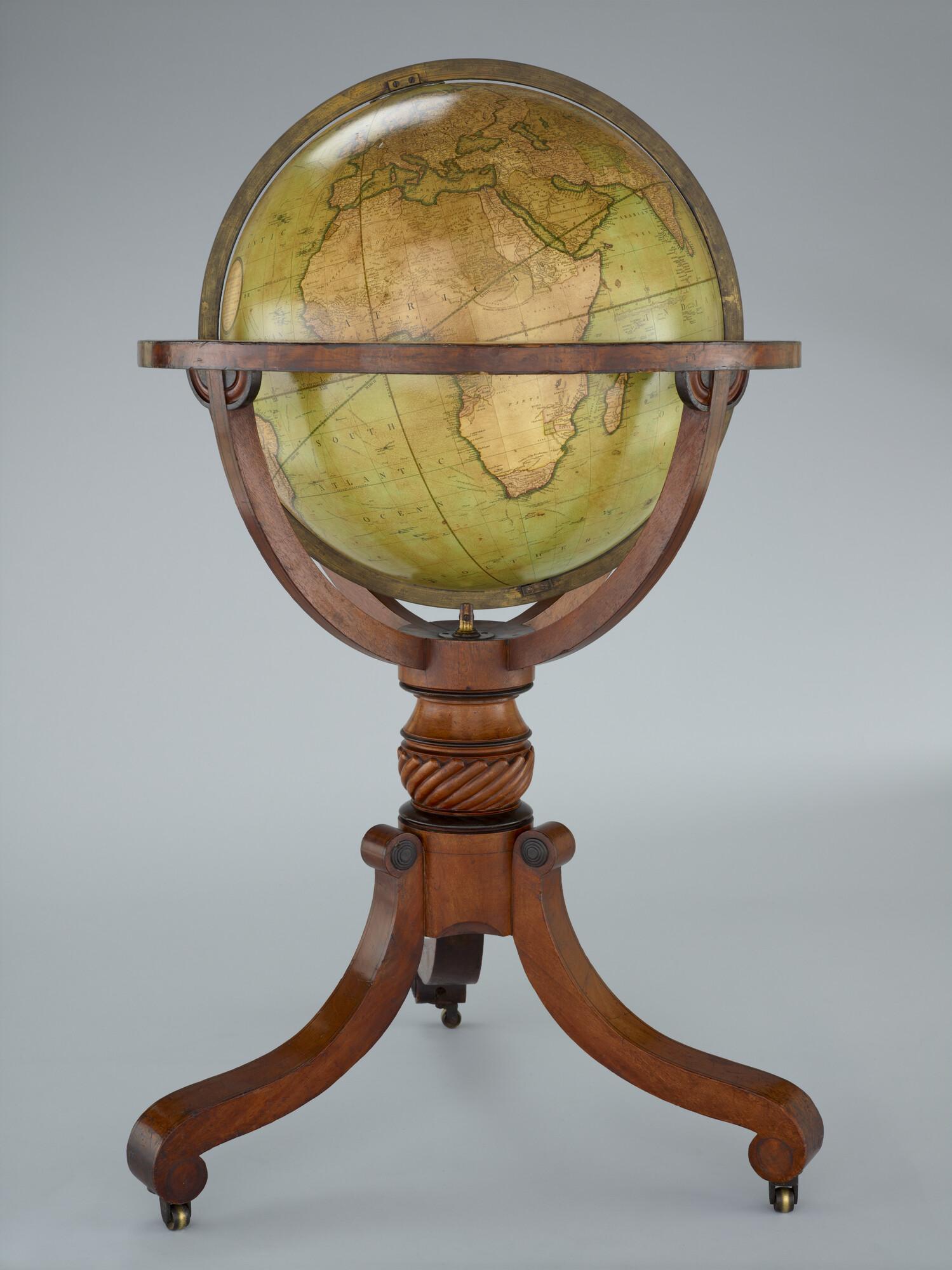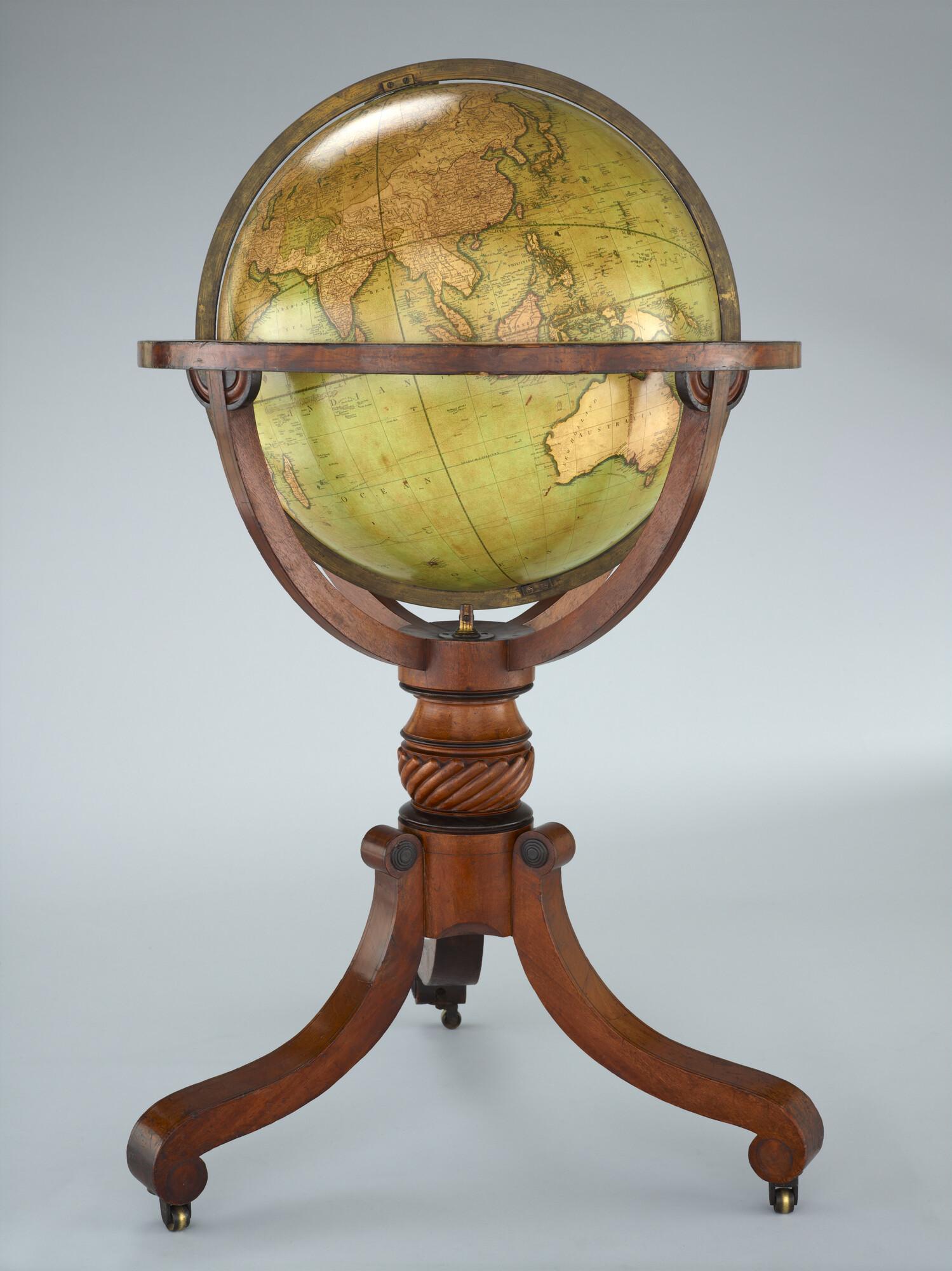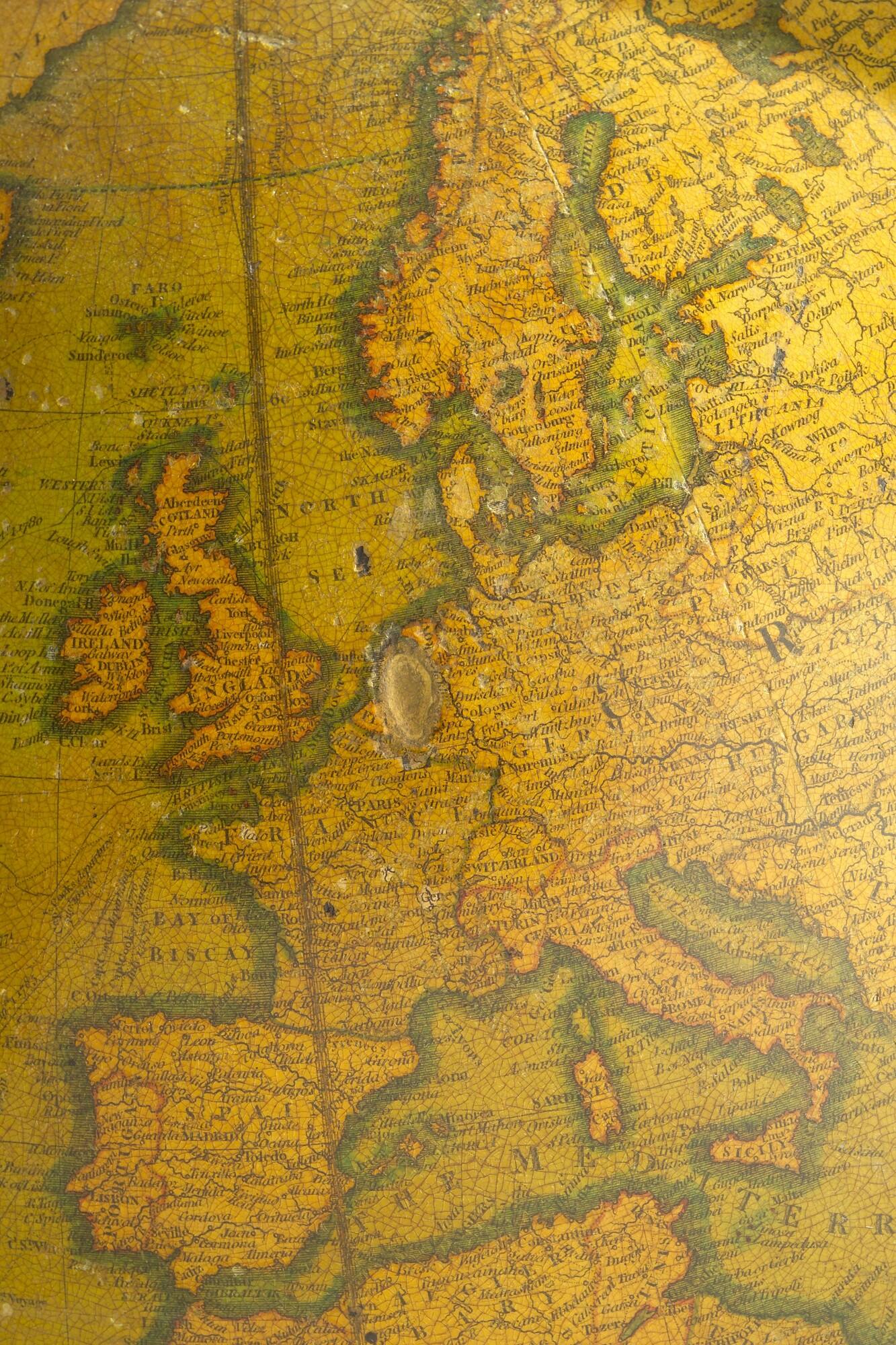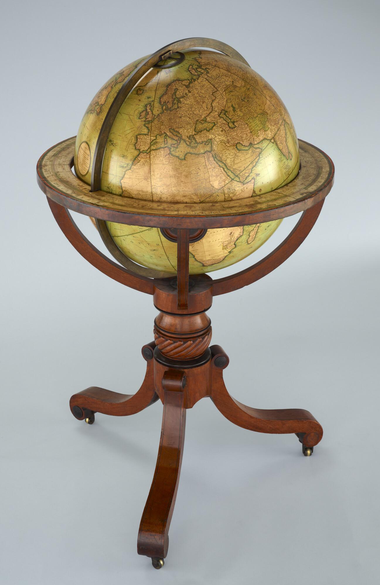 Aardglobe van 53,5 cm. in doorsnede door John en William Cary, 1815, in de verbeterde uitgave van 1819. Nederland is zo vaak aangewezen dat er een gat in het papier is ontstaan. De globestoel is voor een typsiche Engelse 'Library Globe"(schaal 1:24.000.000).