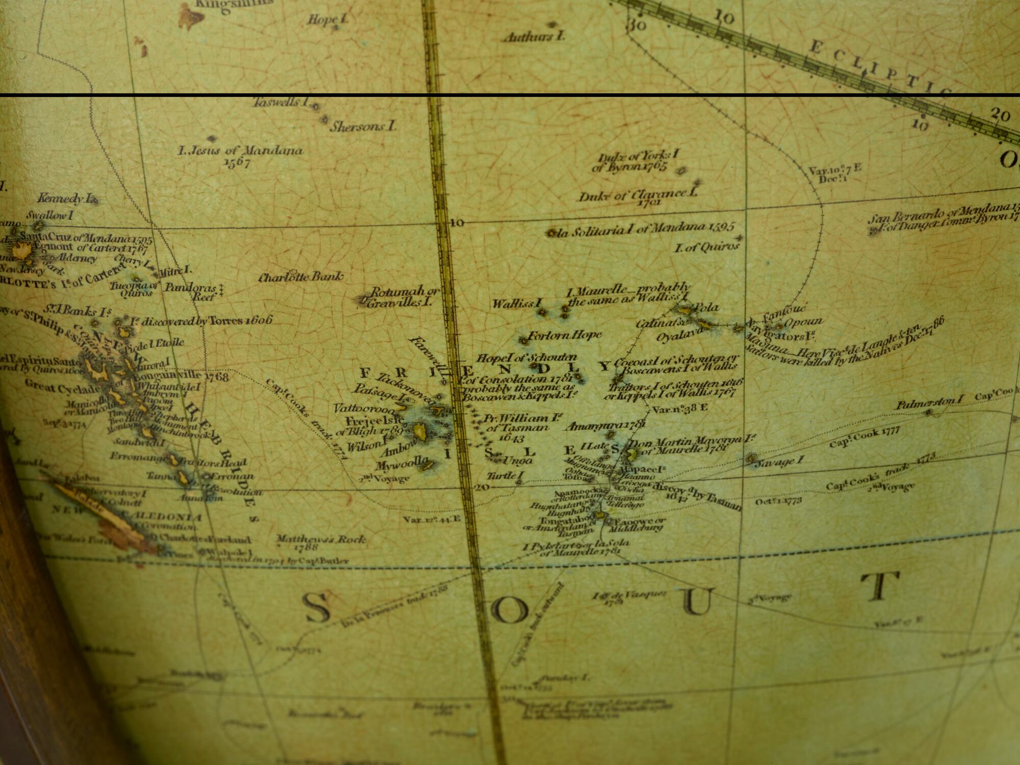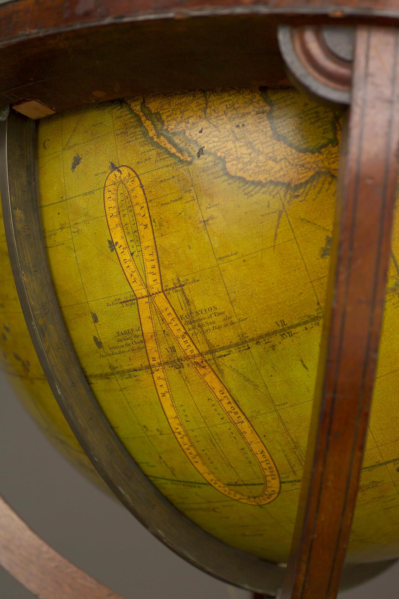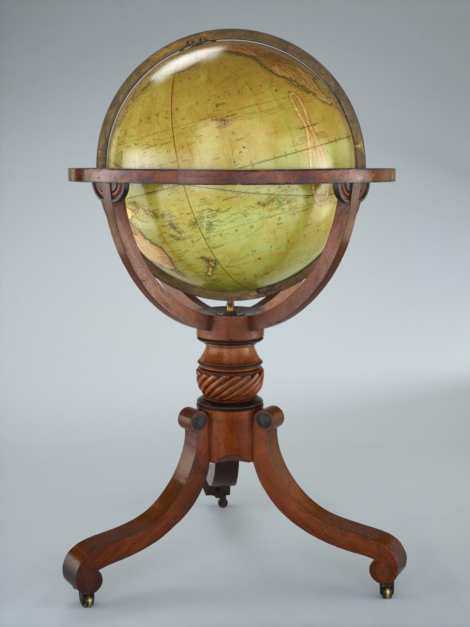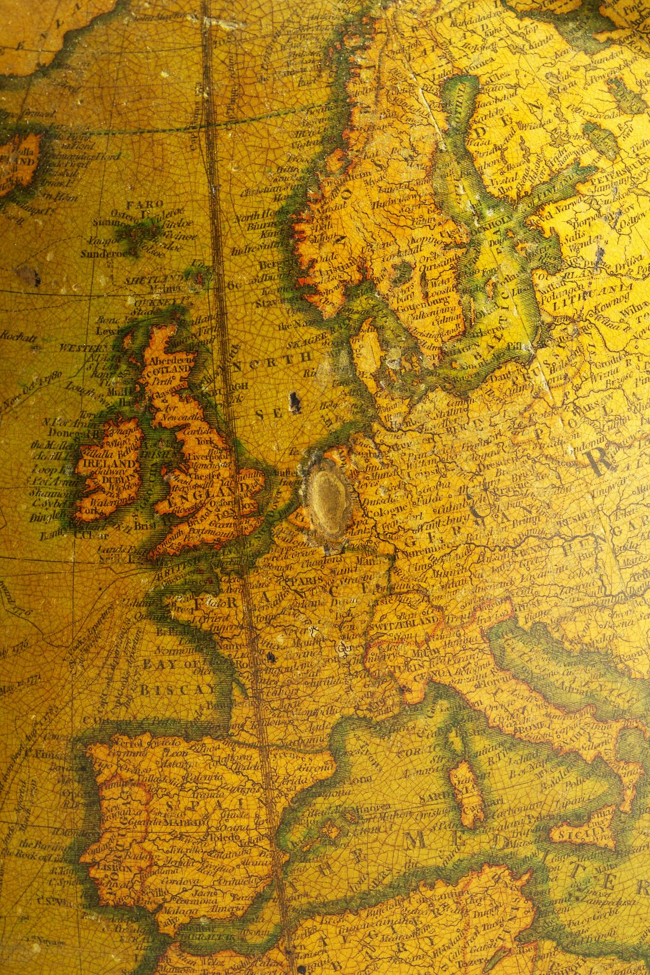 Aardglobe van 53,5 cm. in doorsnede door John en William Cary, 1815, in de verbeterde uitgave van 1819. Nederland is zo vaak aangewezen dat er een gat in het papier is ontstaan. De globestoel is voor een typsiche Engelse 'Library Globe"(schaal 1:24.000.000).