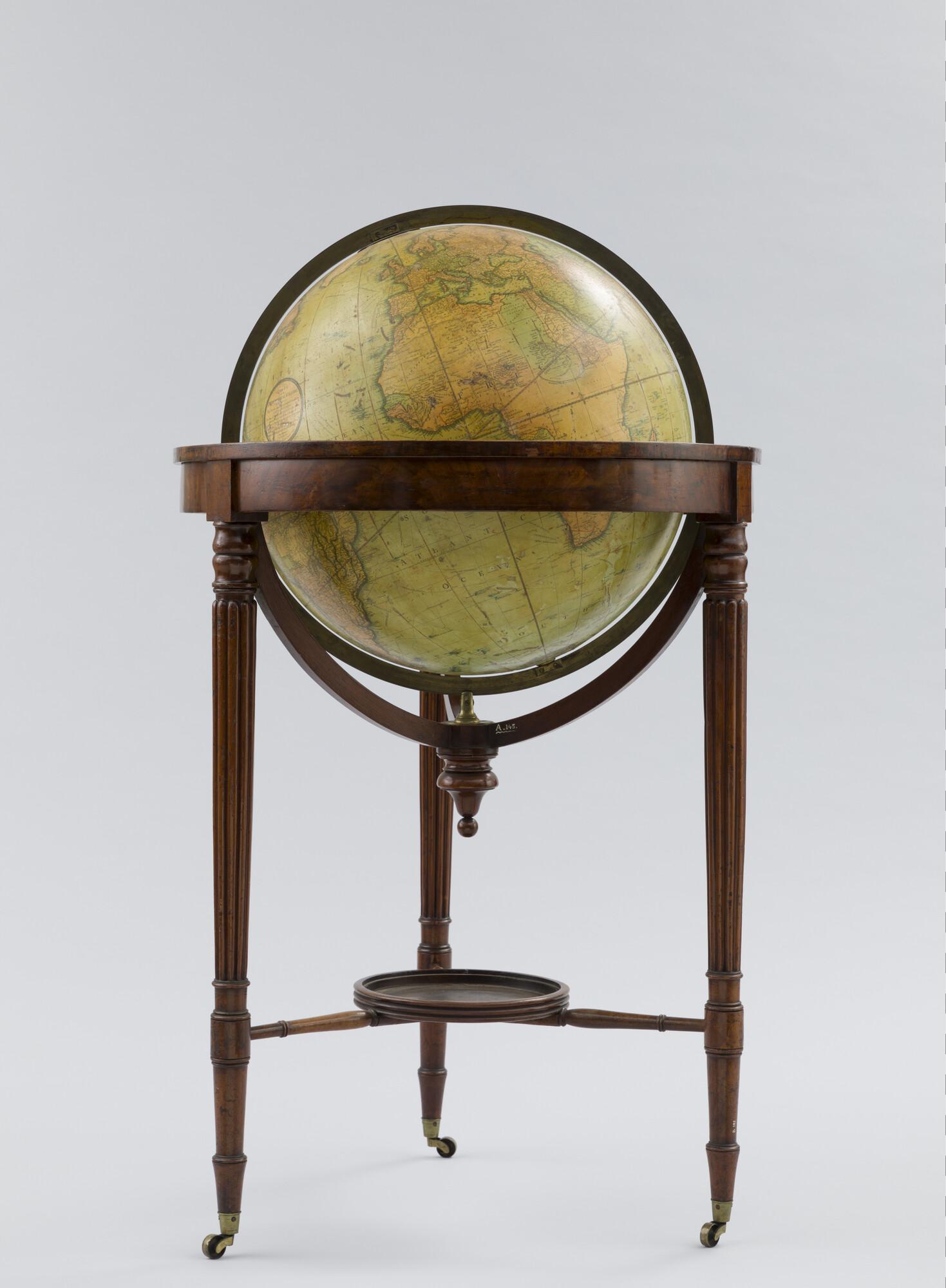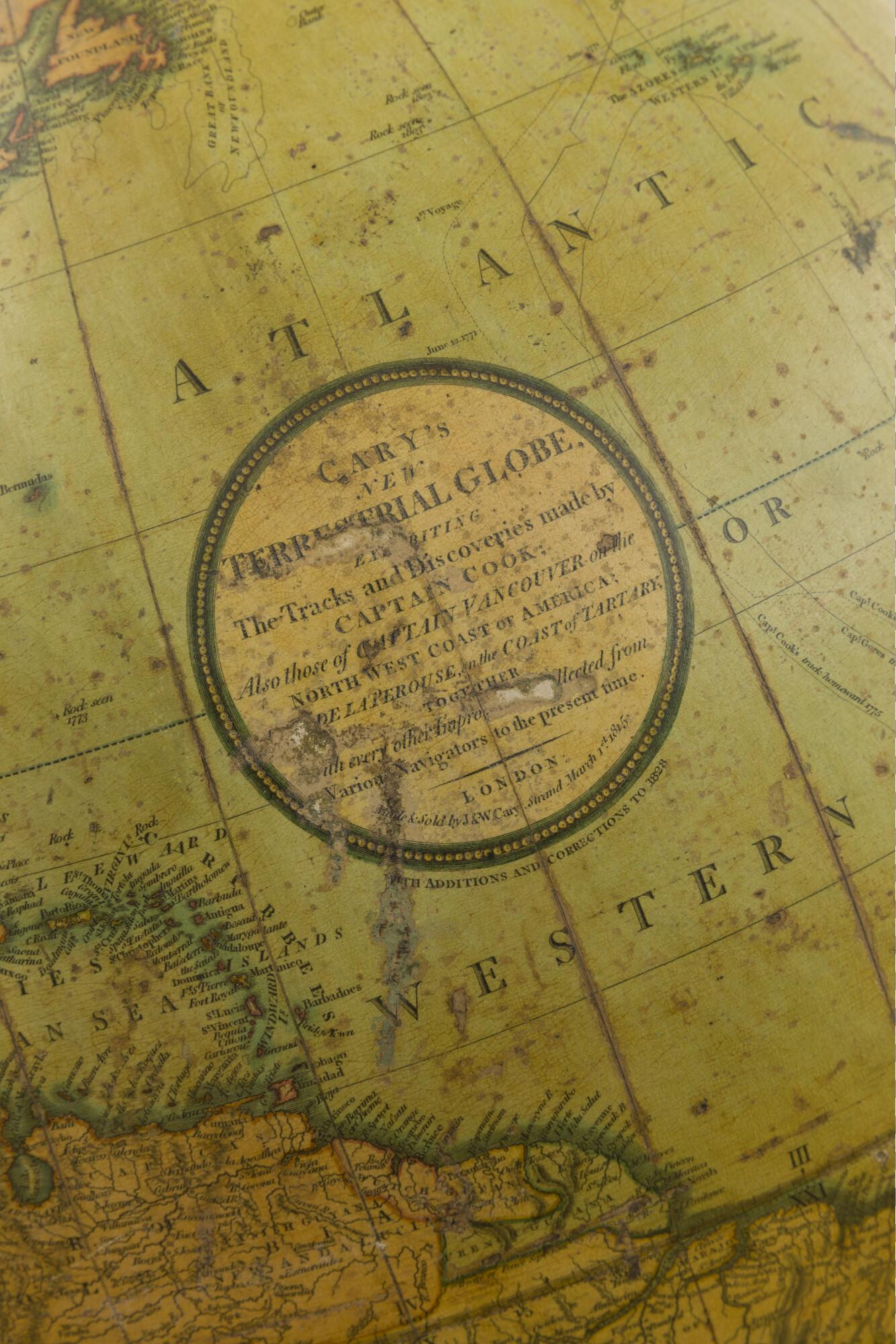 Aardglobe van 53,5 cm. in doorsnede John en William Cary, 1815, in de verbeterde uitgave van 1828 (schaal 1:24.000.000).